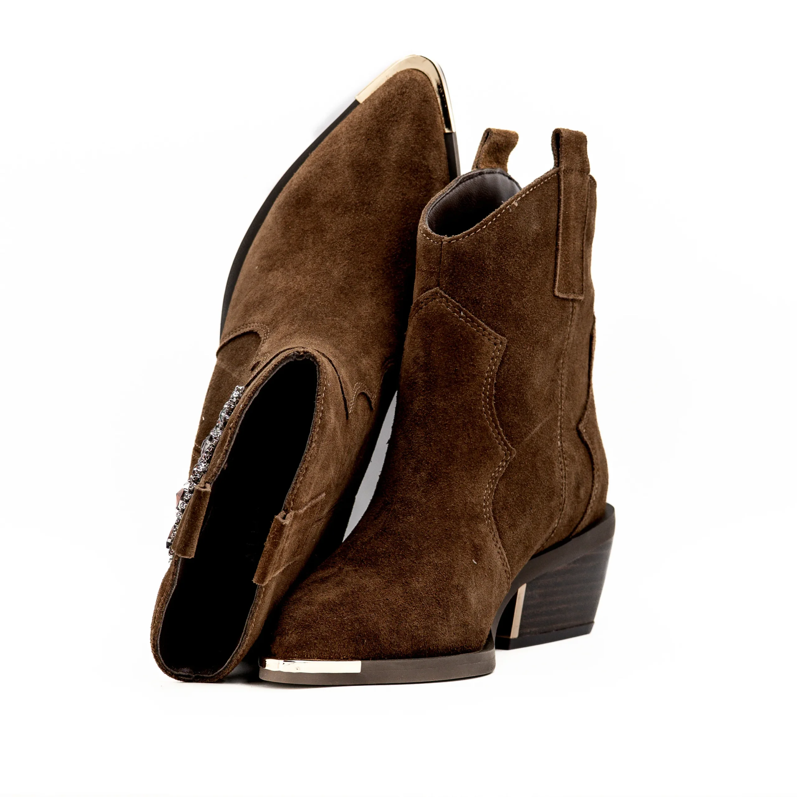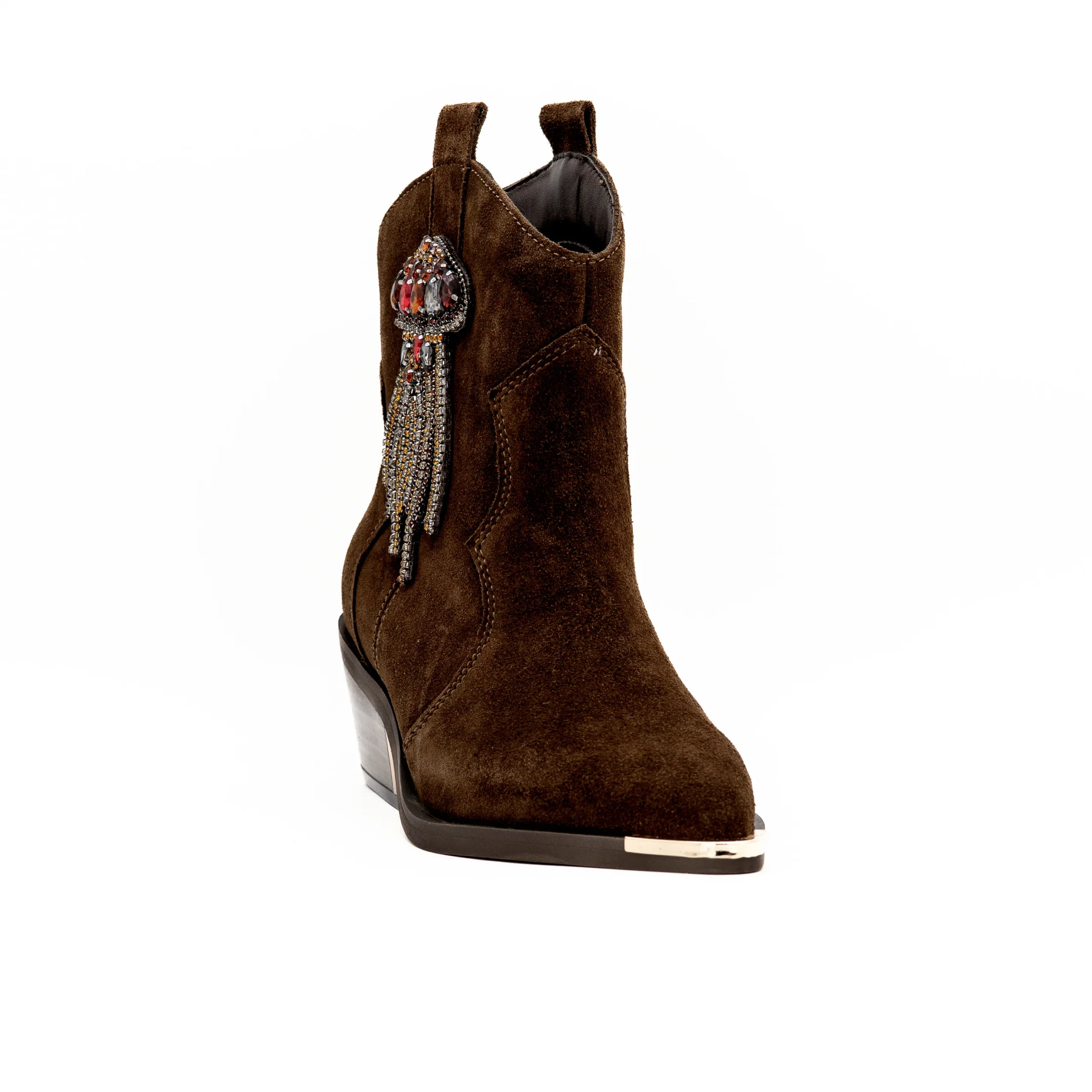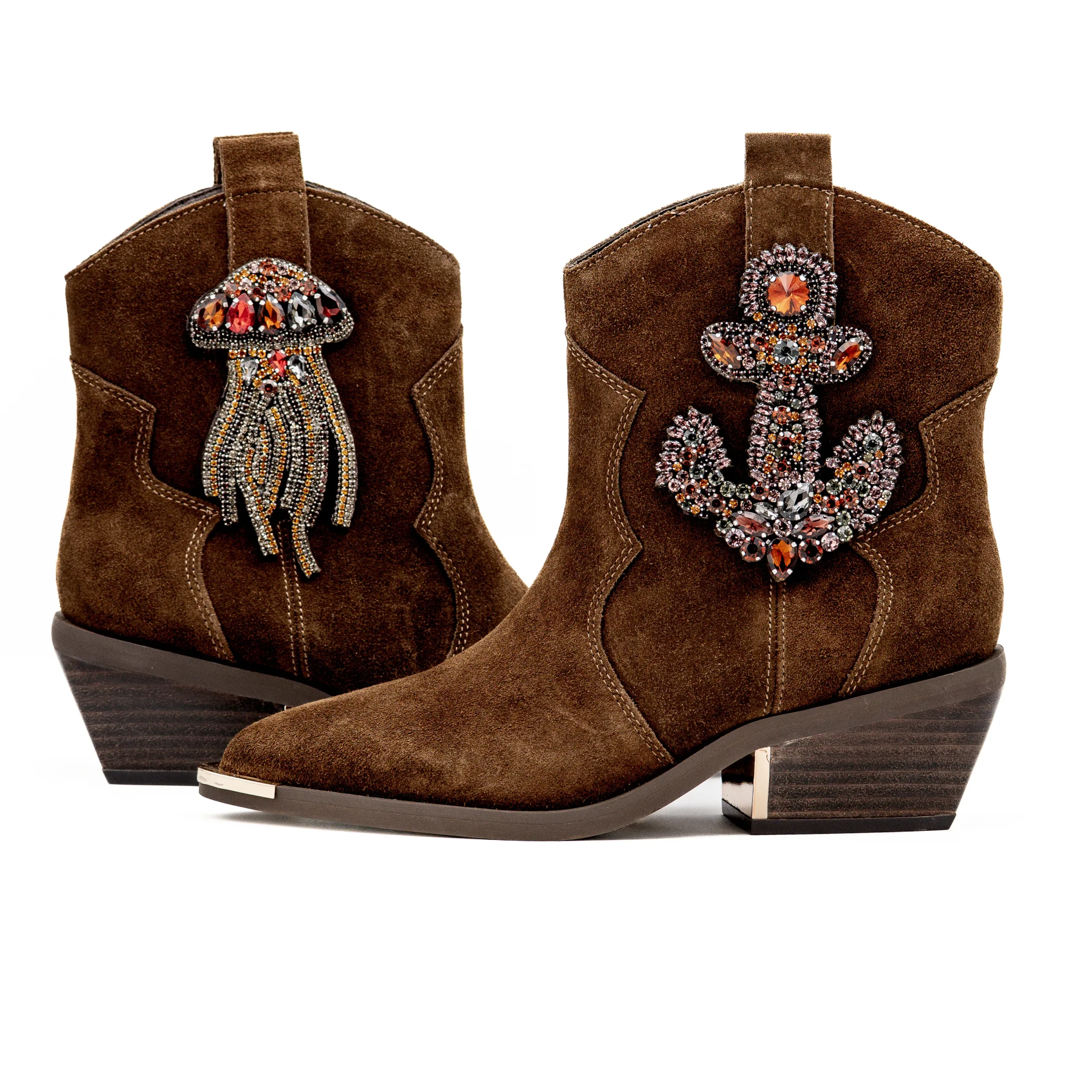 Com um design irresistível em camurça castanha e aplicações deslumbrantes, esta criação da Alma en Pena une charme e elegância contemporânea.