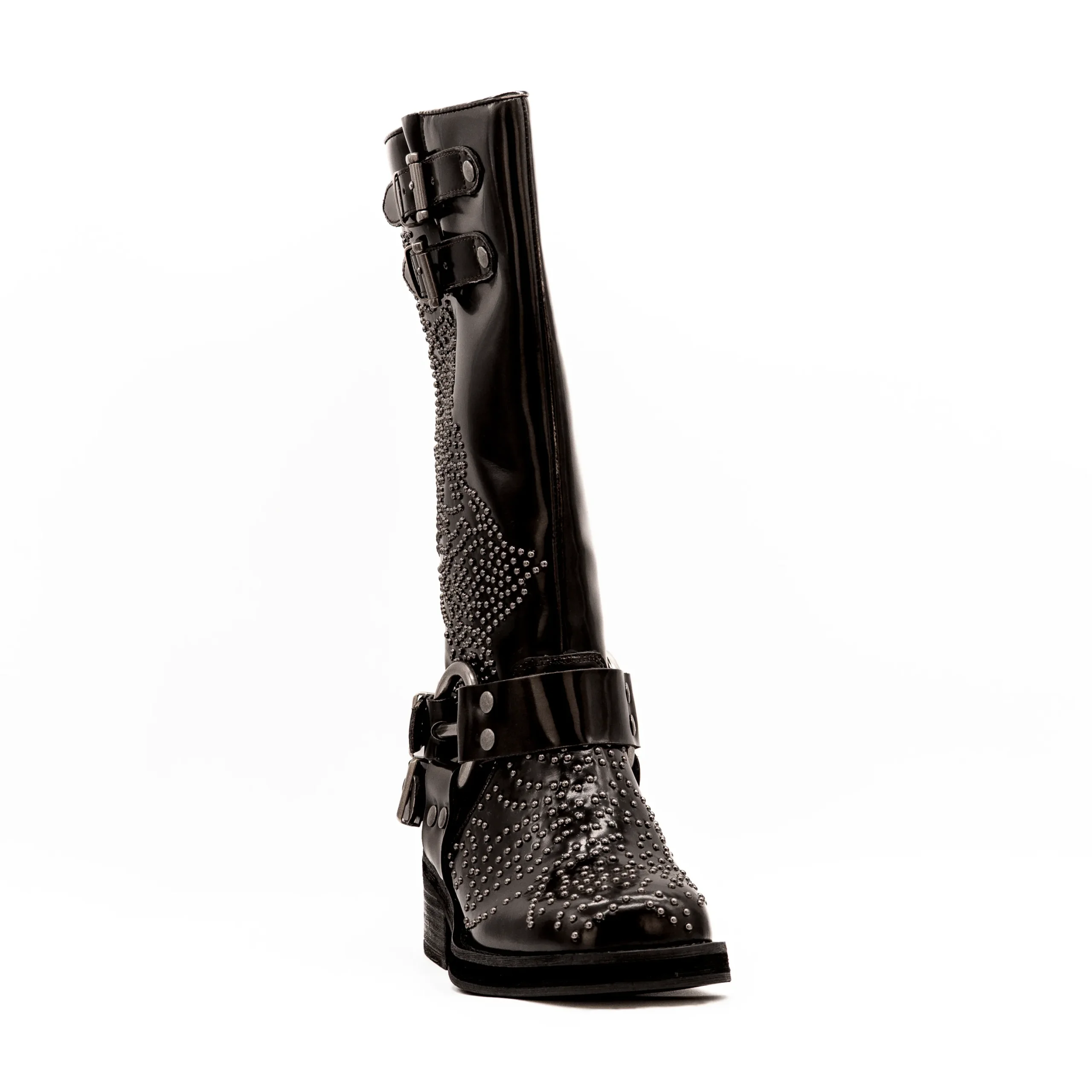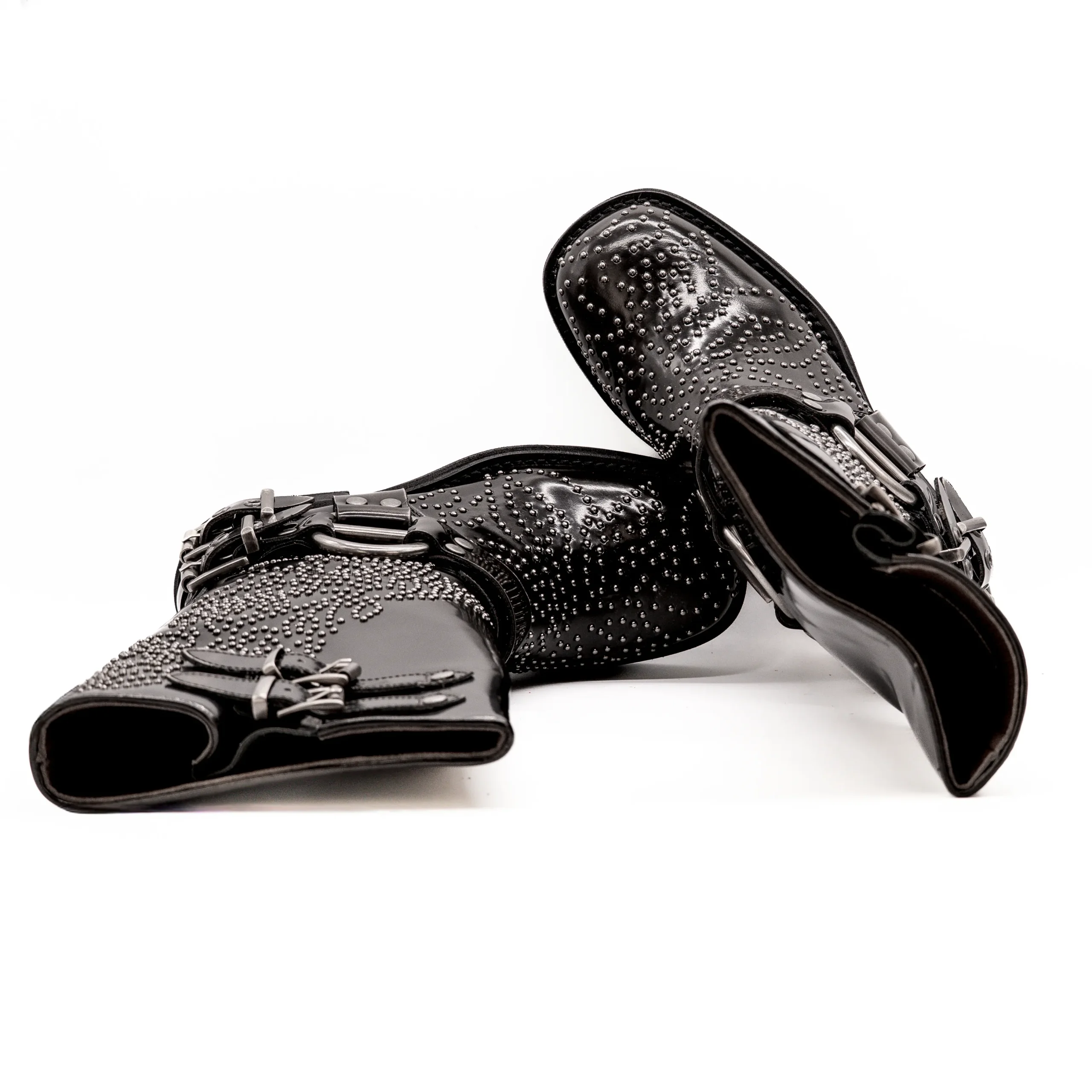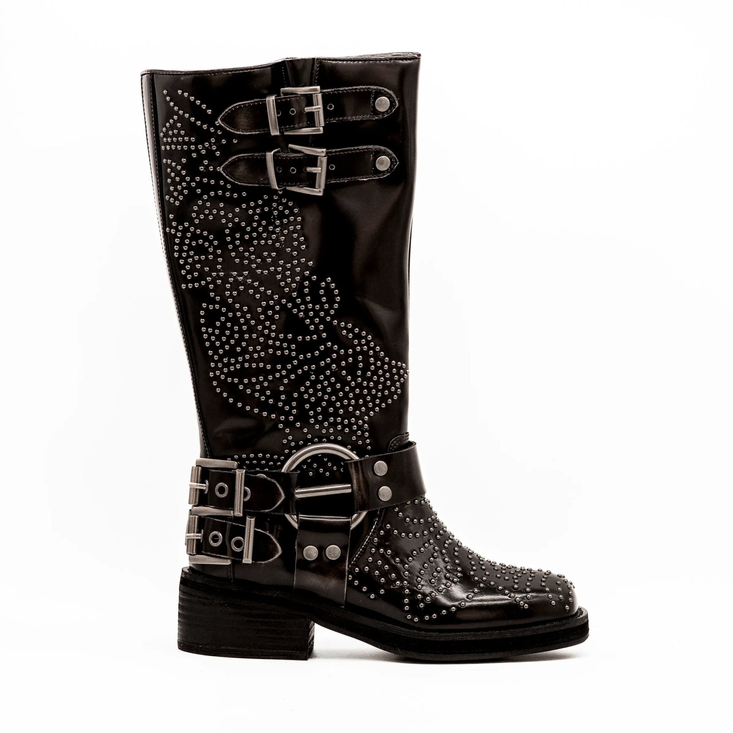 As tachas prateadas desenham padrões únicos sobre a base preta, enquanto que as fivelas metálicas reforçam o seu caráter forte e irresistível.