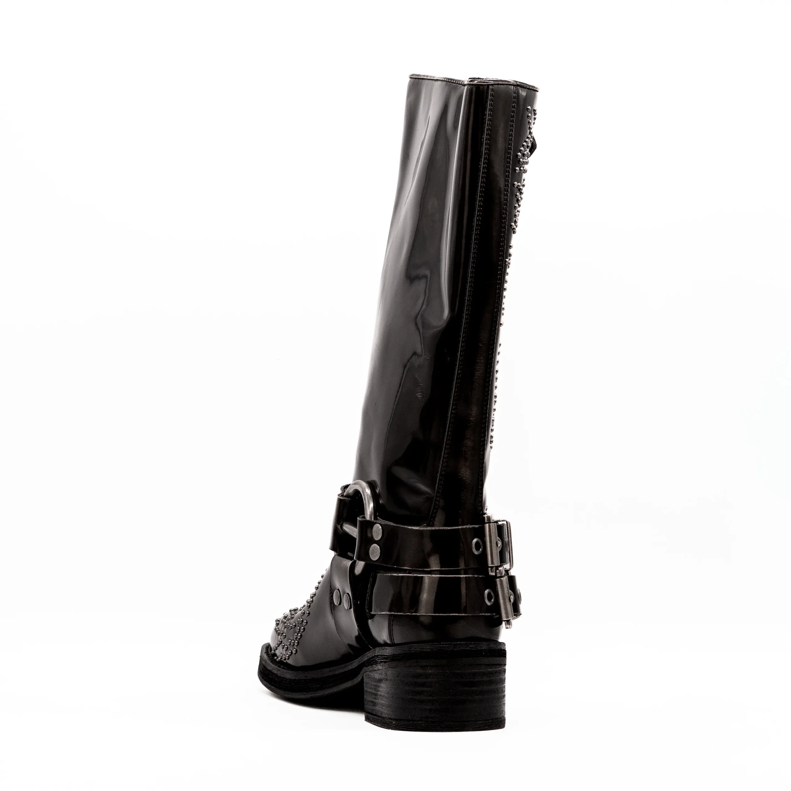 Preta com tachas e fivelas metálicas conferem atitude e elegância em cada detalhe.