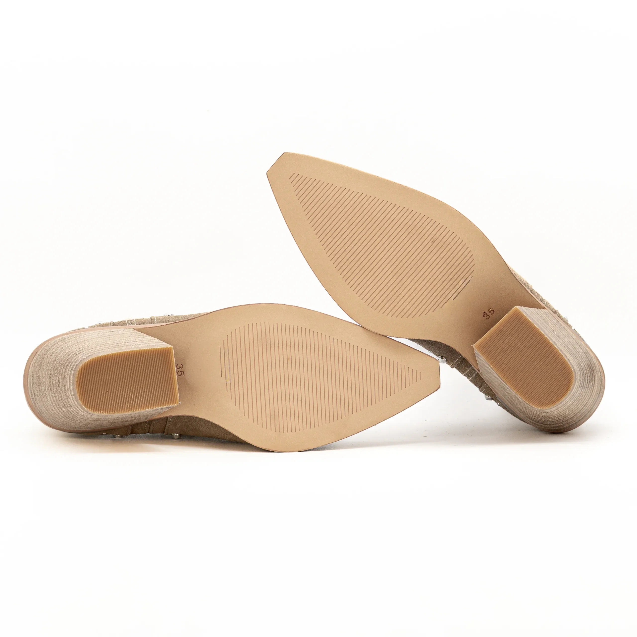 O design de biqueira fina e o salto largo em madeira conferem um toque contemporâneo, enquanto as aplicações adicionam brilho e personalidade a este modelo da Alma en Pena.