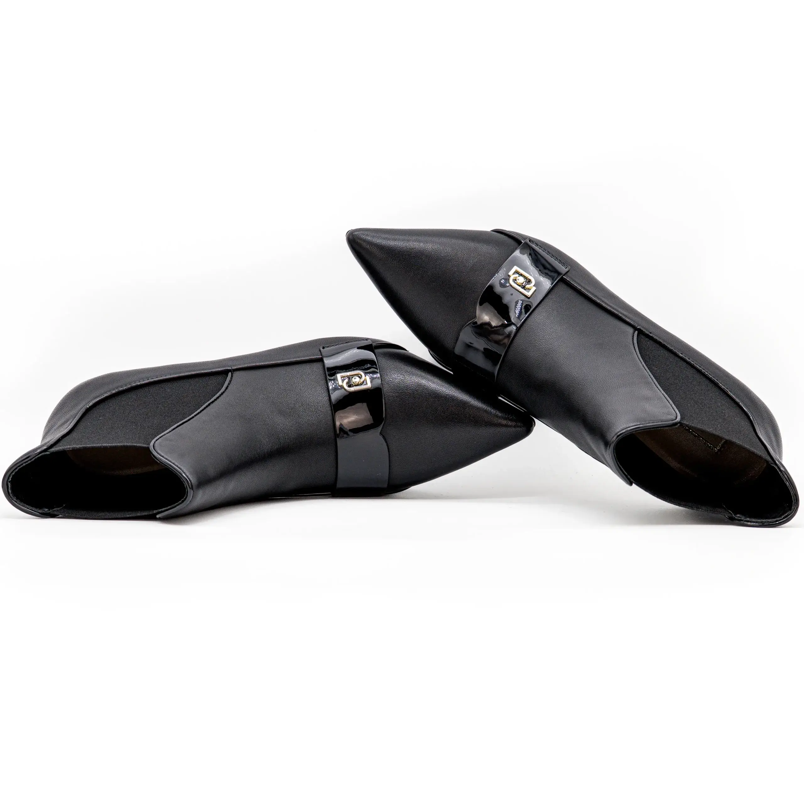 A biqueira fino cria uma linha elegante que valoriza o pé e alonga a perna.
