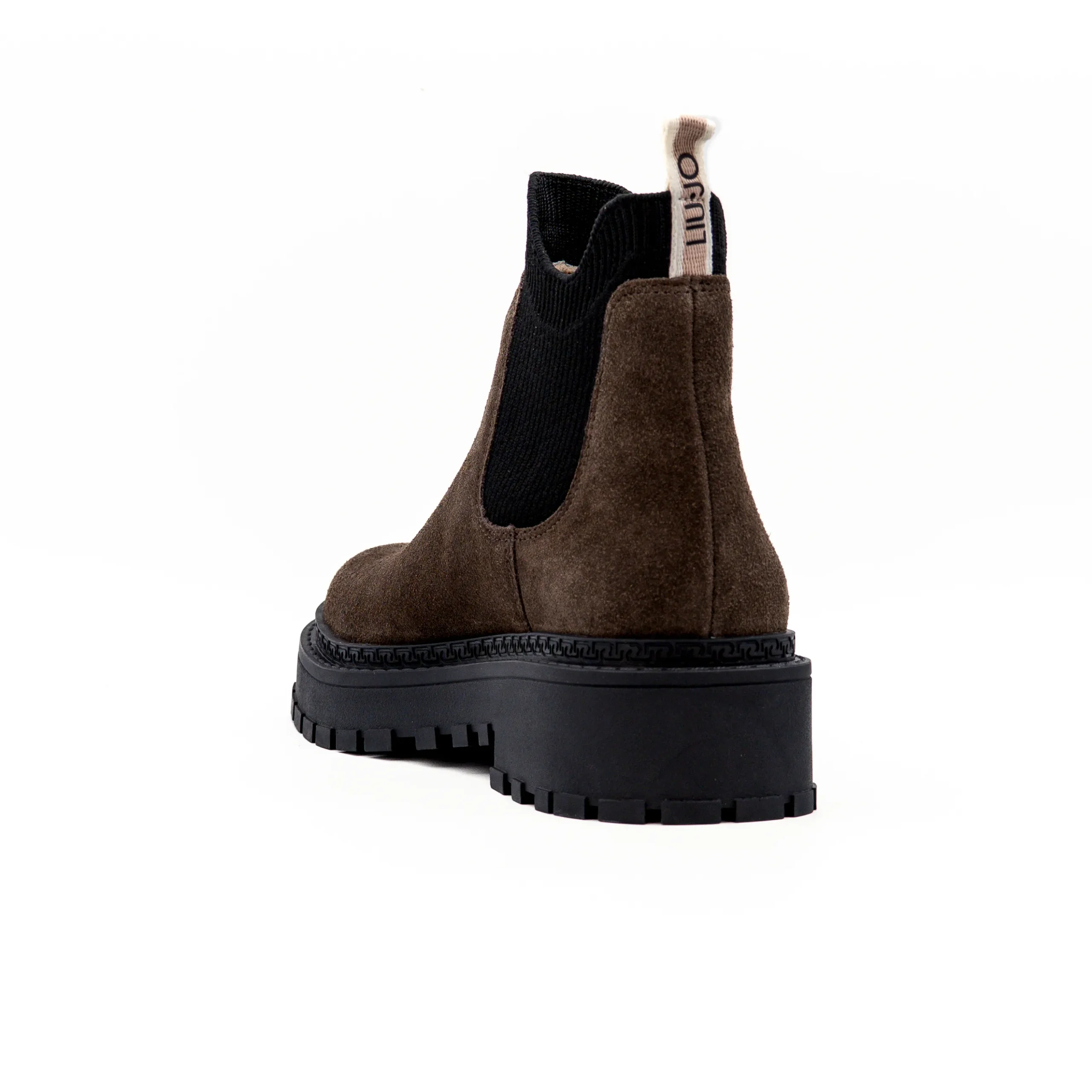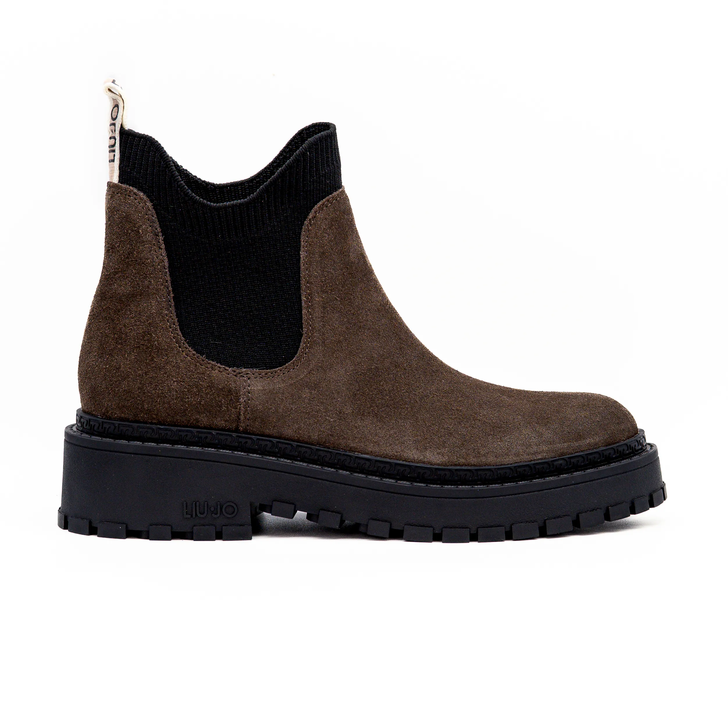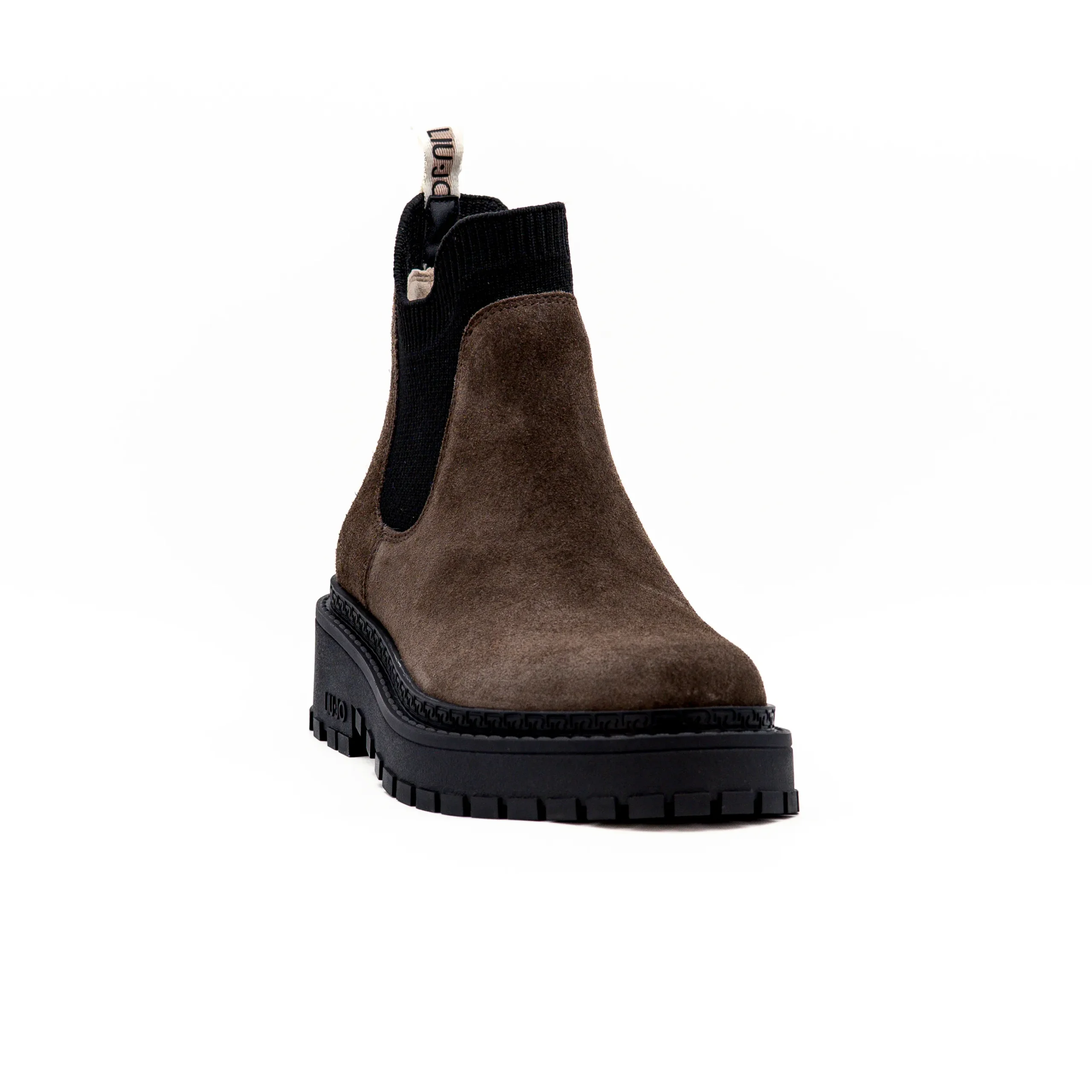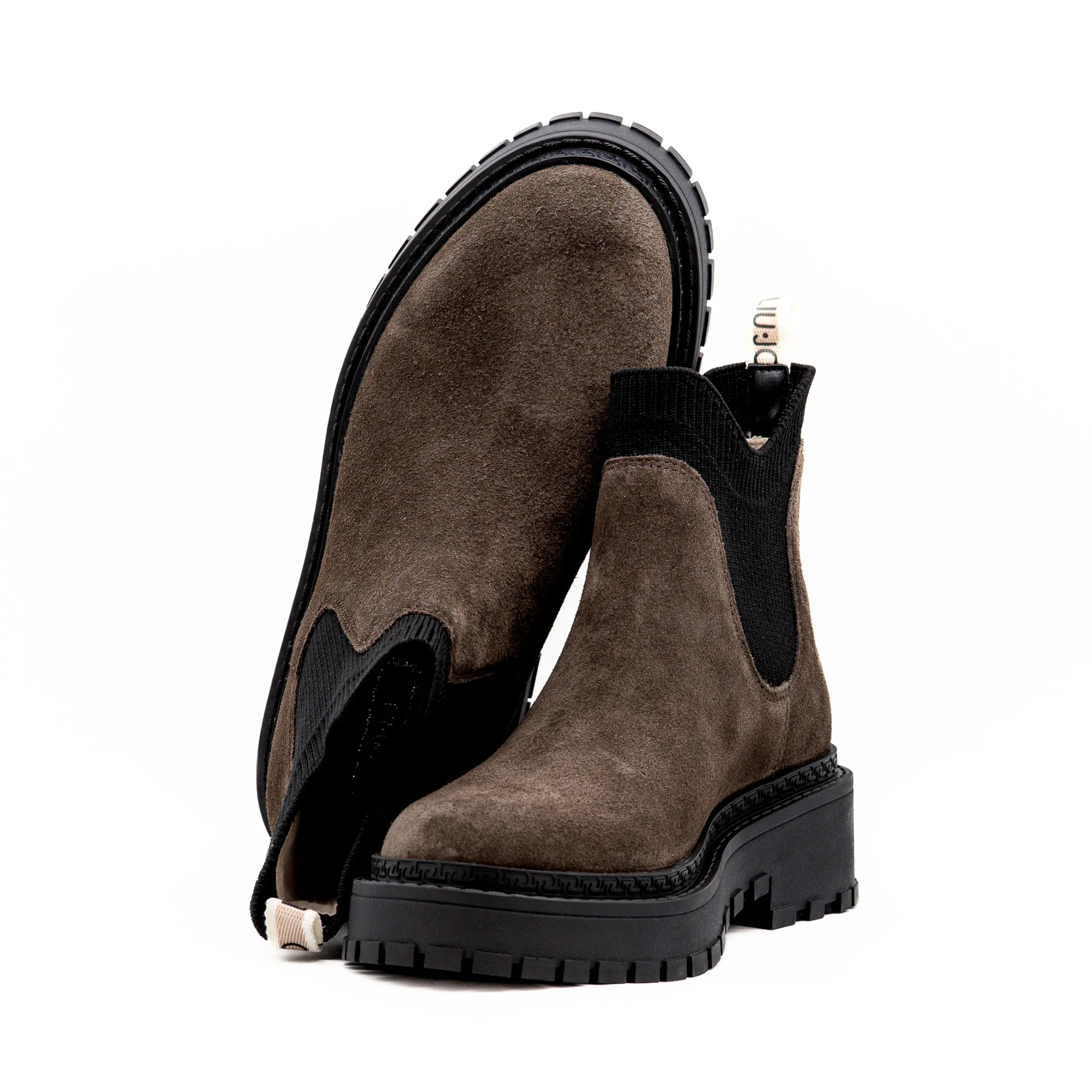 É uma bota feminina de base acastanhada com diversos detalhes em preto, desde a sola, ao reforço no topo do cano.
