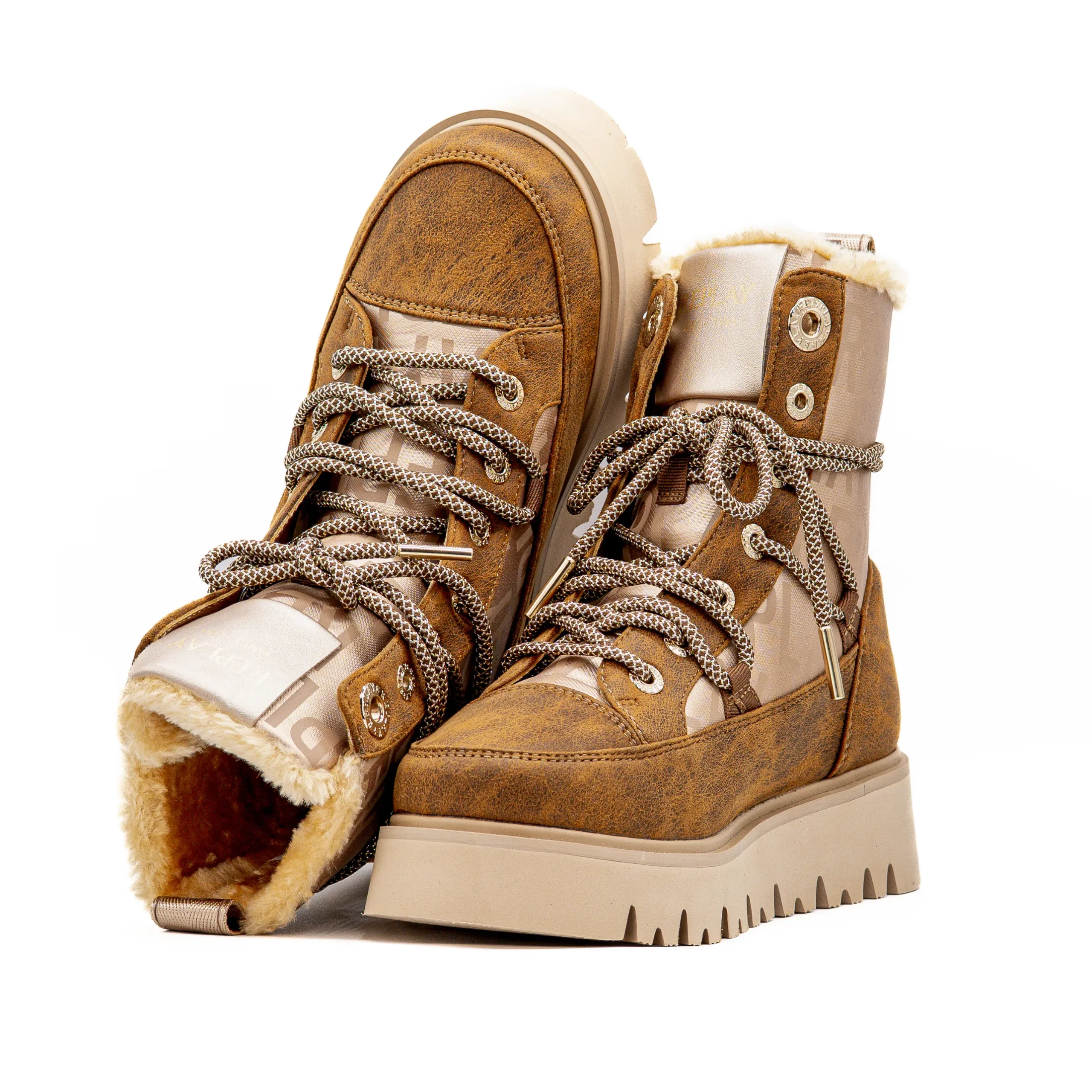 Os cordões cruzados e os detalhes em tons terrosos dão um toque moderno e trendy, tornando este modelo perfeito para looks casuais de inverno.