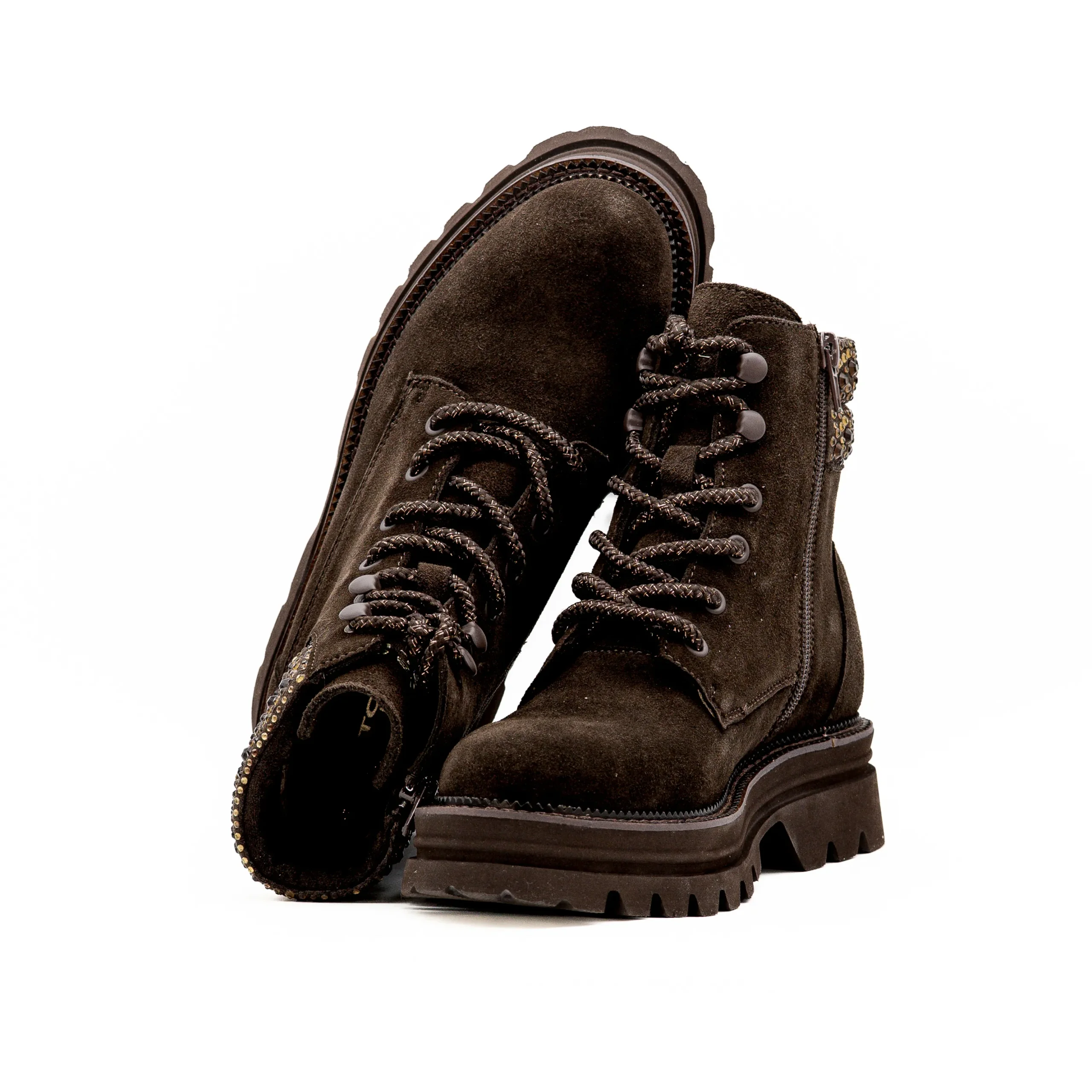 Inspirada no estilo montanha, mas com um toque de glamour urbano, esta bota em camurça castanha combina robustez e sofisticação.