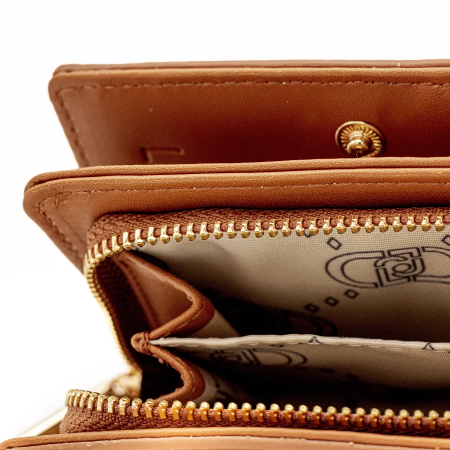 - Compartimento para moedas com fecho;