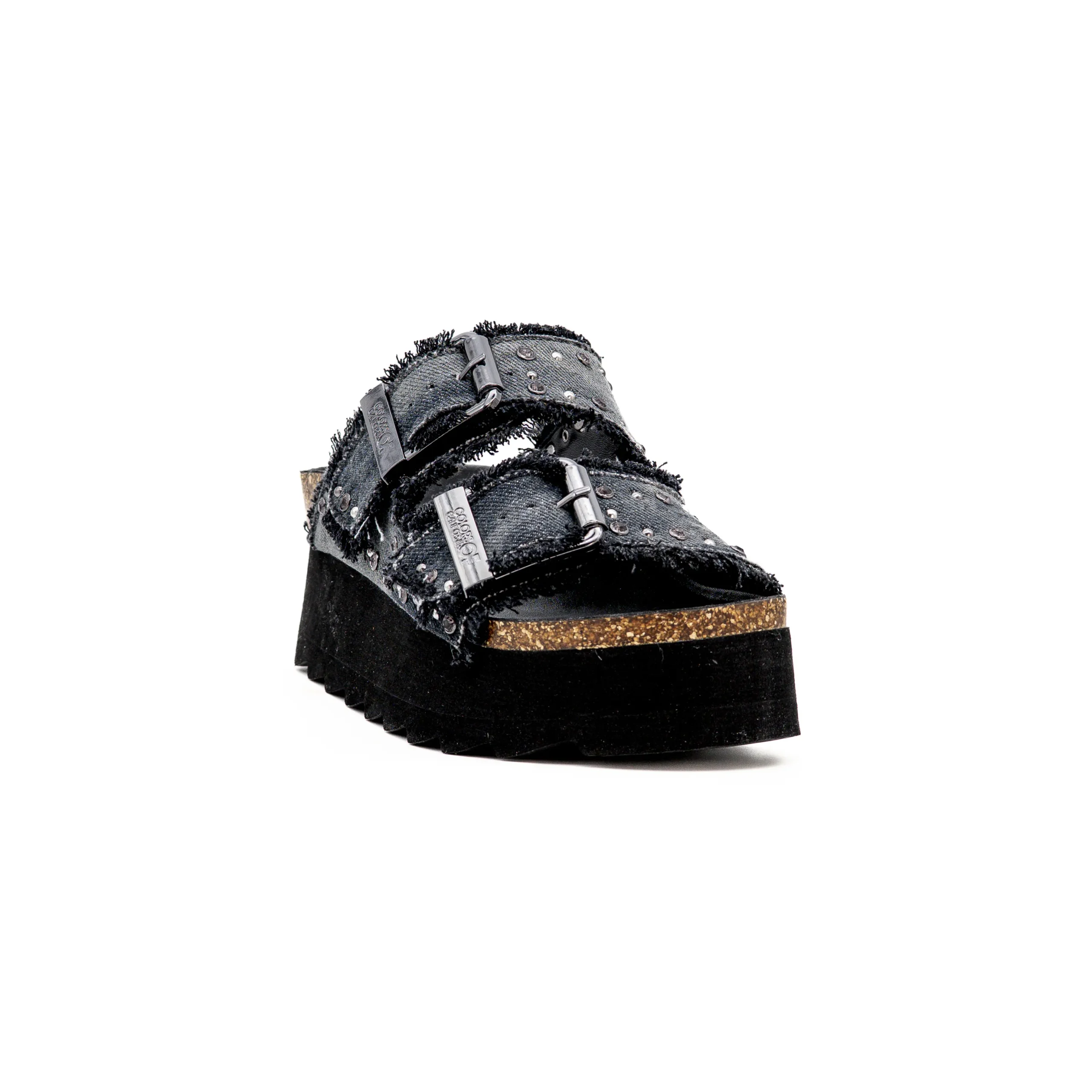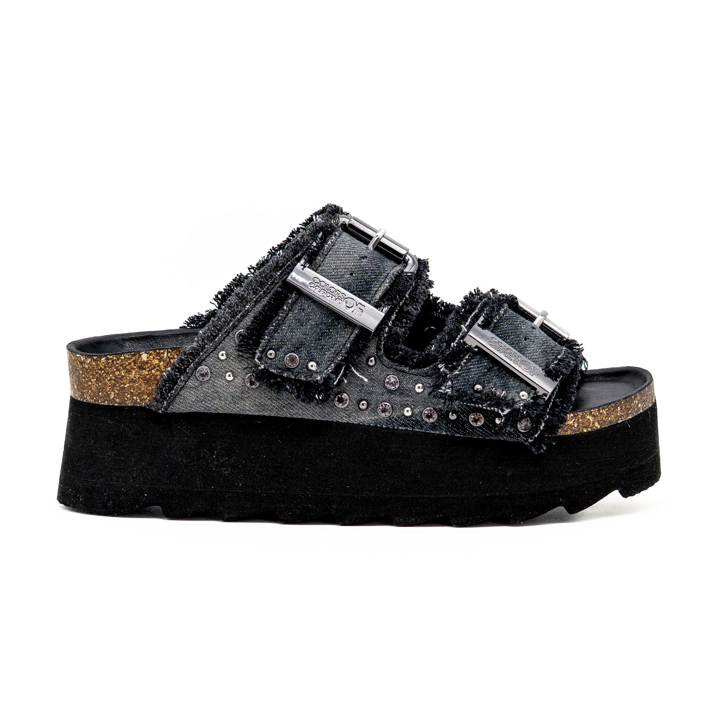 Em tons de preto e cinza, este modelo destaca-se pelo acabamento em ganga desfiada, aplicação de tachas metálicas e detalhes brilhantes que acrescentam um toque moderno.