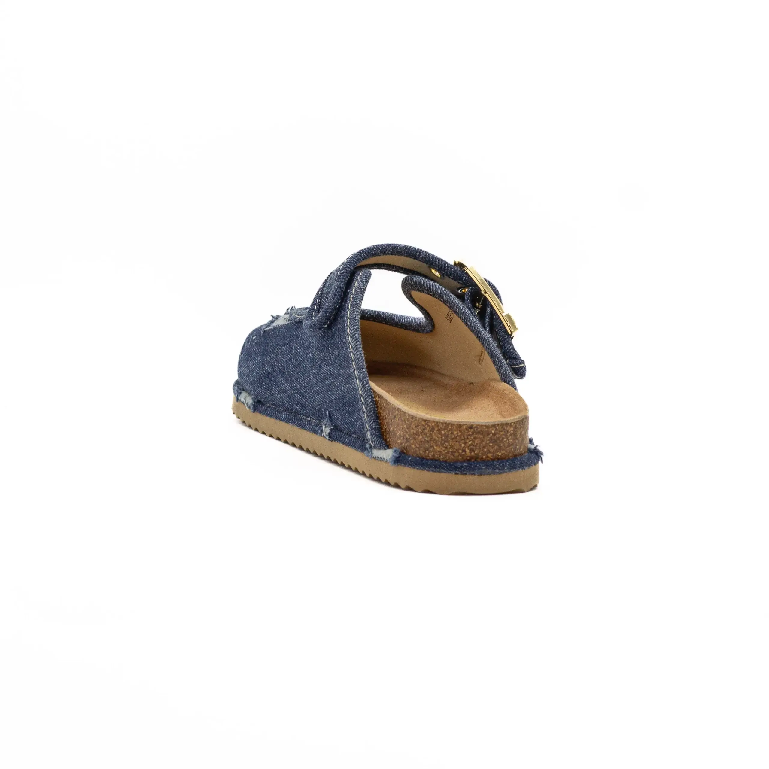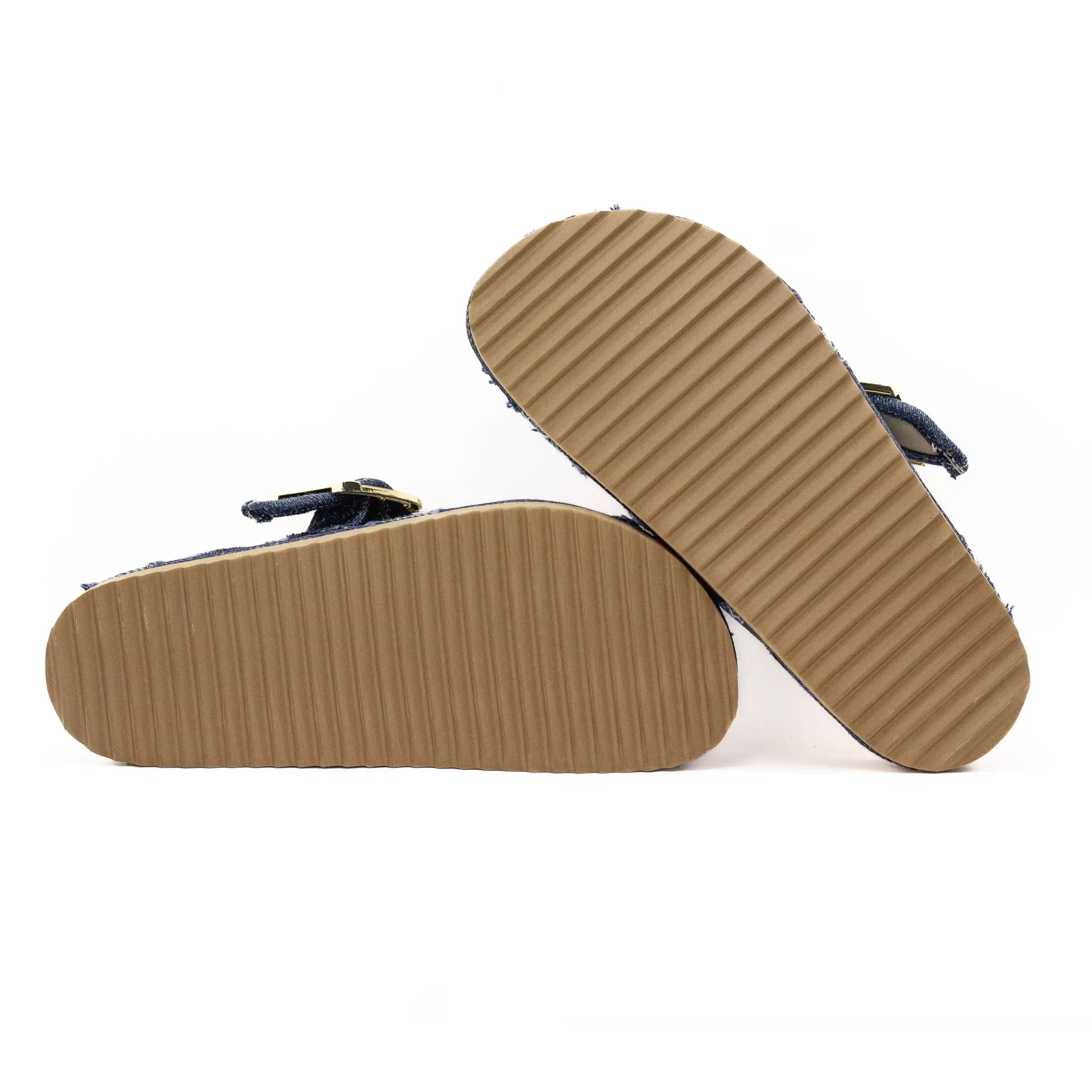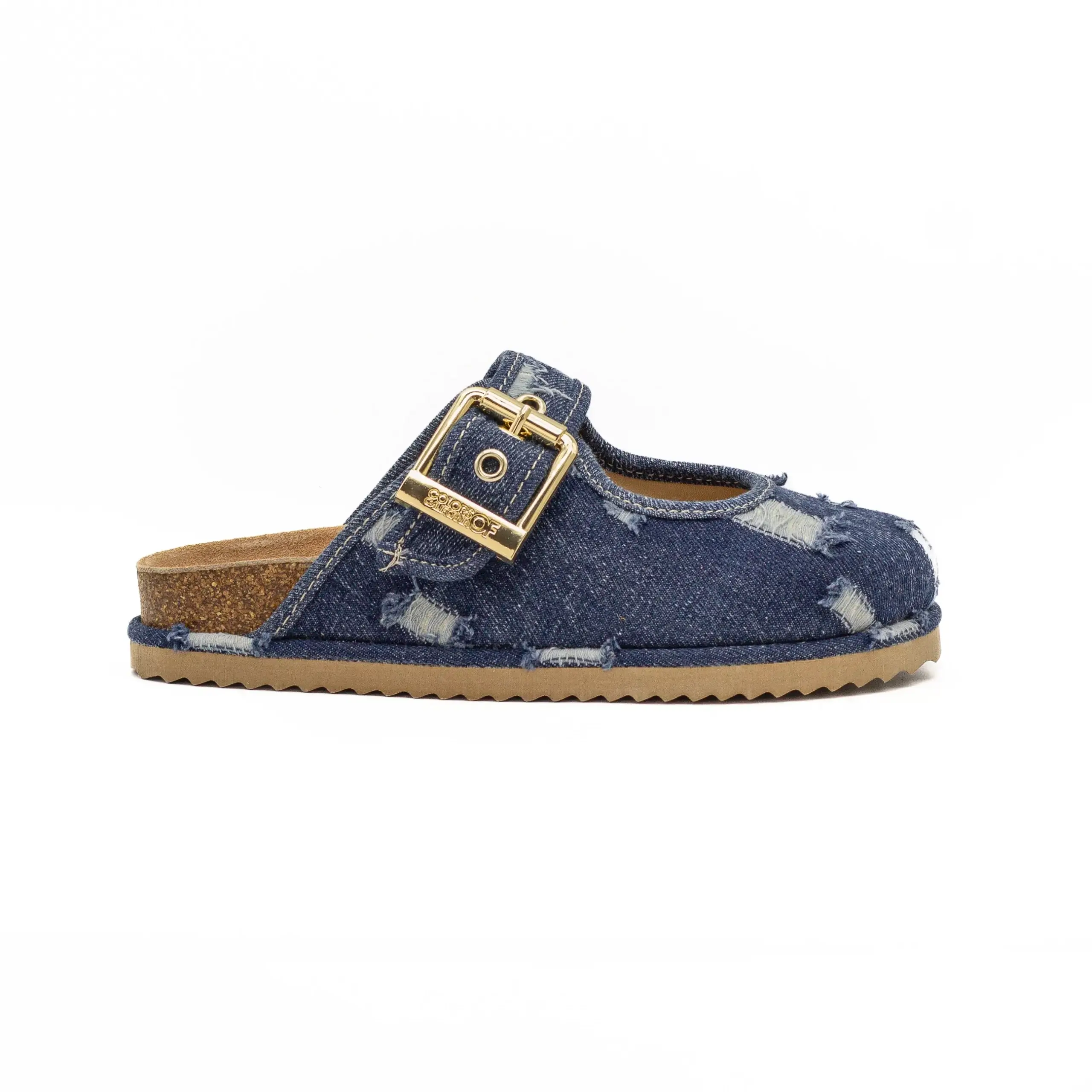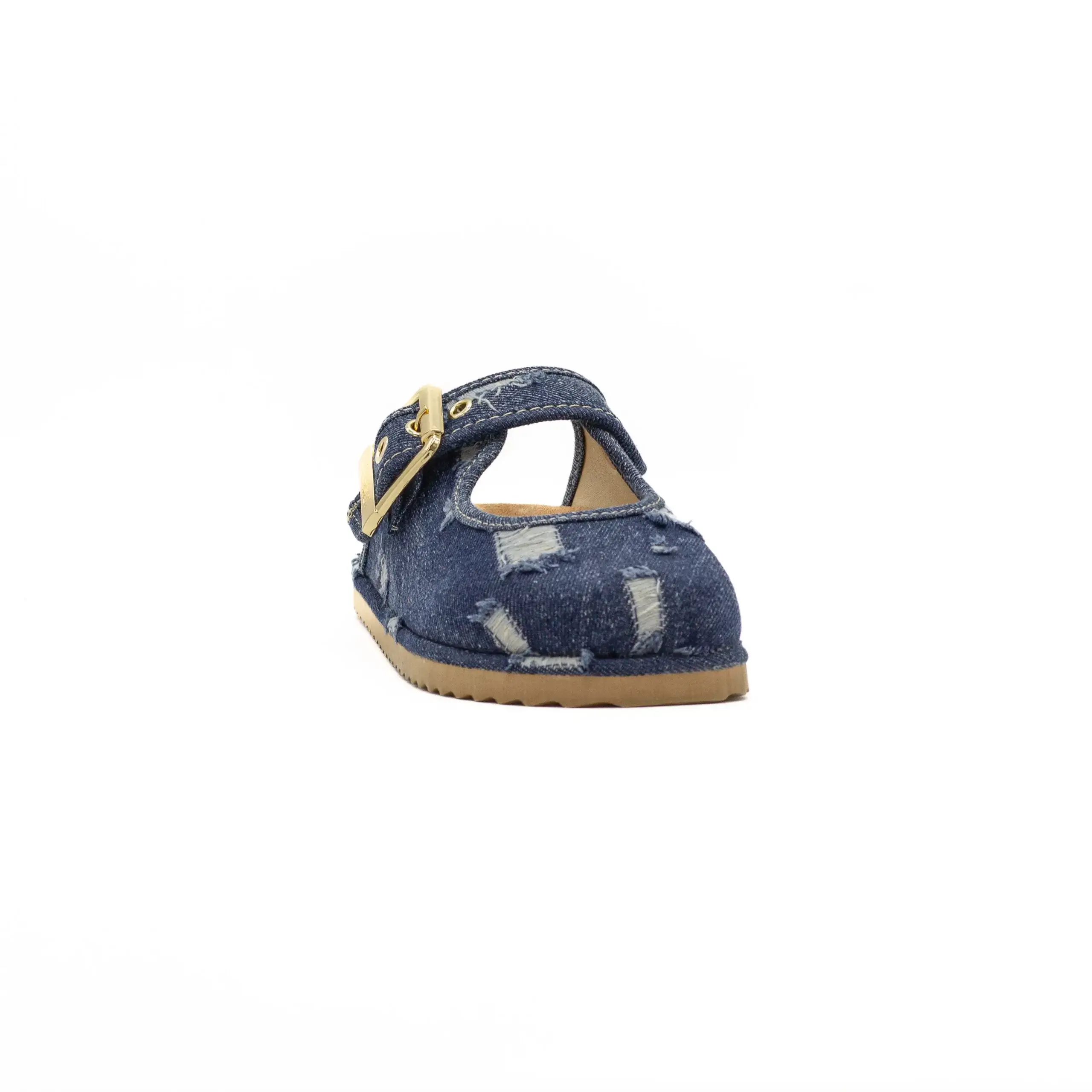 Um chinelo fechado na frente complementado com uma abertura e uma fivela ajustável.