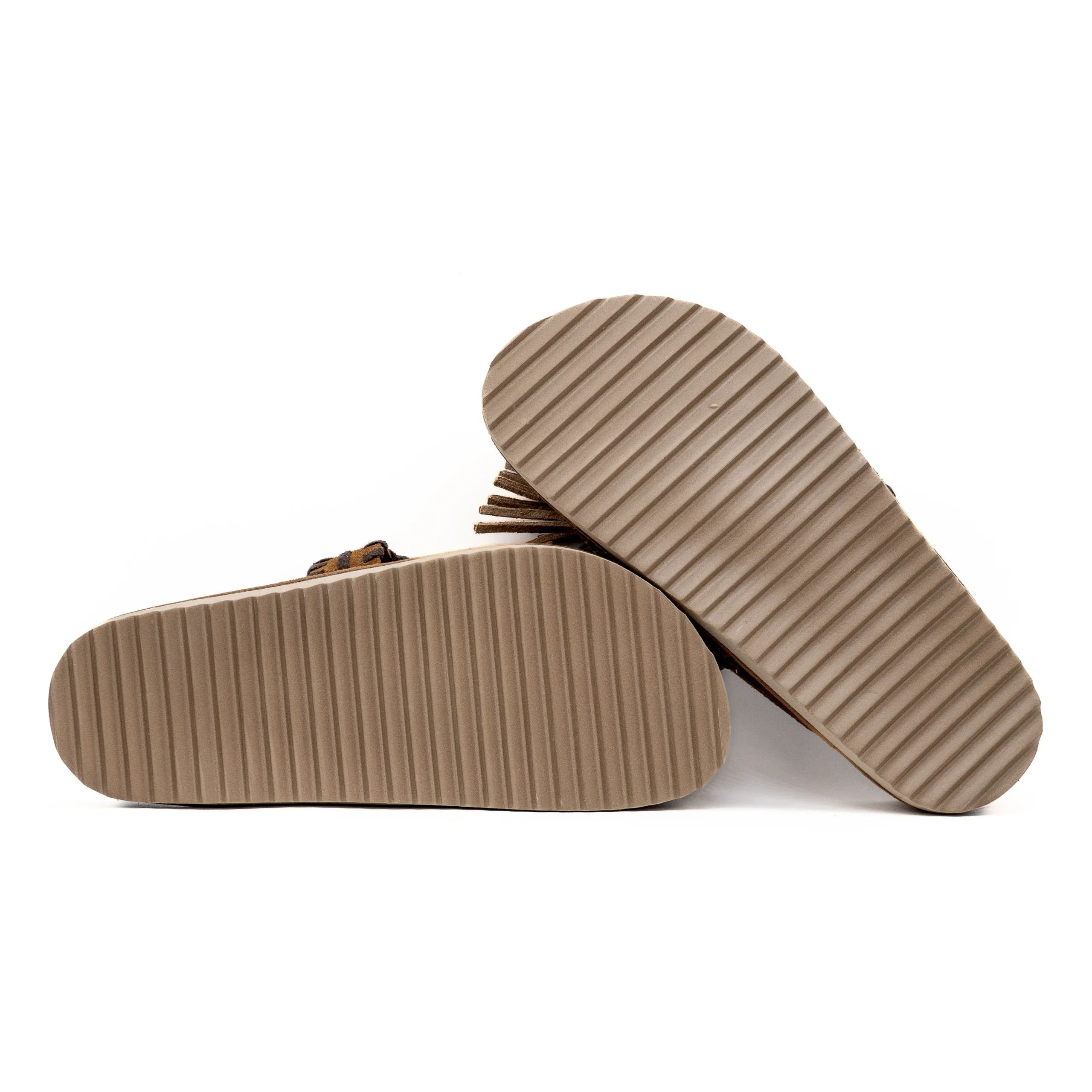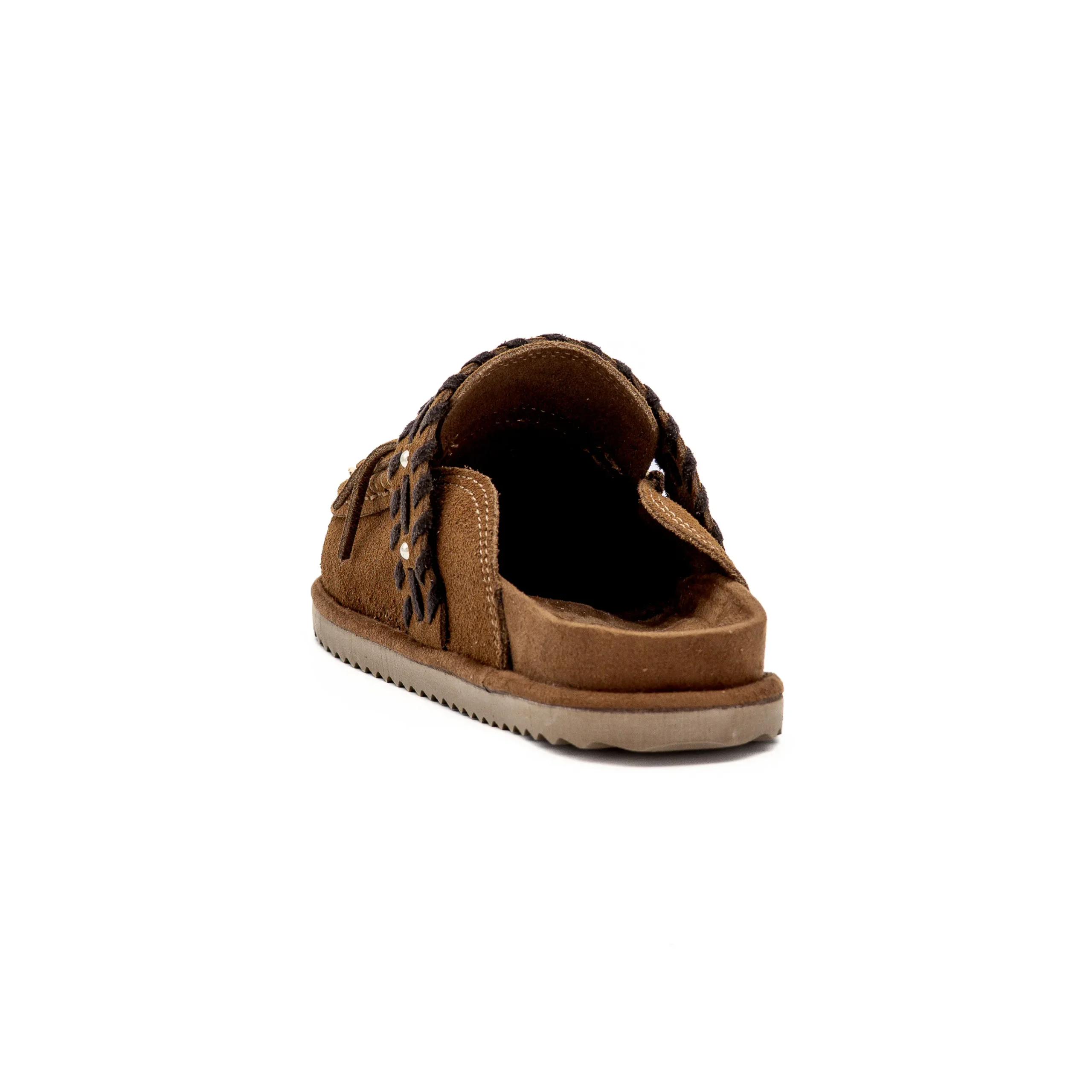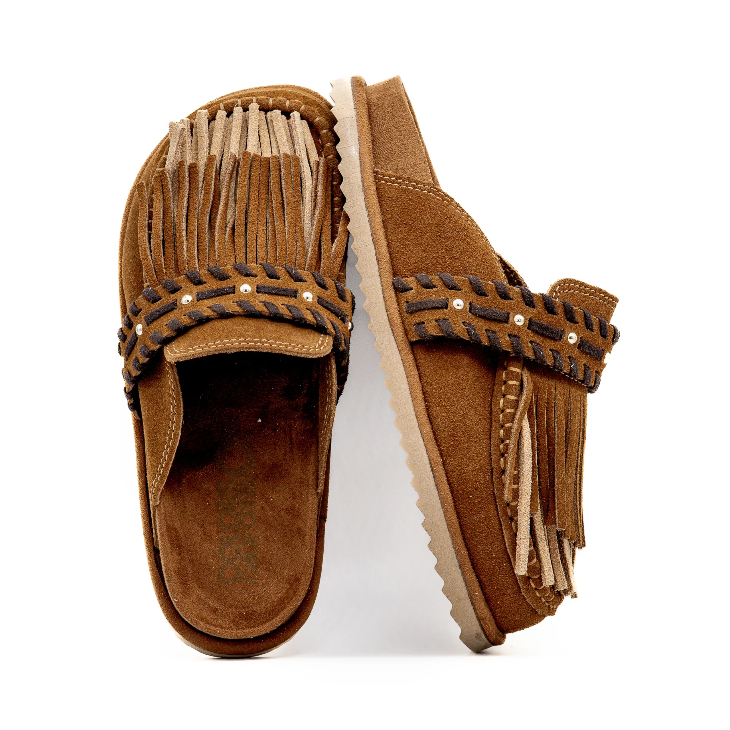Confeccionado em material de efeito camurça, destaca-se pelo detalhe de franjas frontais e pela tira superior com acabamento entrançado em contraste, que reforça o carácter étnico e sofisticado do modelo.