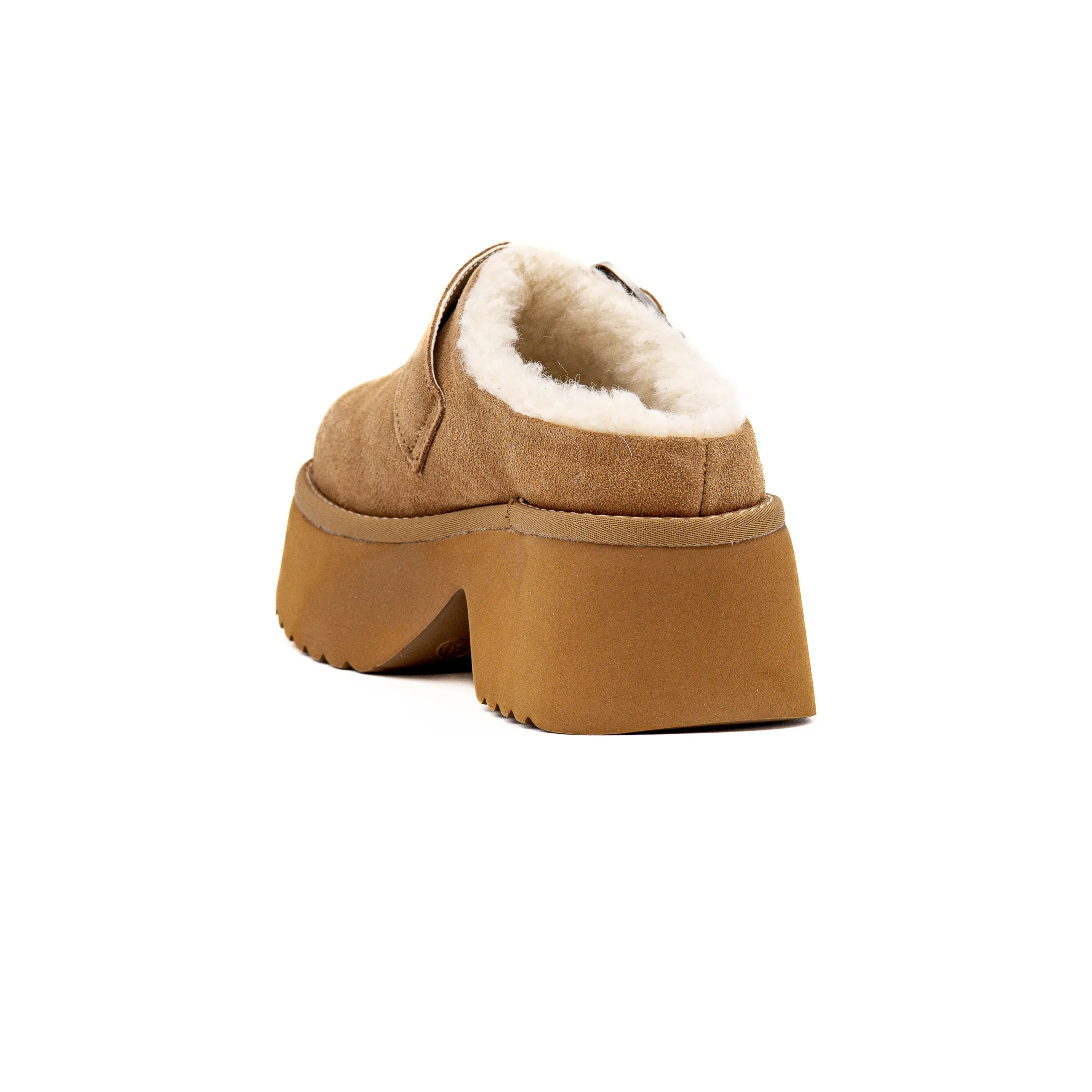 Apresenta uma sola em plataforma e uma elegante fivela de metal personalizada com o nome da marca.