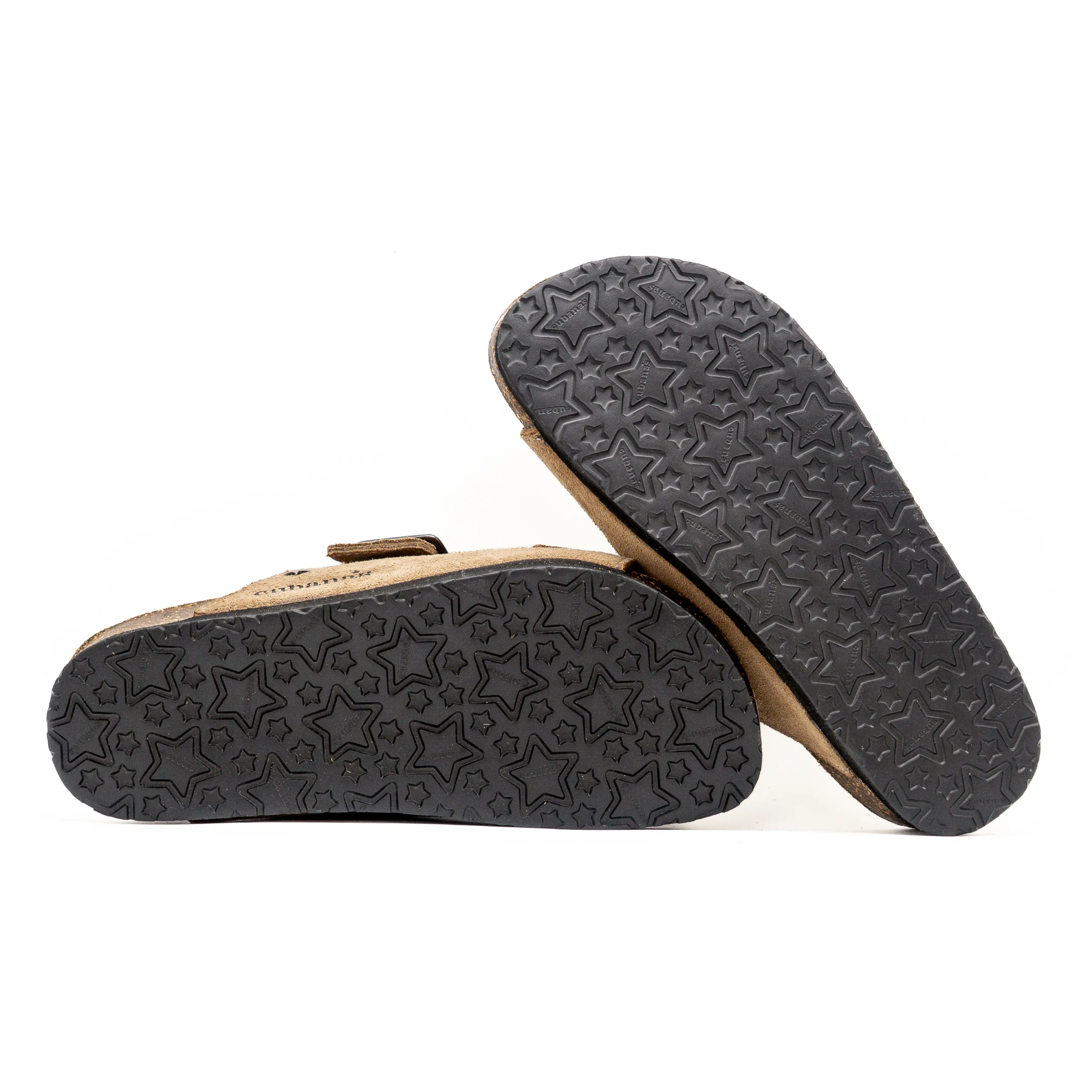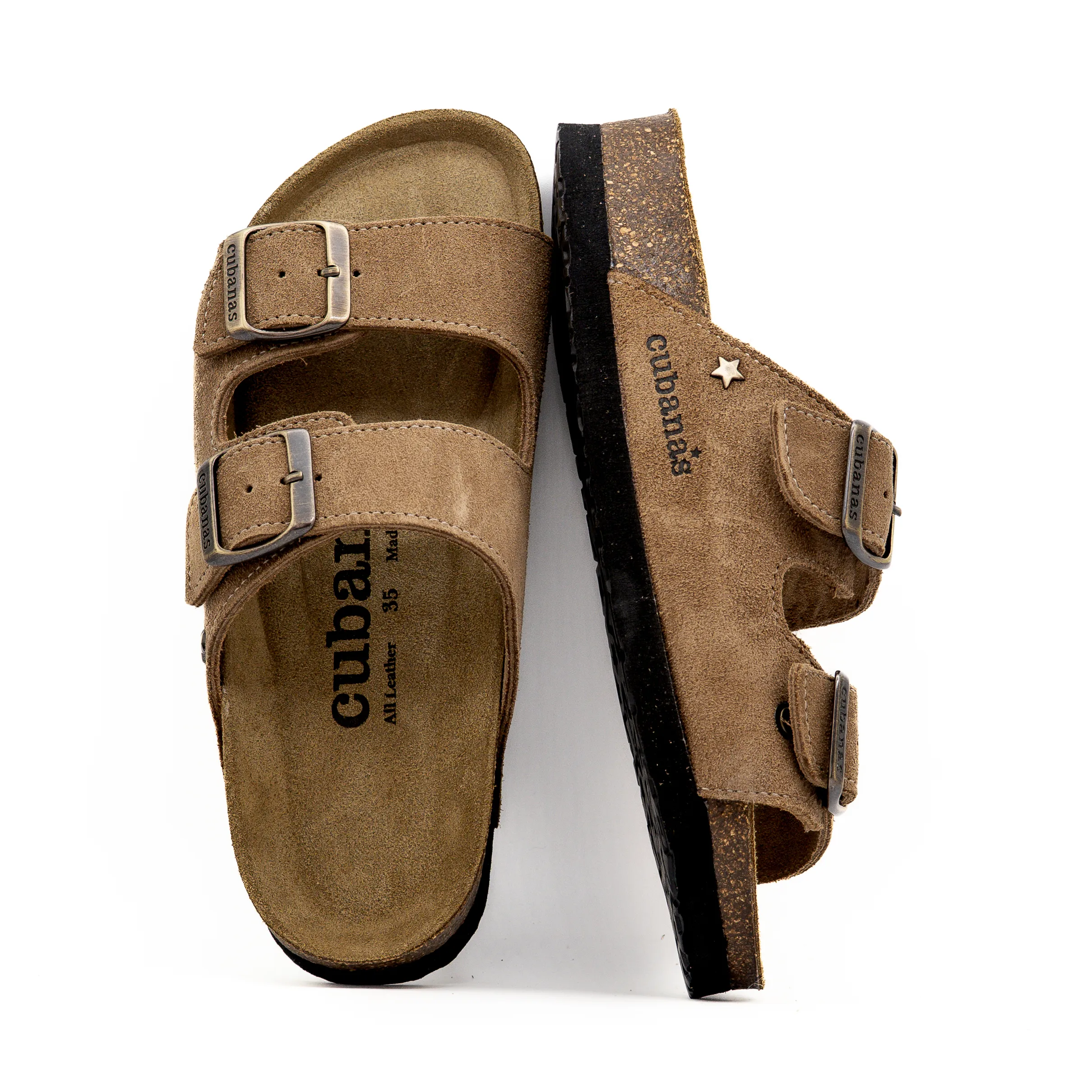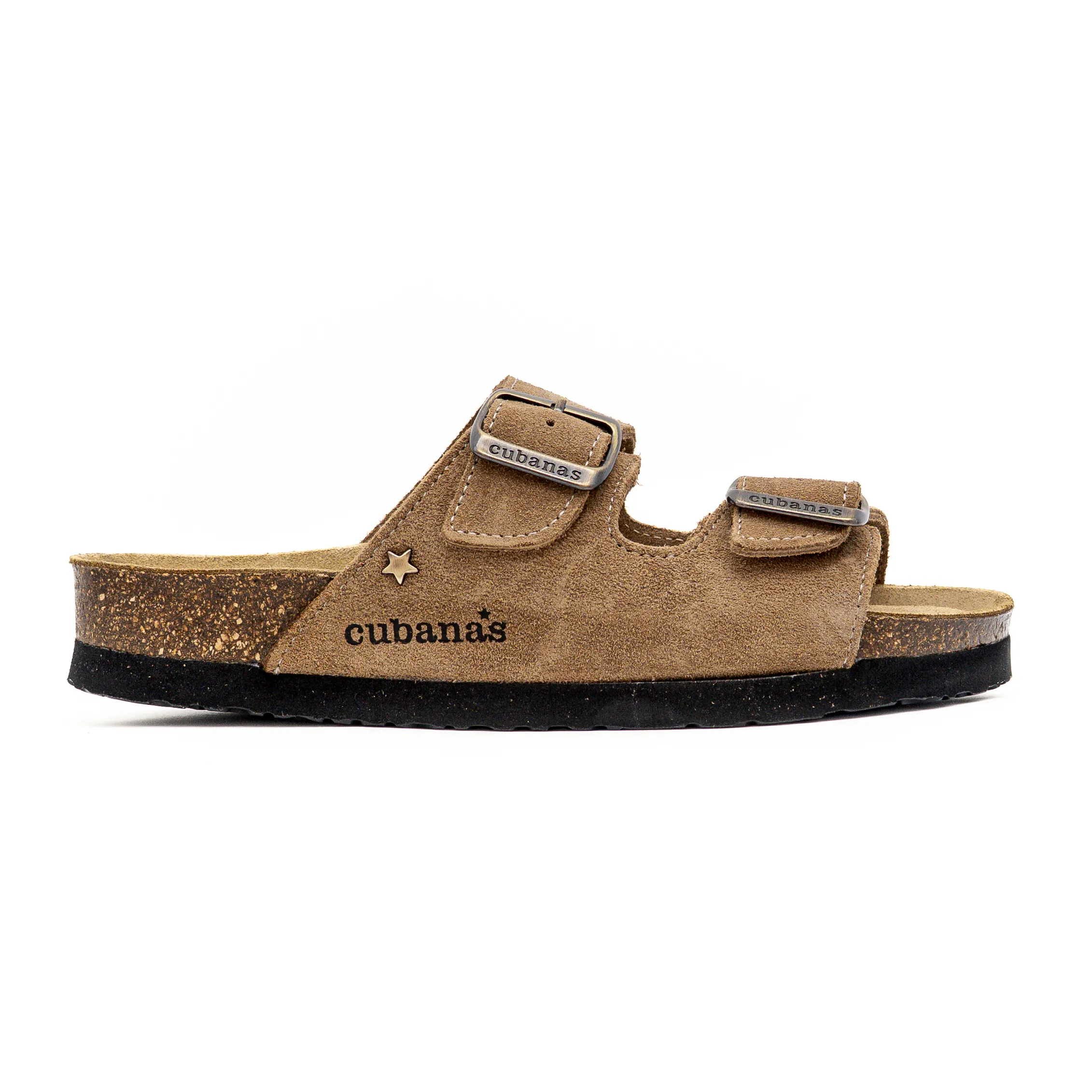 Destaca-se pelo seu design confortável com duas tiras em camurça e fivelas ajustáveis.