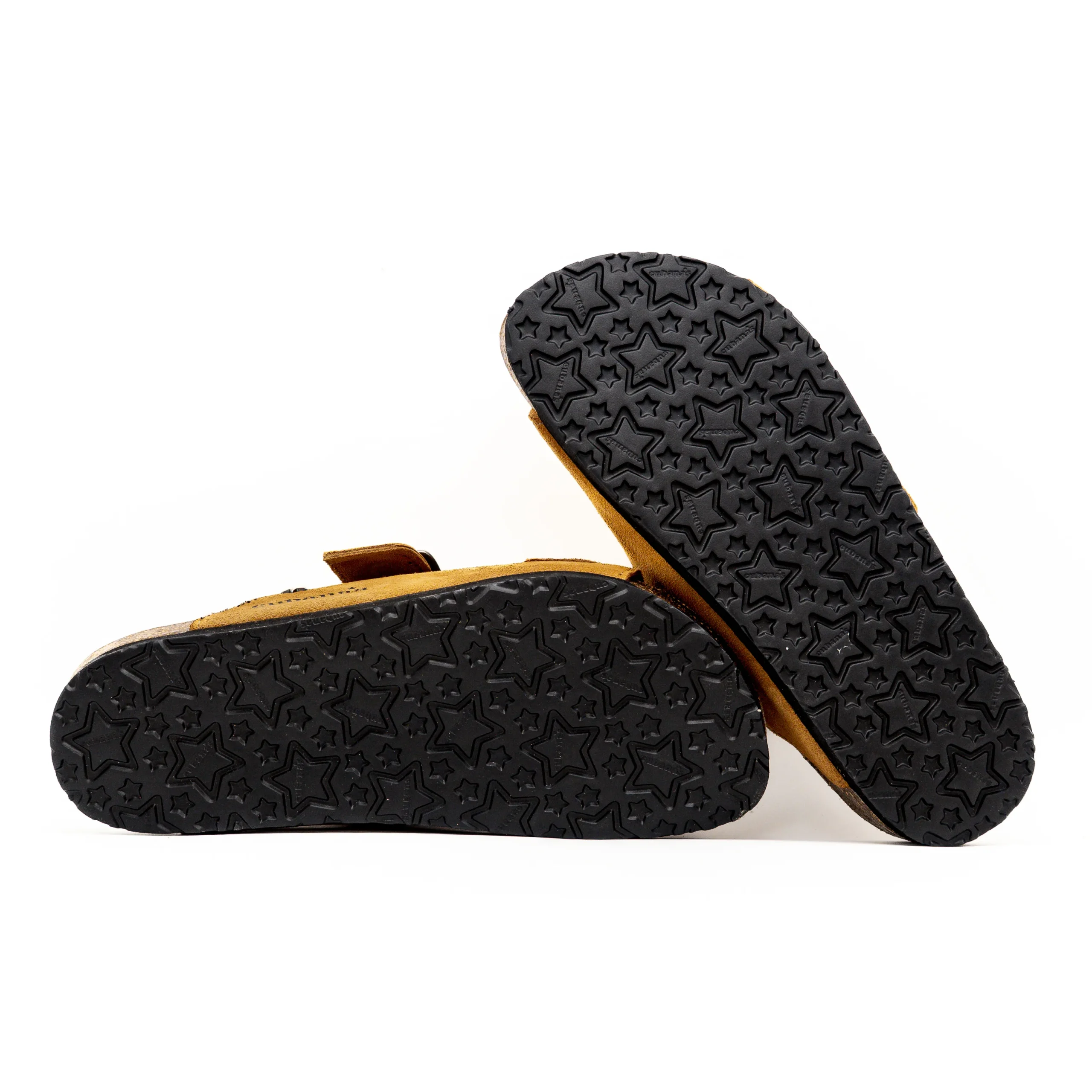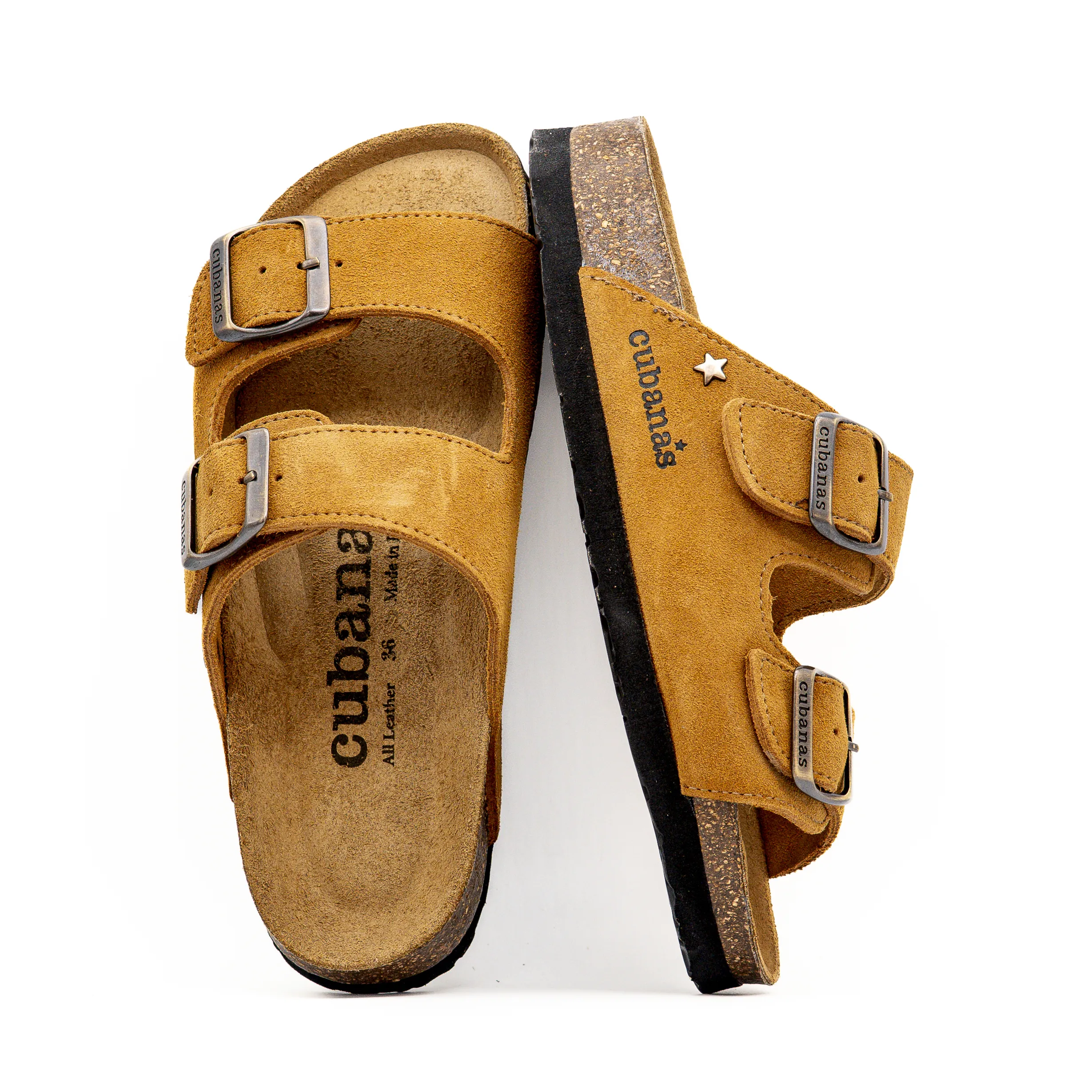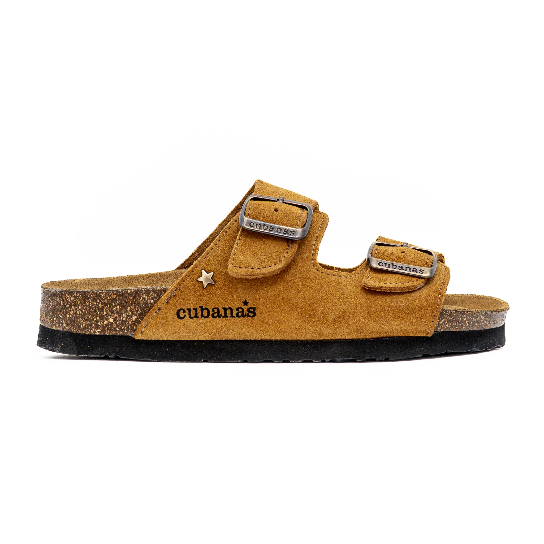 Destaca-se pelo seu design confortável com duas tiras em camurça e fivelas ajustáveis.