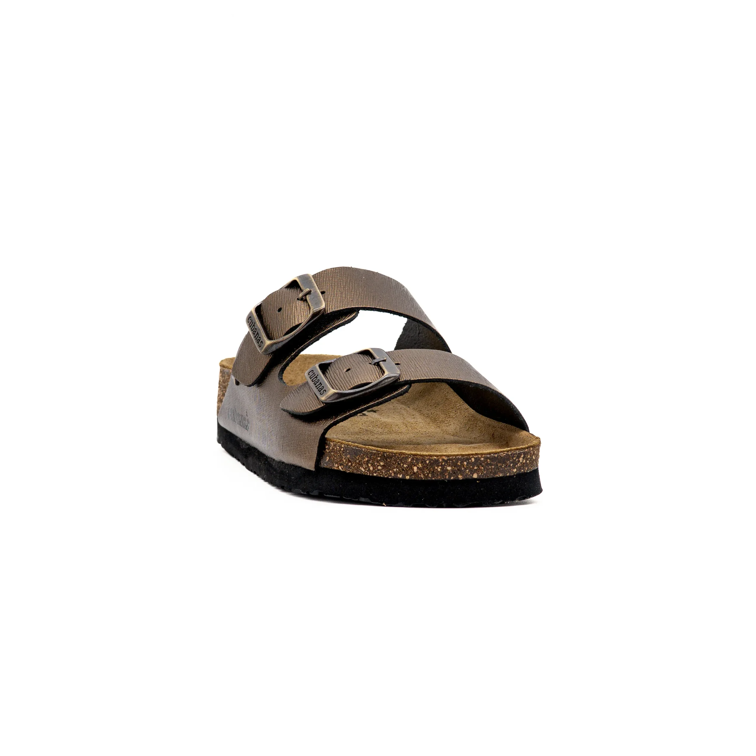 O tom castanho com textura subtil cria um efeito sofisticado que reflete a luz de forma discreta, tornando este modelo perfeito para quem procura um toque de brilho nos looks de verão.
