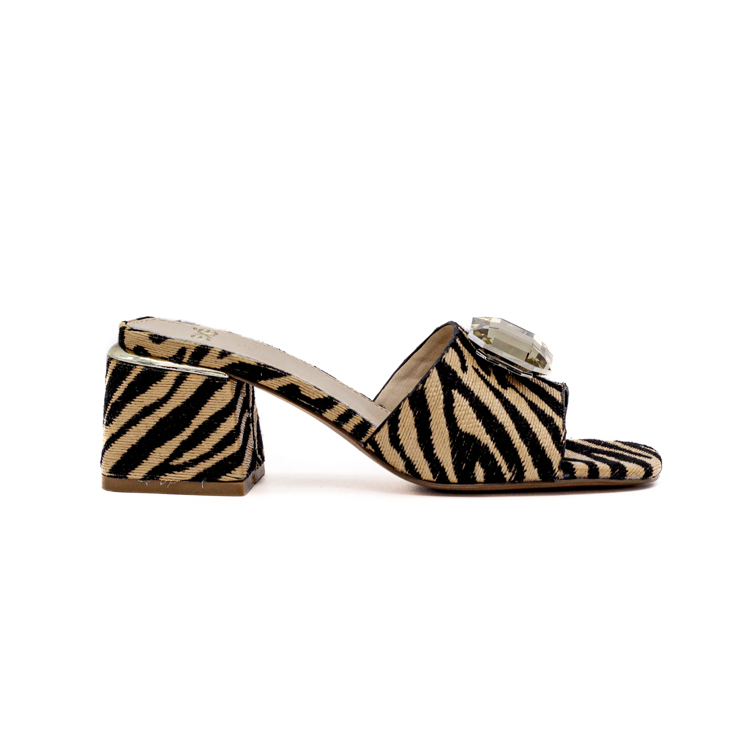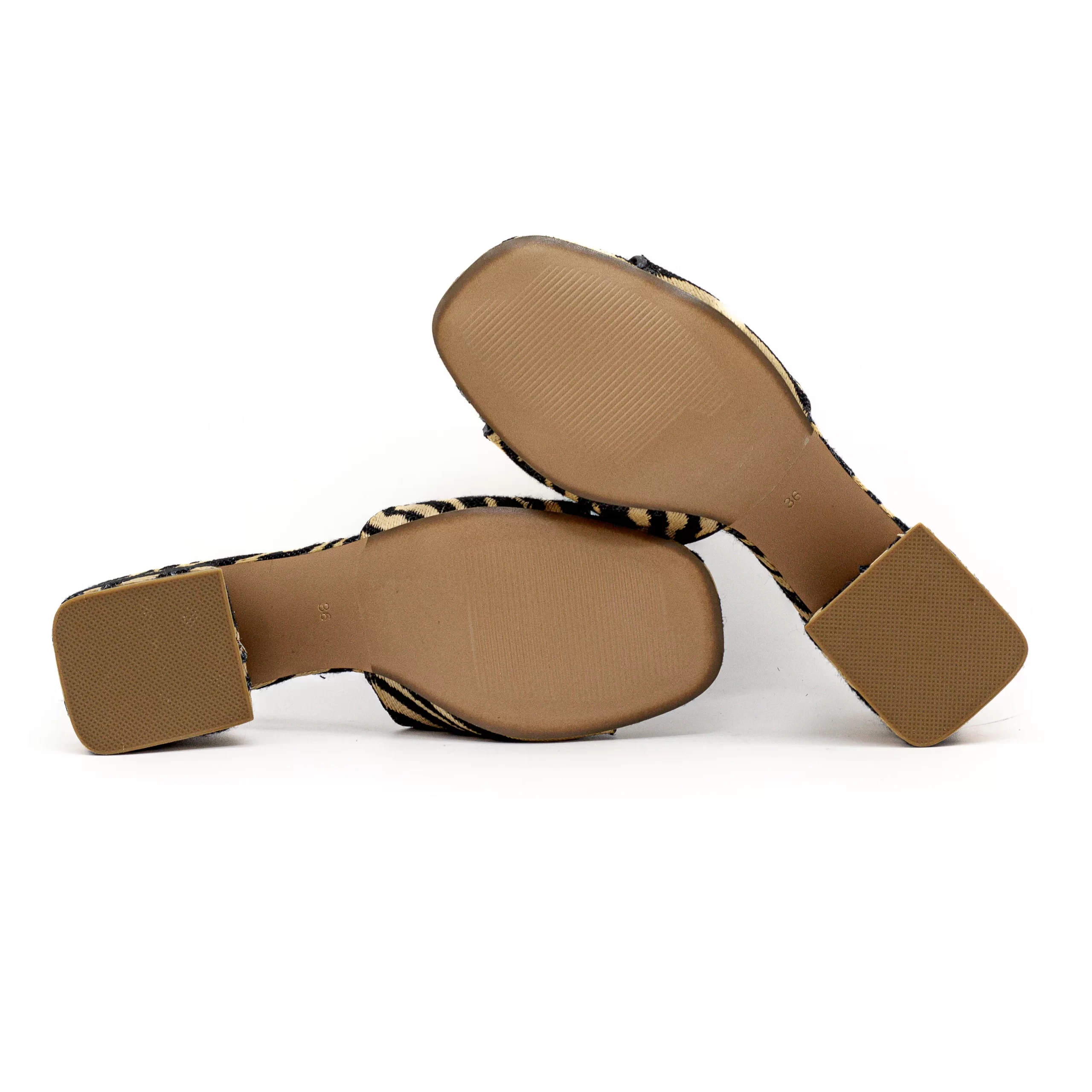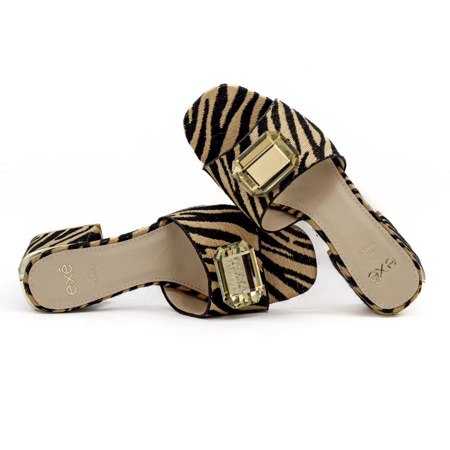Com um padrão de animal print, aberto na frente e com uma aplicação, este chinelo possui um salto largo que o torna num chinelo diferente do comum.