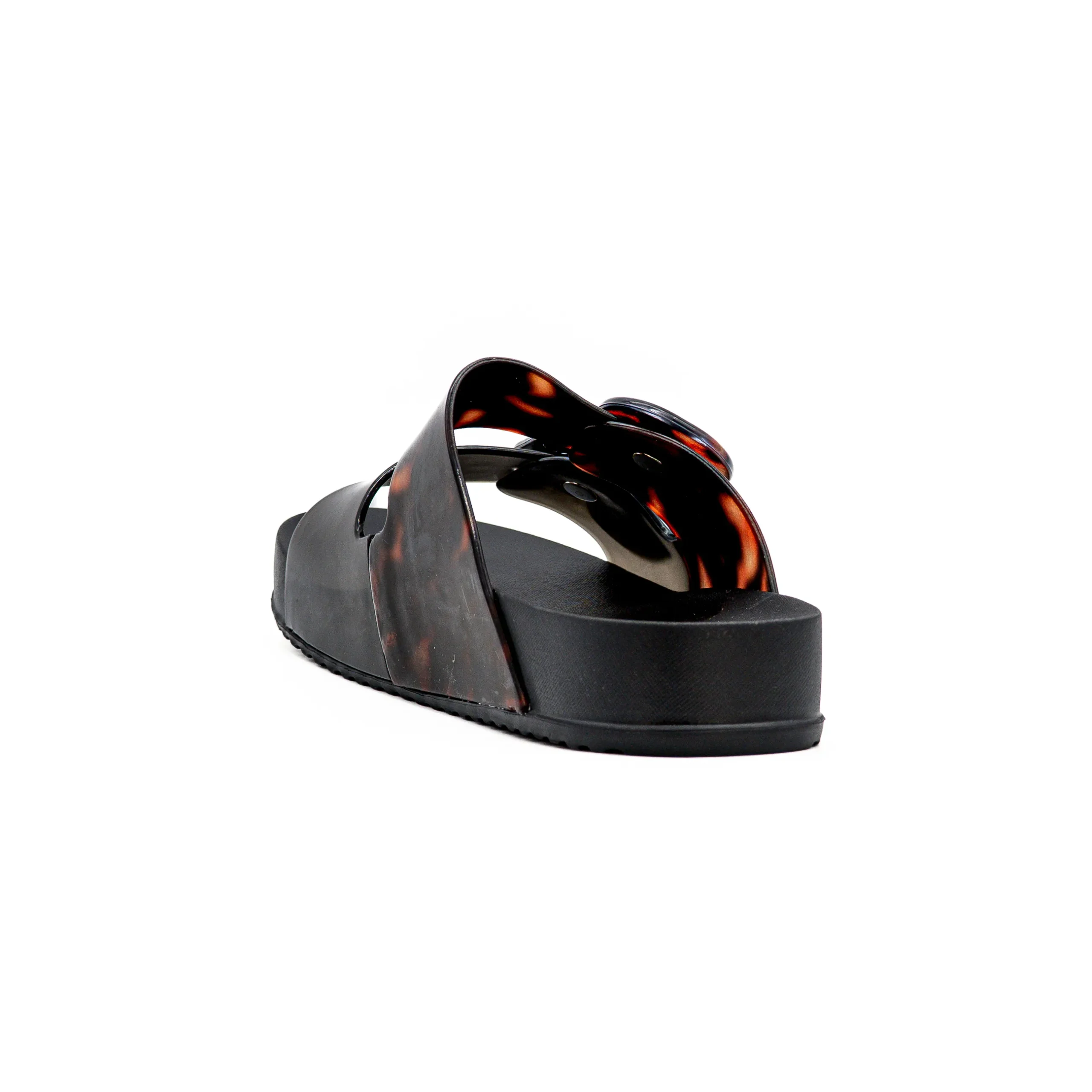 Um chinelo com um design elegante, com duas fivelas ajustáveis e um solado recortado.