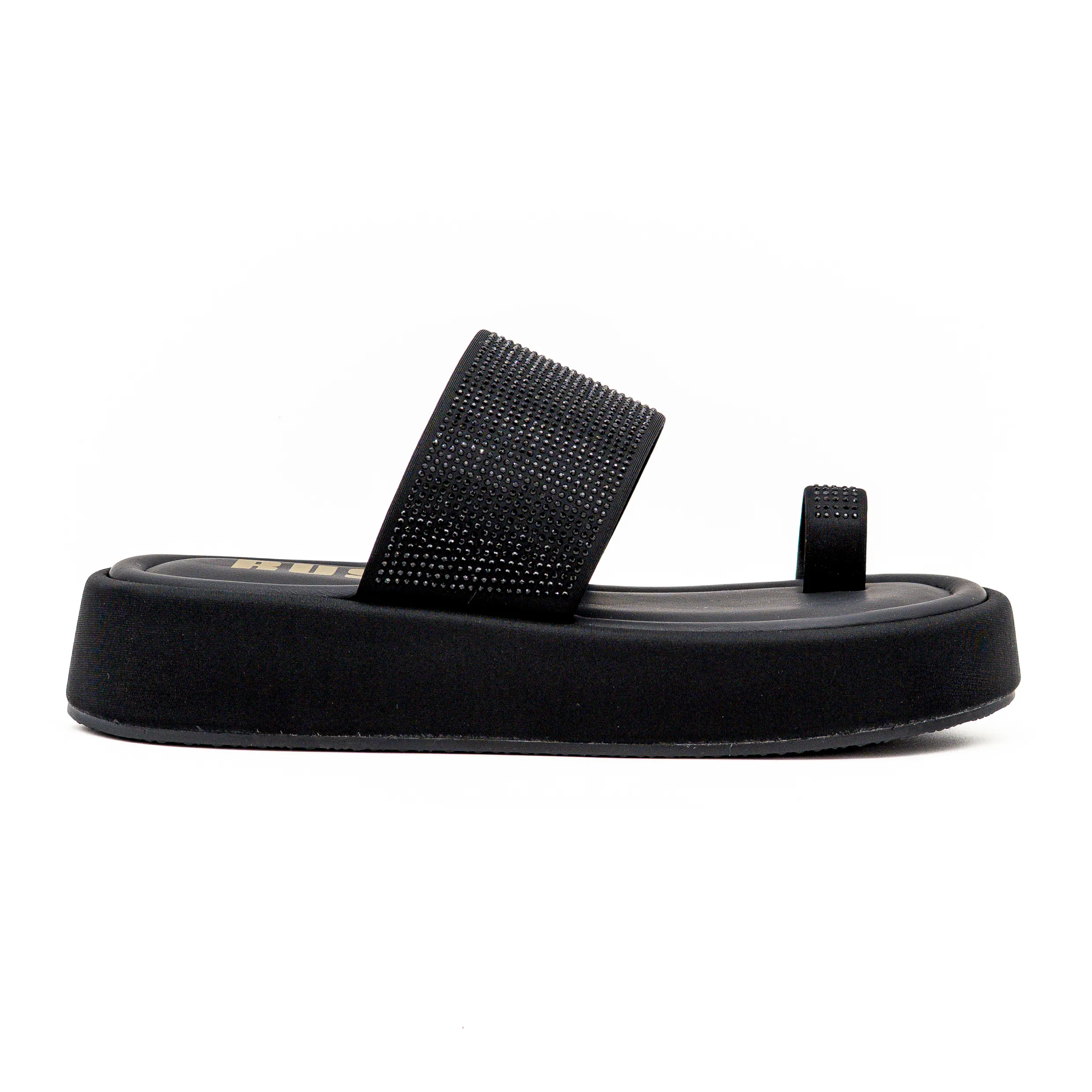 Totalmente em preto, este modelo destaca-se pelos detalhes brilhantes que trazem um toque de glamour ao visual.