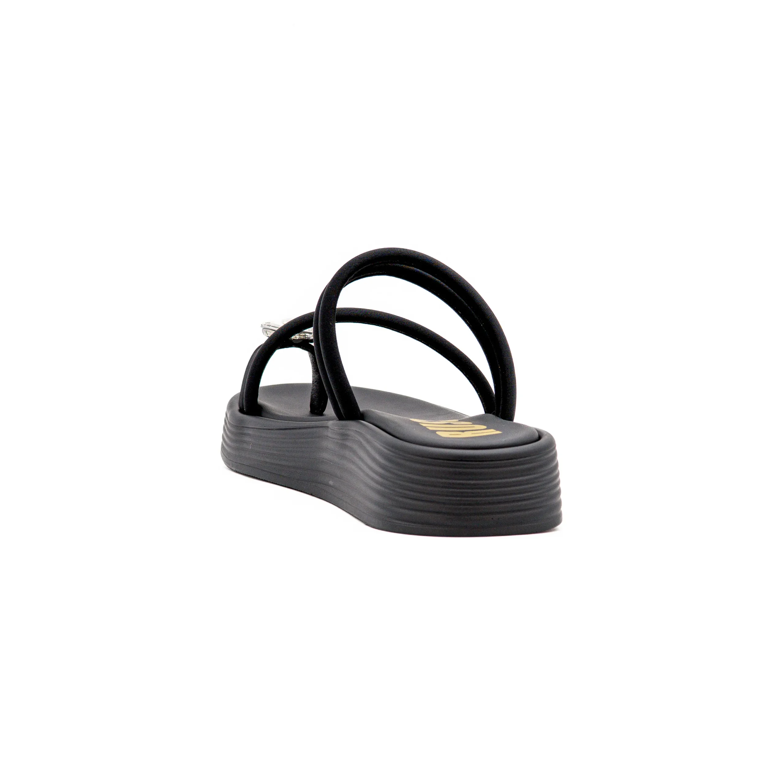Com um design minimalista em preto, o modelo destaca-se pela sua plataforma que garante conforto e presença em qualquer look.
