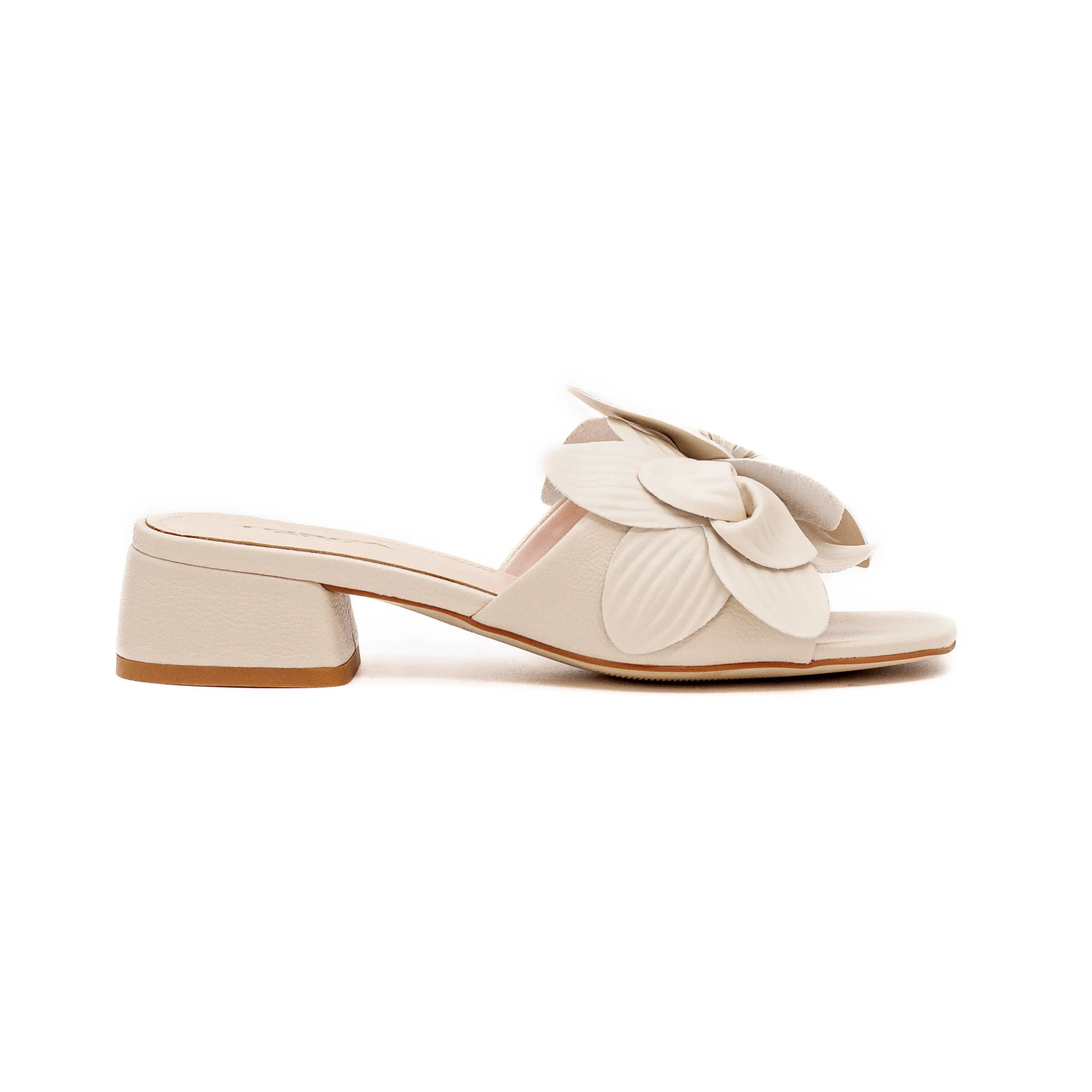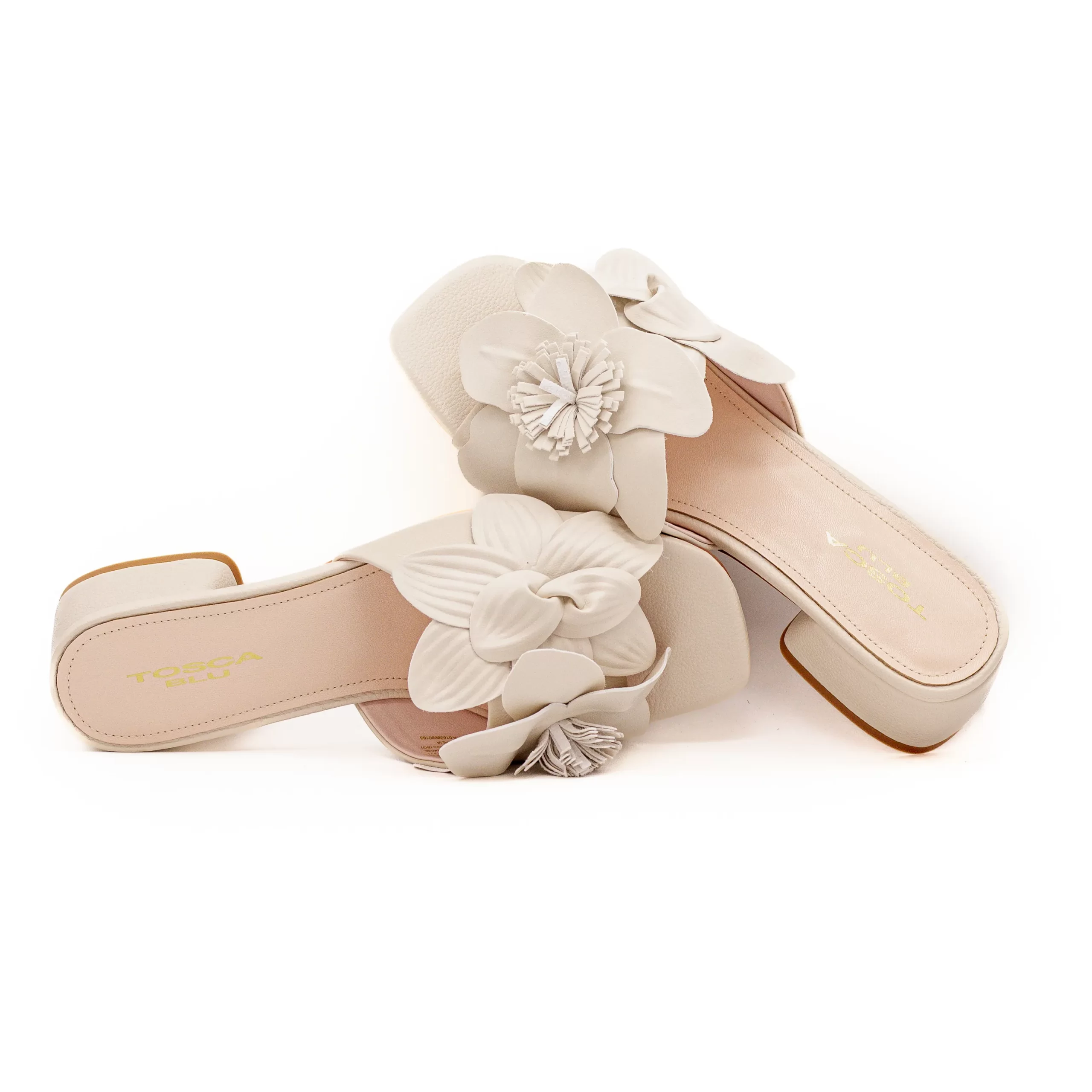 Este modelo da Tosca Blu é complementado com flores decorativas, criando um efeito visual marcante e um charme romântico.