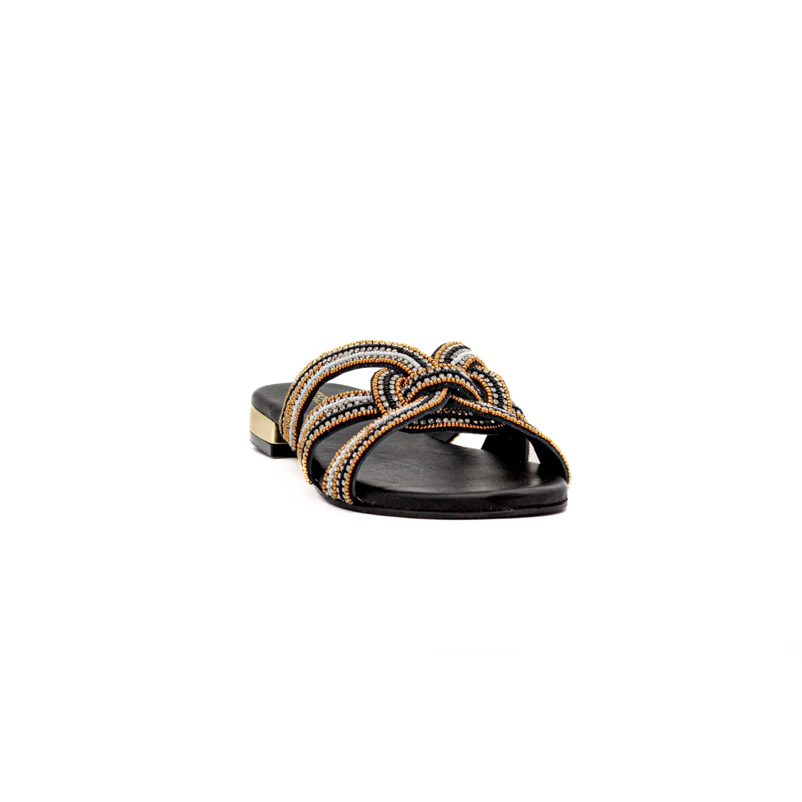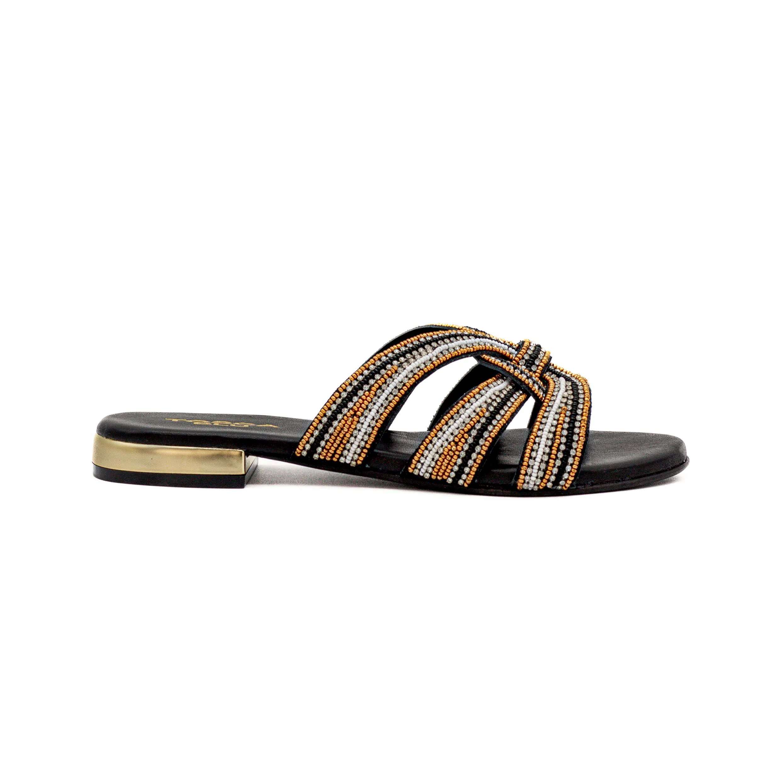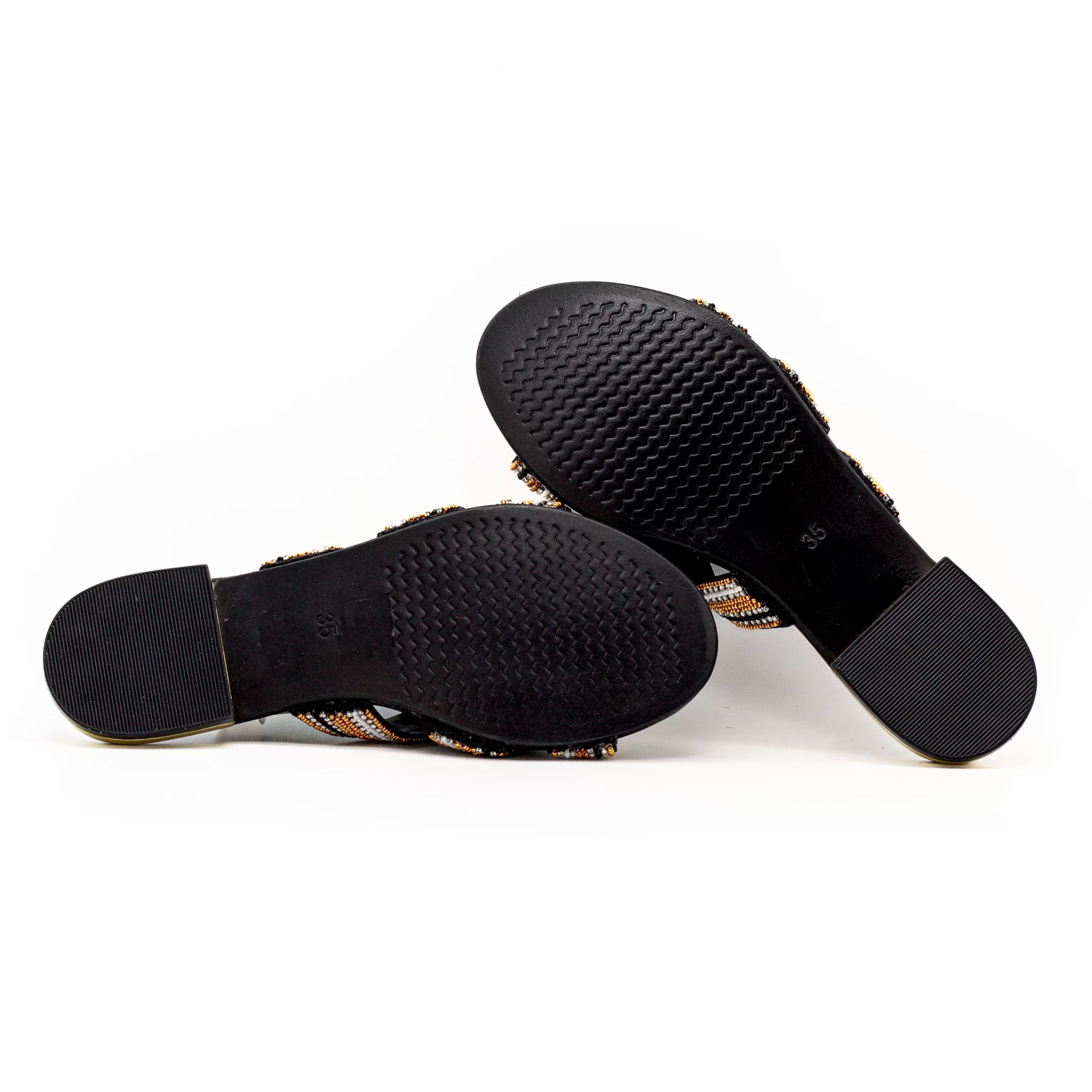 Um chinelo com um design elegante, com brilhos a predominar.