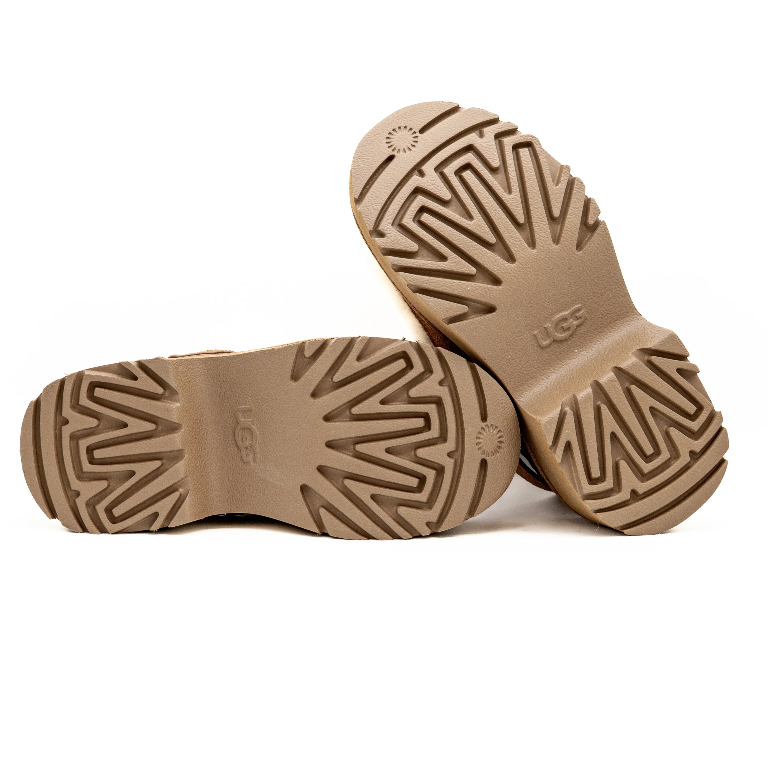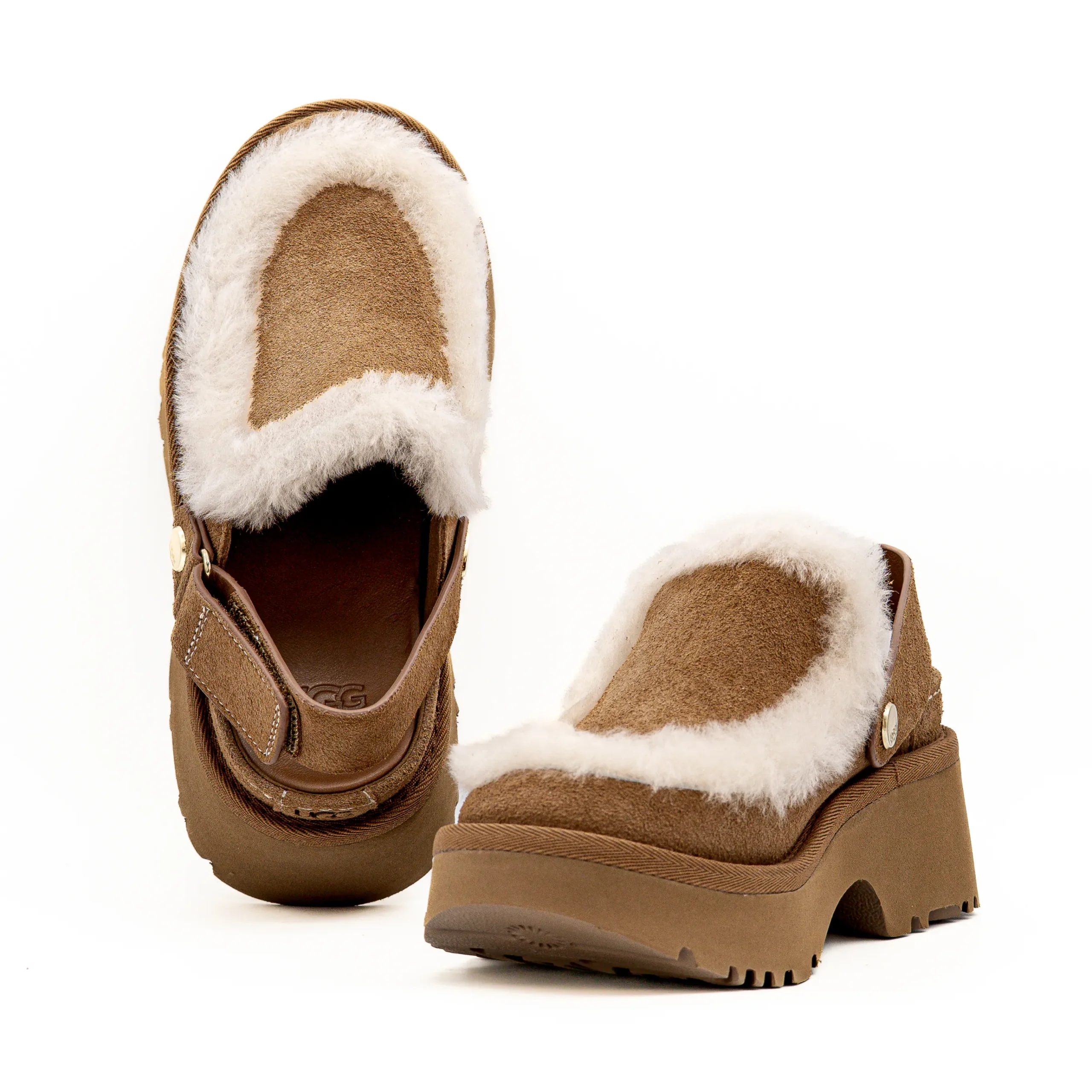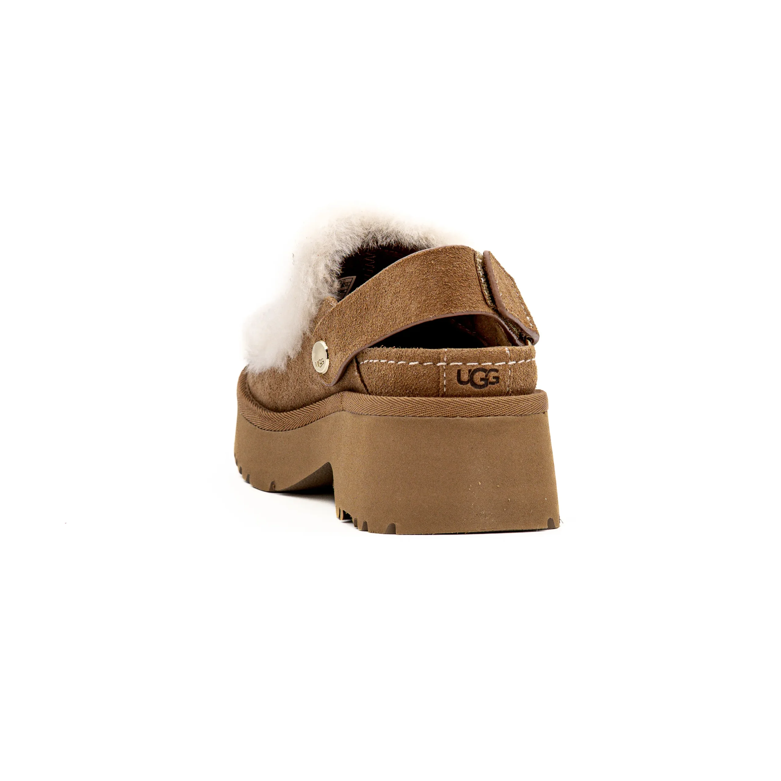 As UGG New Heights Esmee Clog LTHR reinterpretam o clássico conforto da marca com um toque ousado e moderno.
