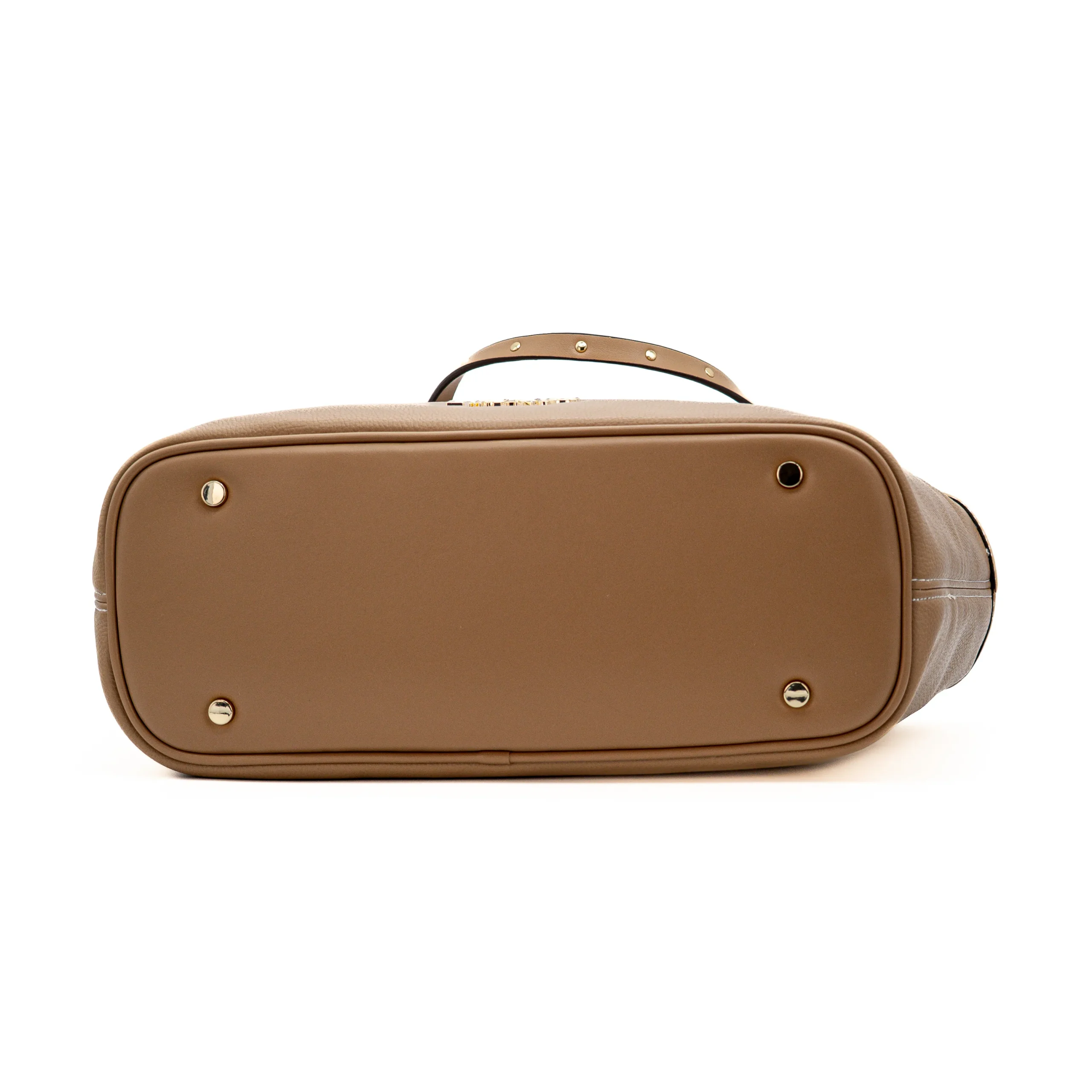 Com um design descontraído, destaca-se pelo tom camel e pelo detalhe metálico com o nome da marca.