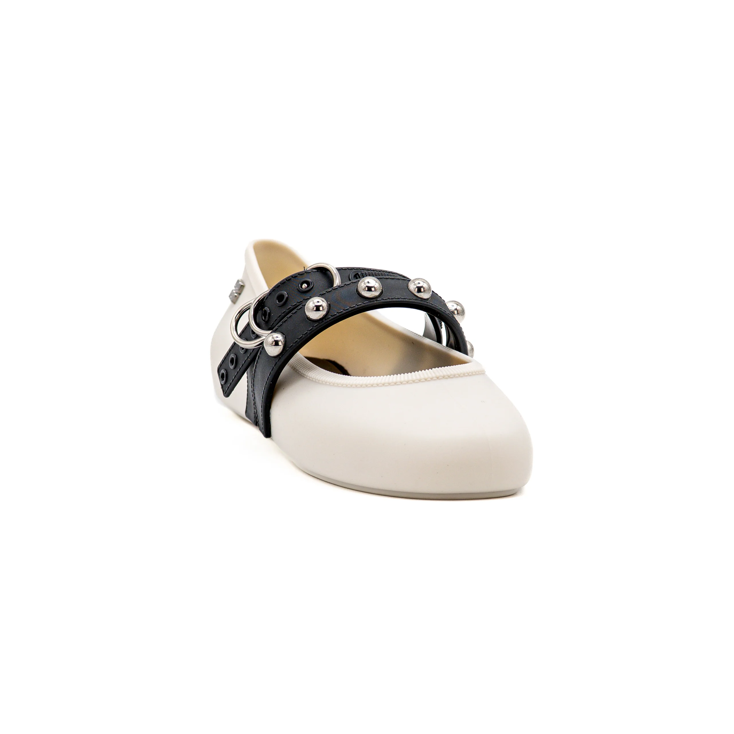 A tira sobre o peito do pé oferece personalização, reforçando a junção entre a estética do ballet e a inovação contemporânea.