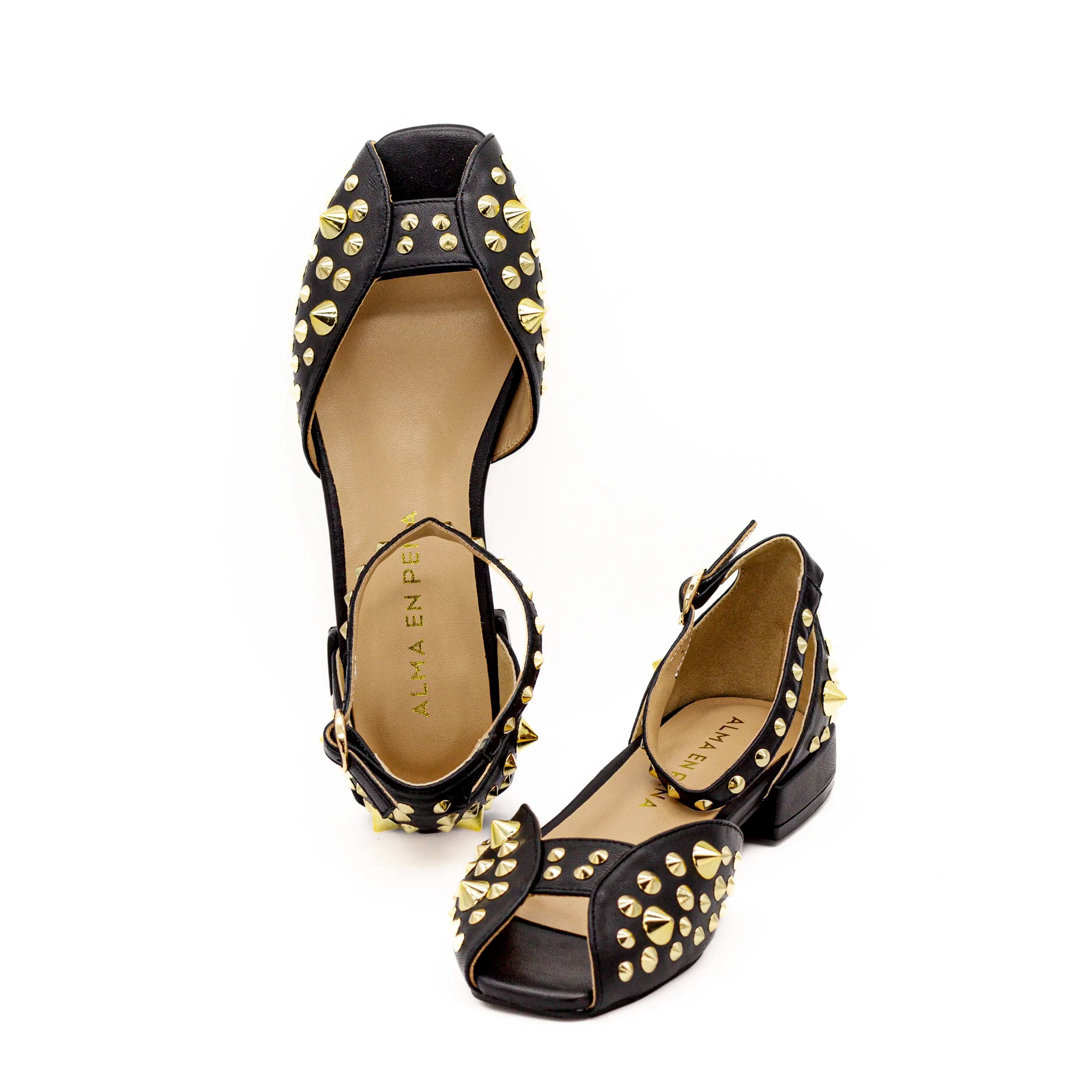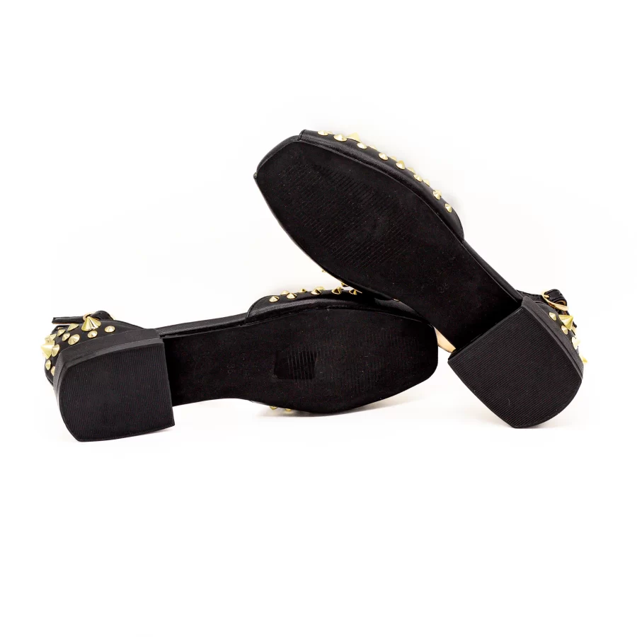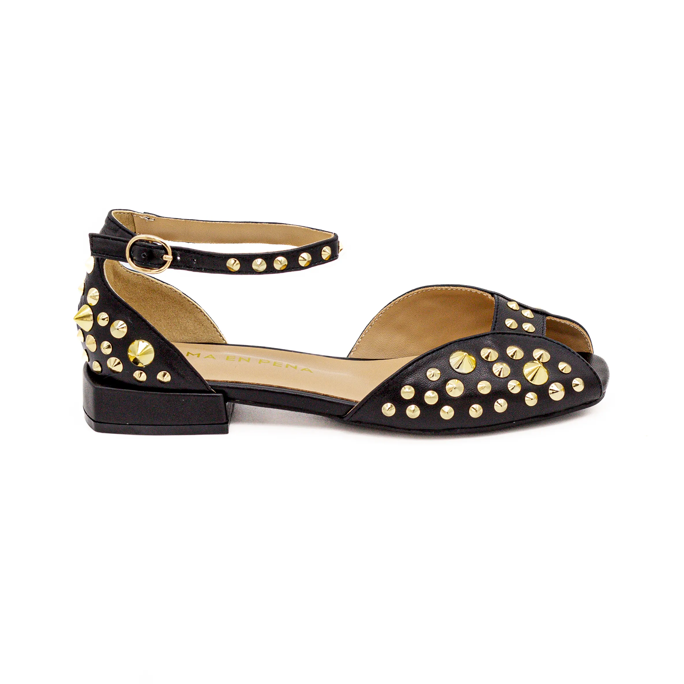 Esta sandália é complementada com tachas e é aberta na frente o que a torna elegante.