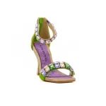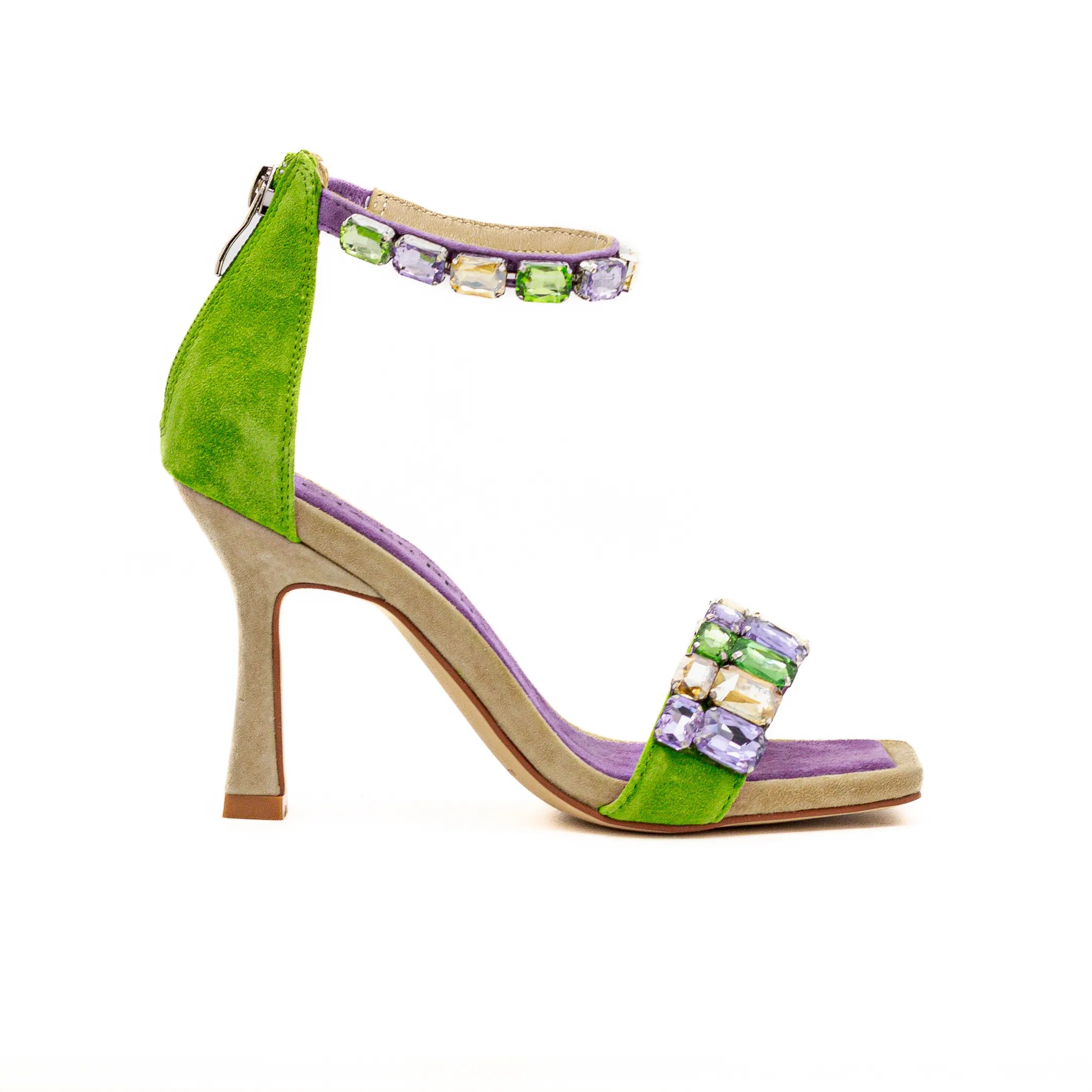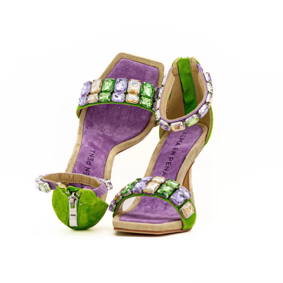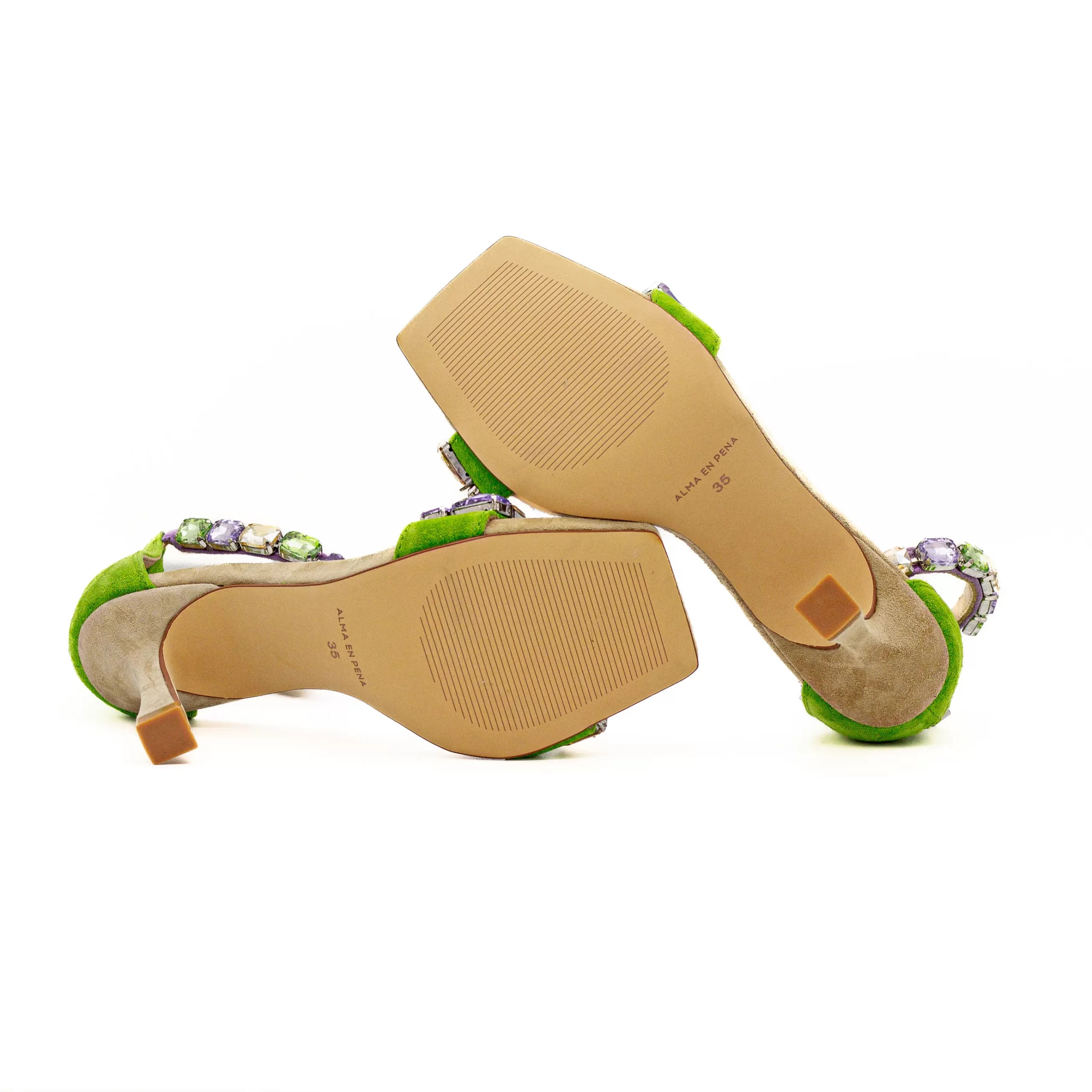 Esta sandália da Alma en Pena visa pelas cores, pelo salto confortável e pelos detalhes em strass.