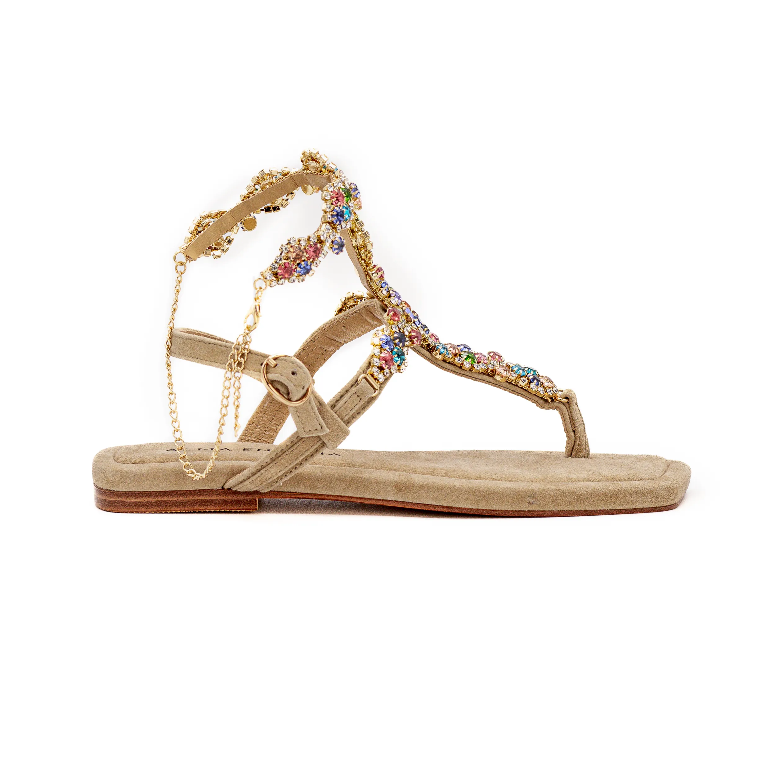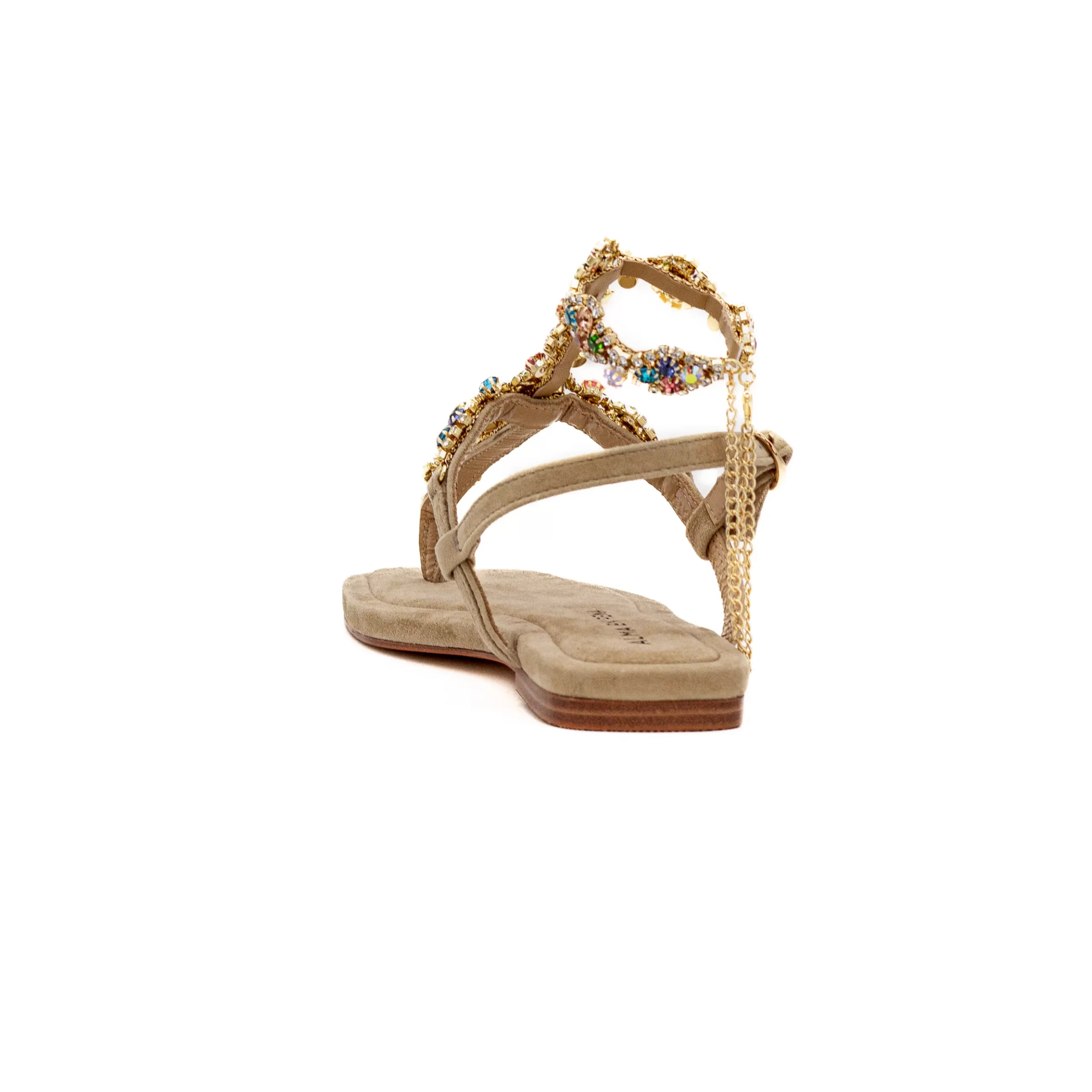 Esta sandália super elegante é feita em pele e complementada com aplicações e uma corrente em tons dourados.
