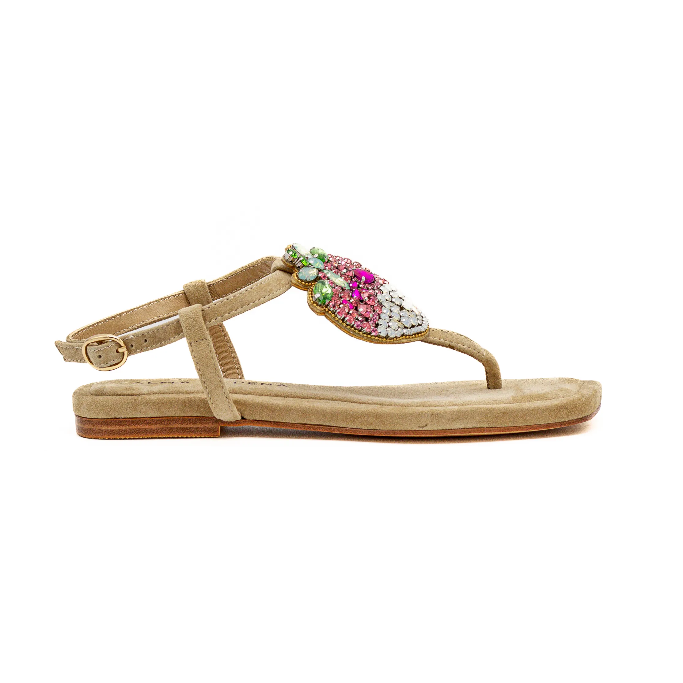 As aplicações em formato de fruta, conferem uma elegância a esta sandália.