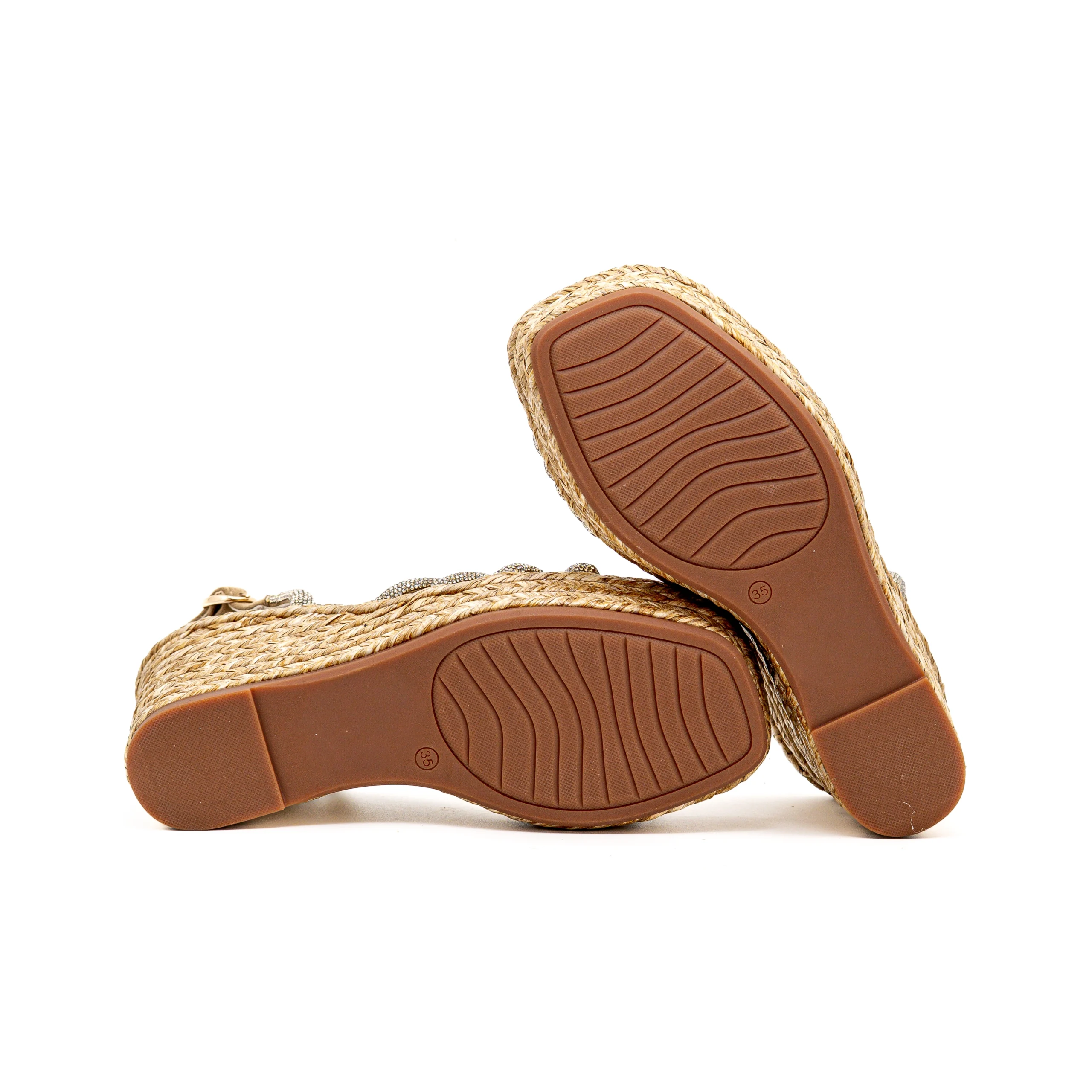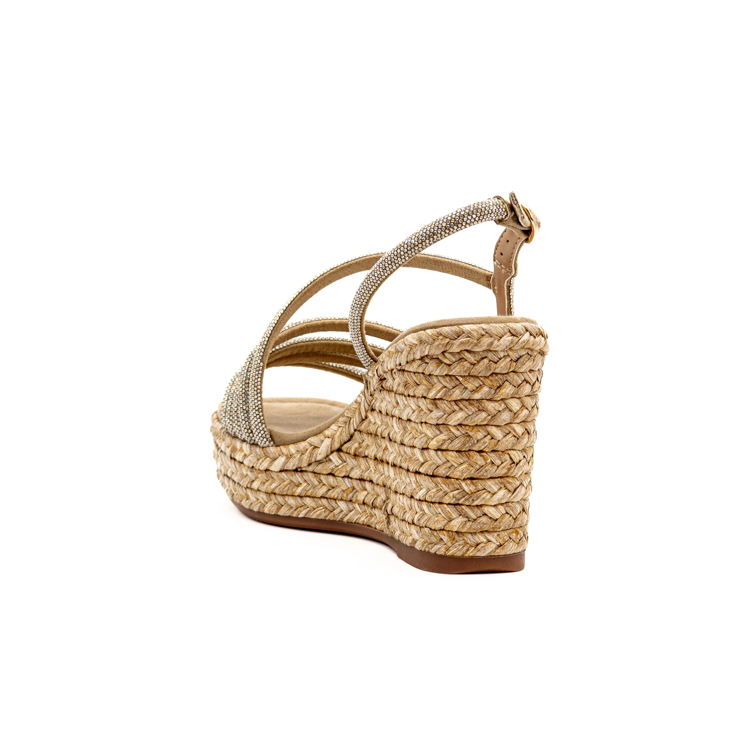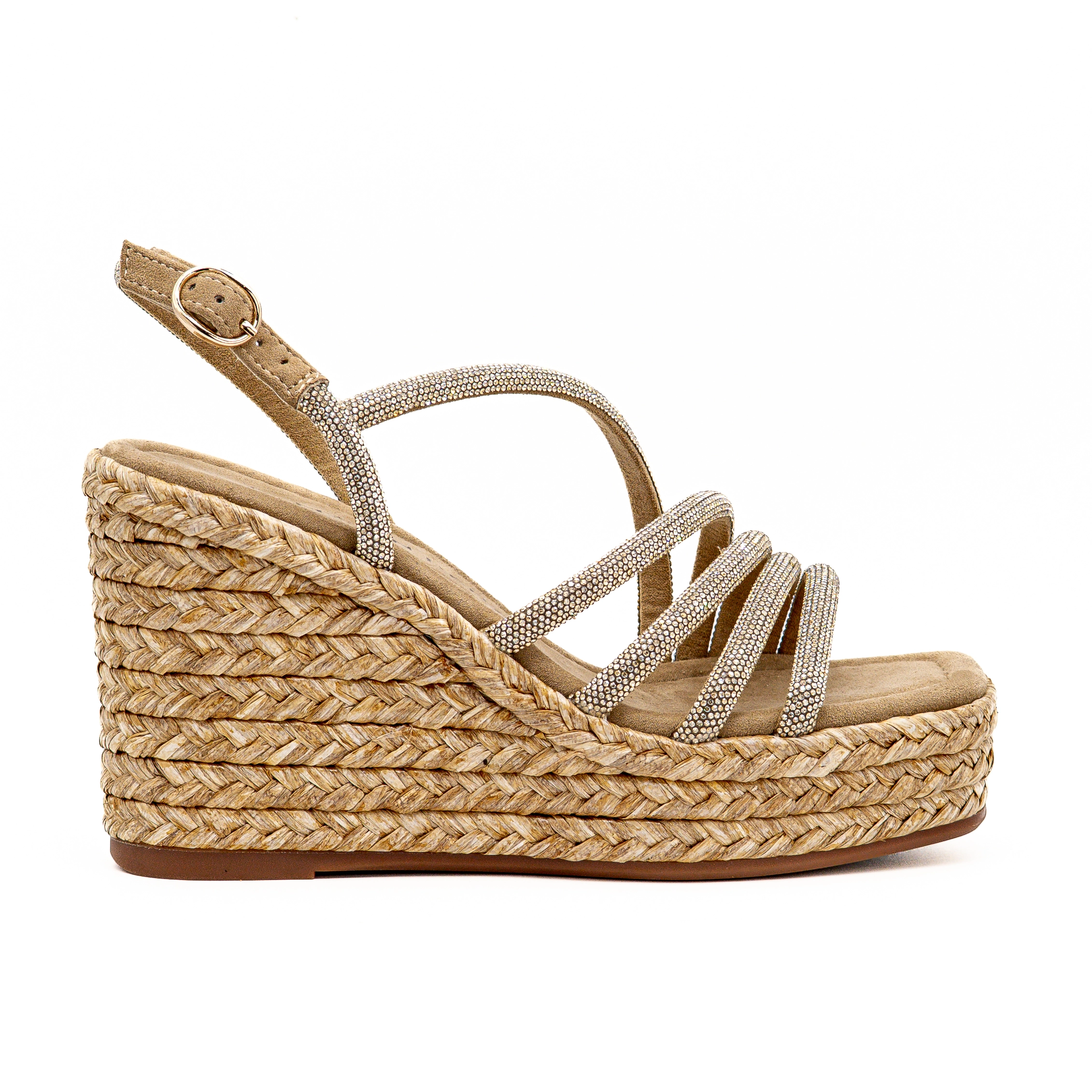 O acabamento luminoso das tiras acrescenta glamour subtil, enquanto a cunha com efeito ráfia reforça a estética natural e descontraída da estação.