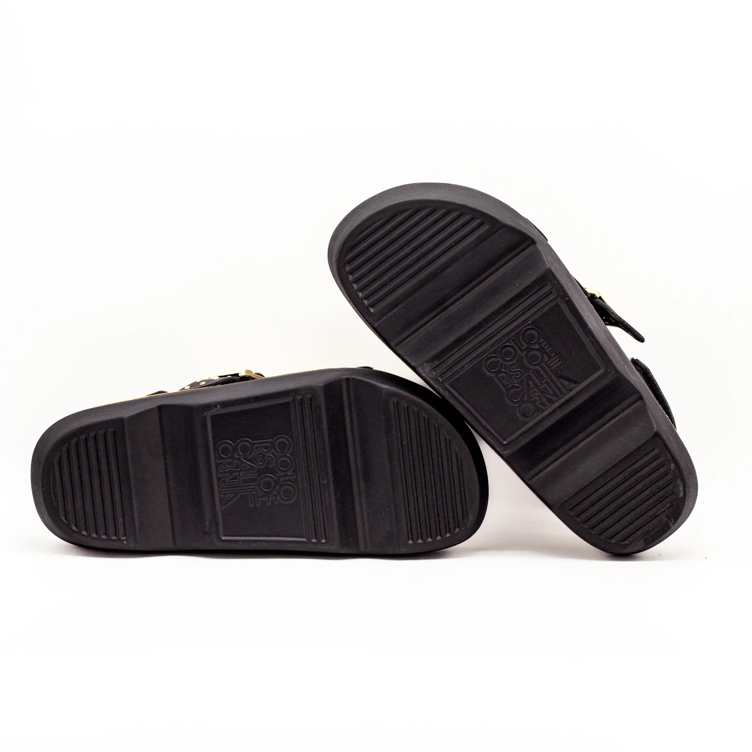 O design desta sandália facilita colocá-la e retirá-la rapidamente, sendo uma opção prática para o dia a dia.