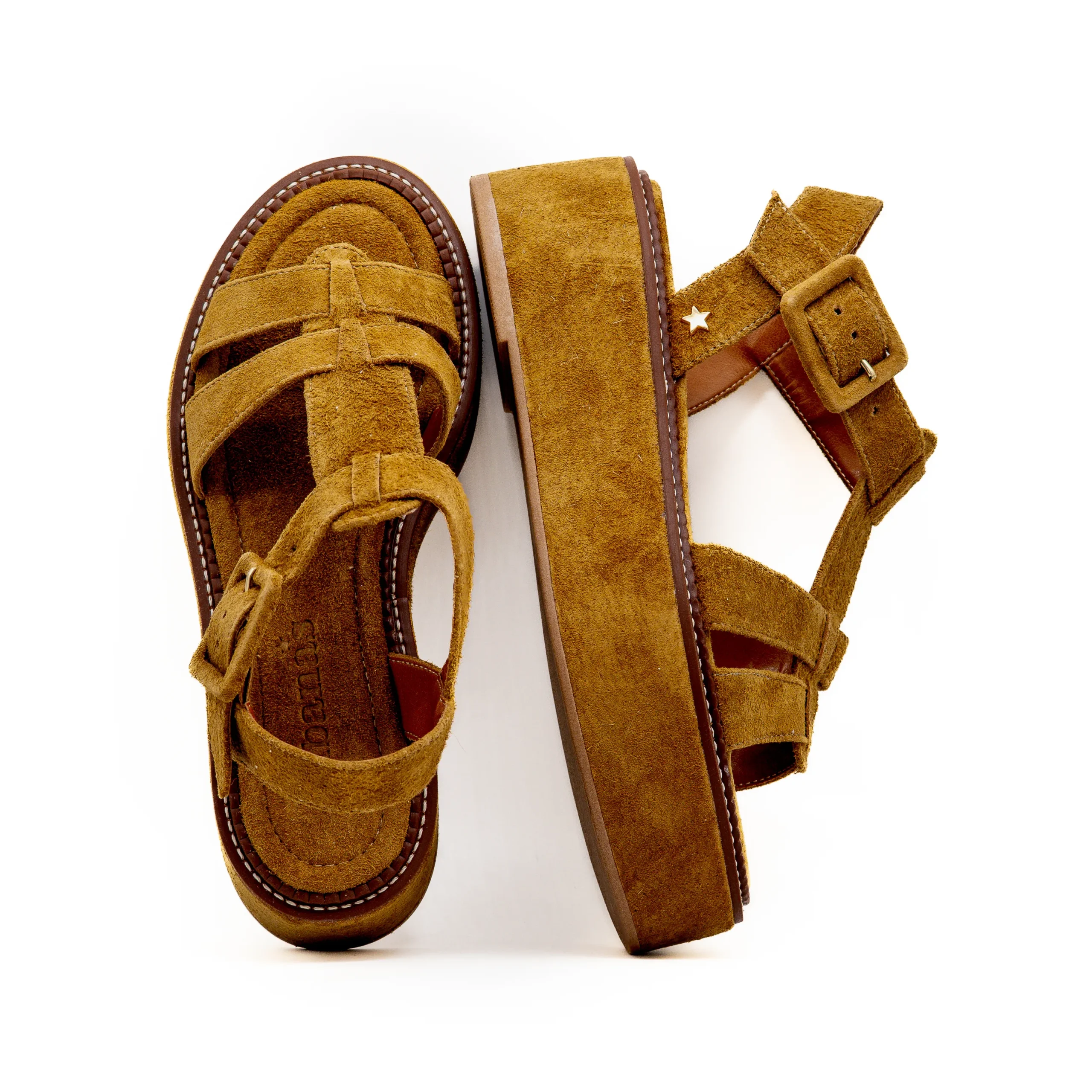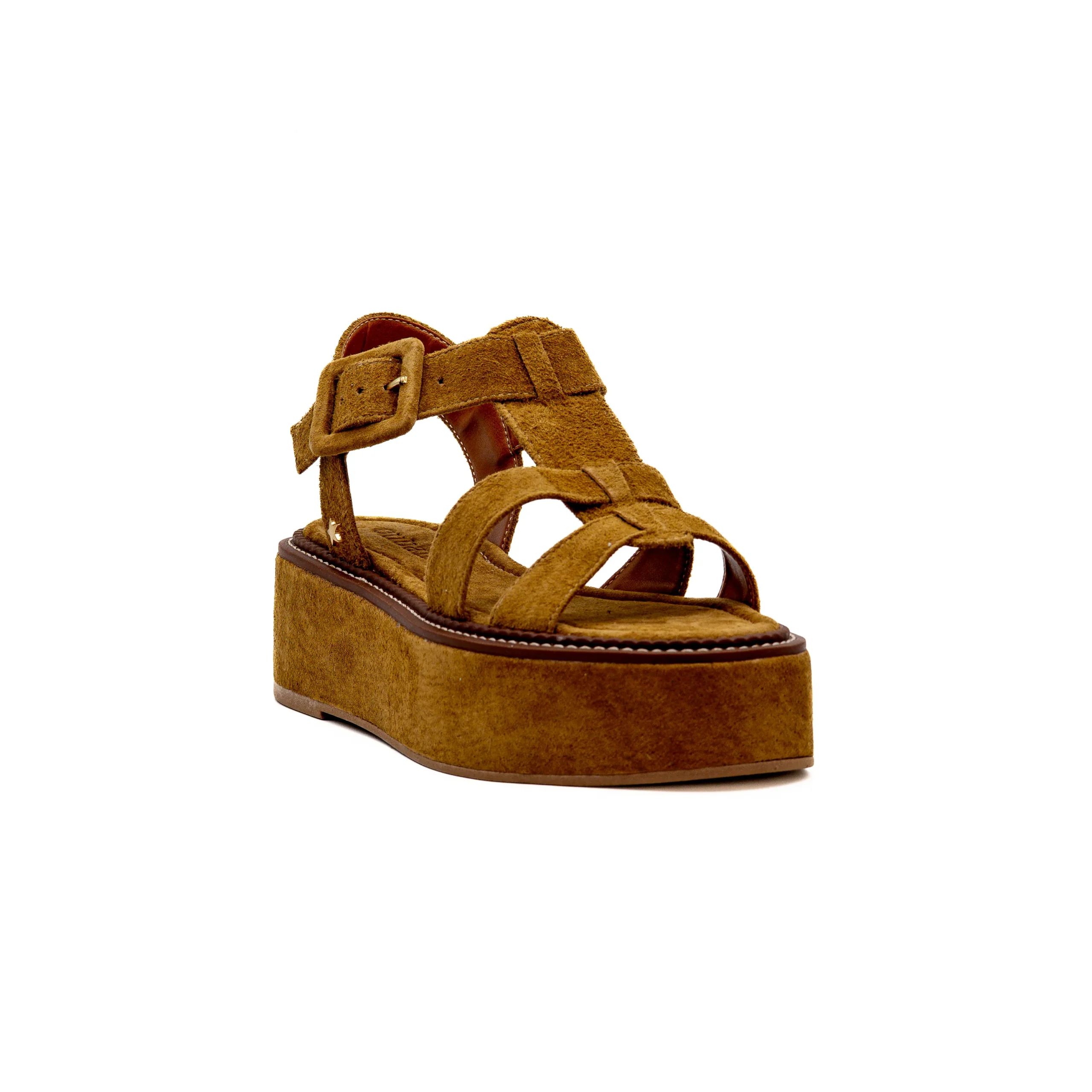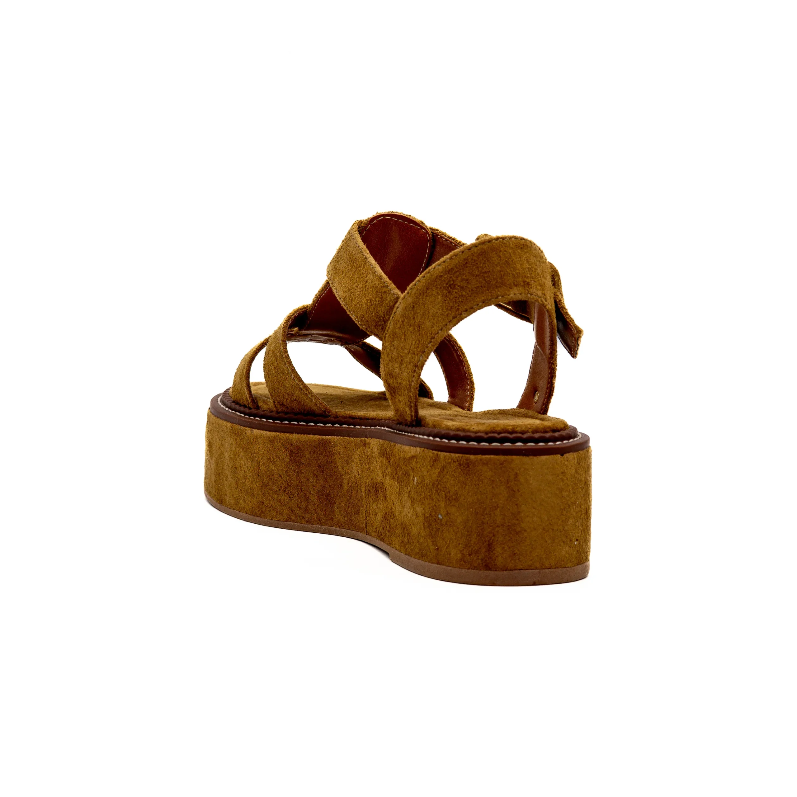 Em camurça castanha com plataforma e tiras elegantes, torna-se um modelo confortável, versátil e fácil de combinar para looks de verão.
