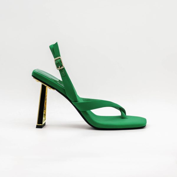 O salto é aberto, estreito, dourado e com um formato ligeiramente afunilado, com cerca de 8 cm de altura que, aliado à inclinação no solado, confere à sandália elegância.