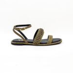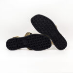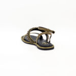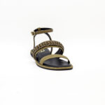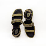 É uma sandália feminina rasa, com salto de 1 cm, de base quadrada, revestida a tecido, na sua maioria, de tom esverdeado, que torna o modelo sóbrio, neutro e fácil de combinar.