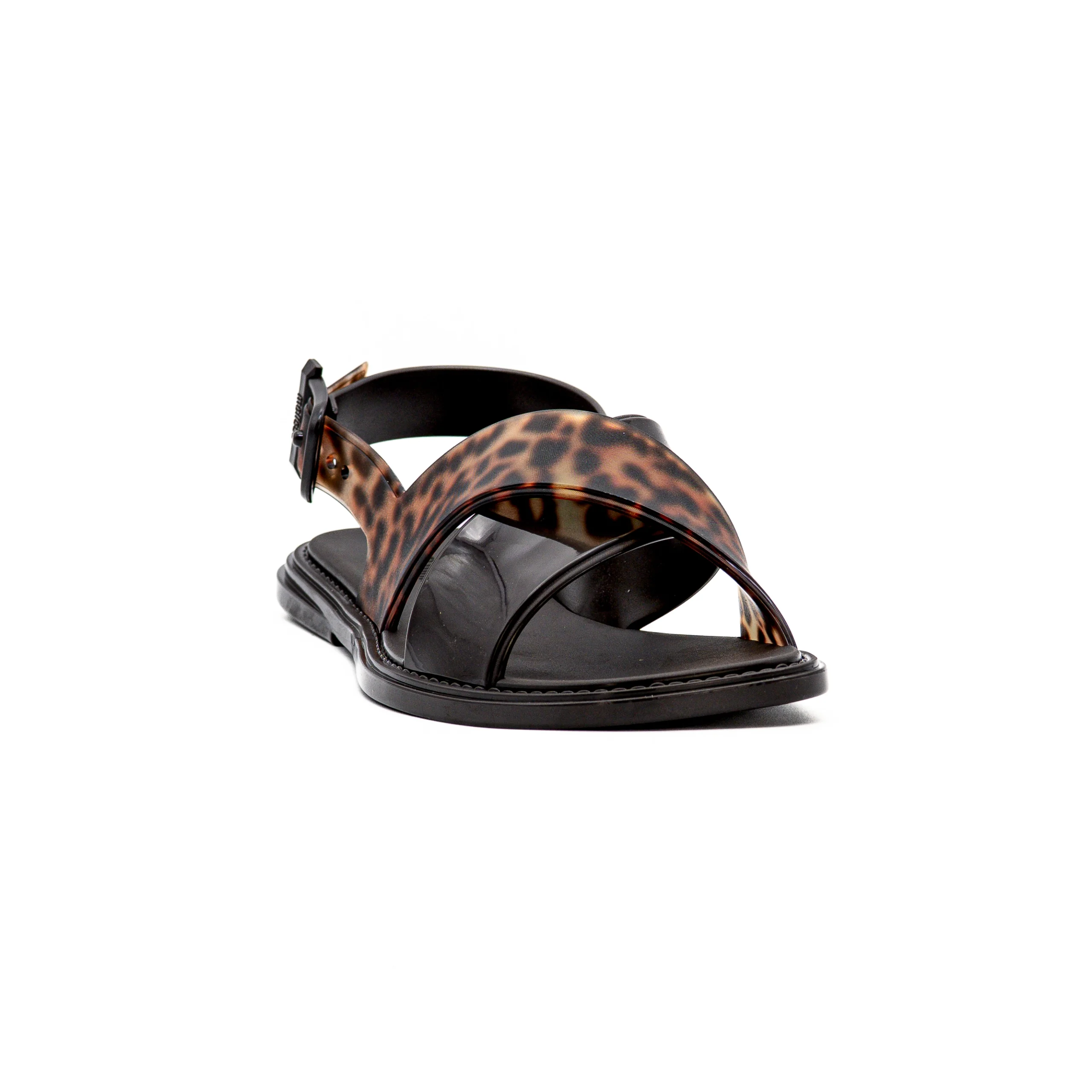 É uma sandália monocromática , leve e aberta na frente, com tiras largas cruzadas.