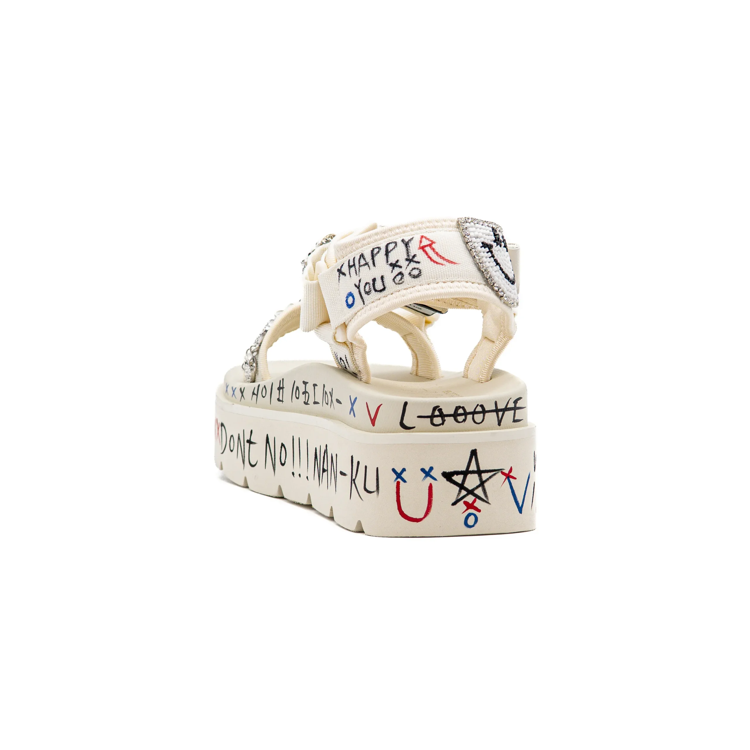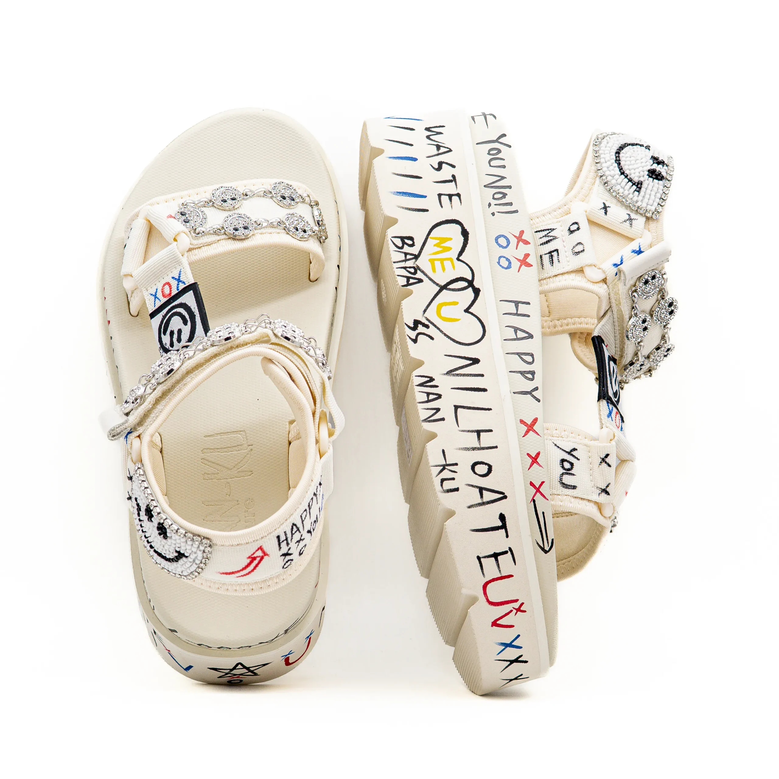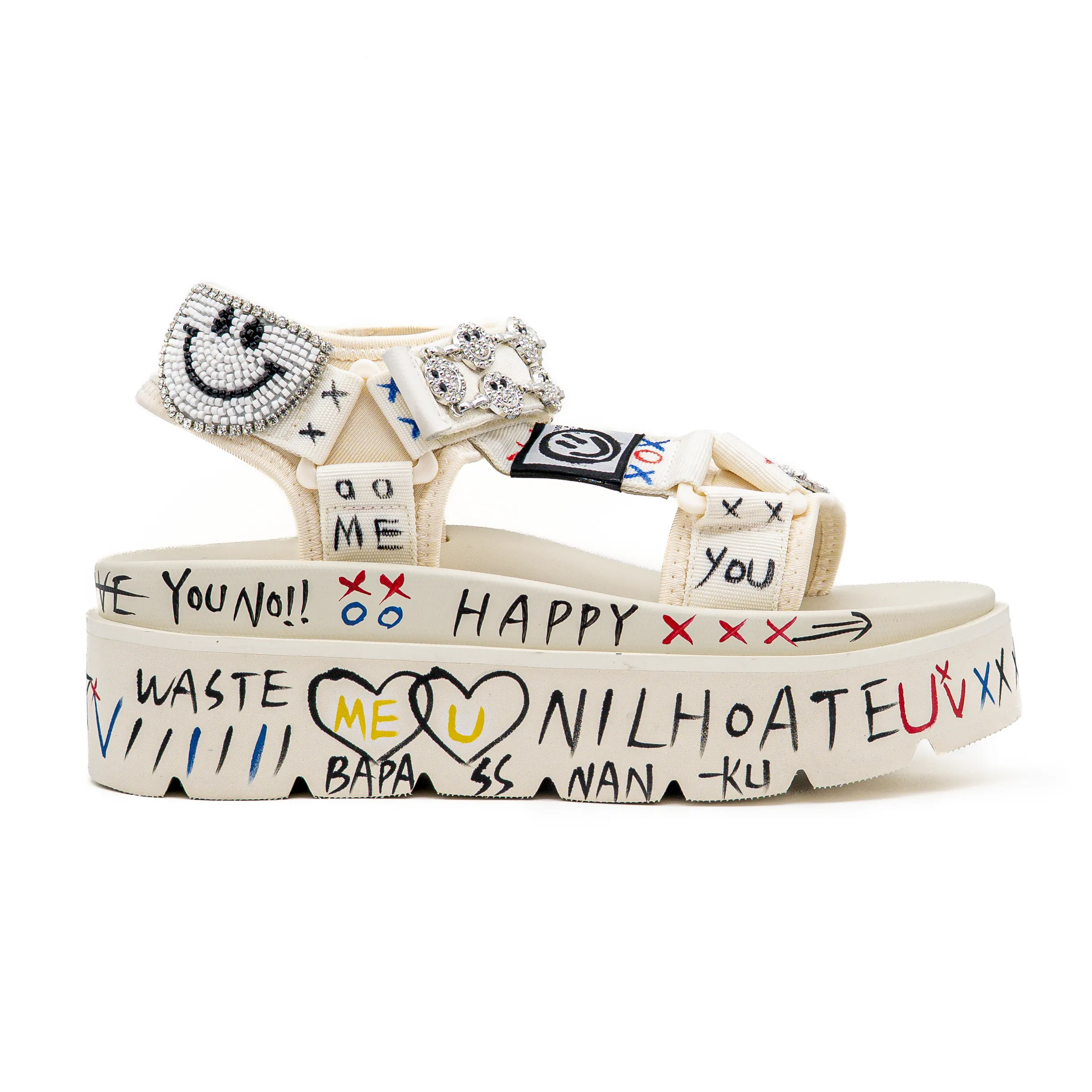 Esta sandália apresenta um estilo urbano e irreverente, combinando detalhes gráficos na sola com aplicações decorativas nas tiras.