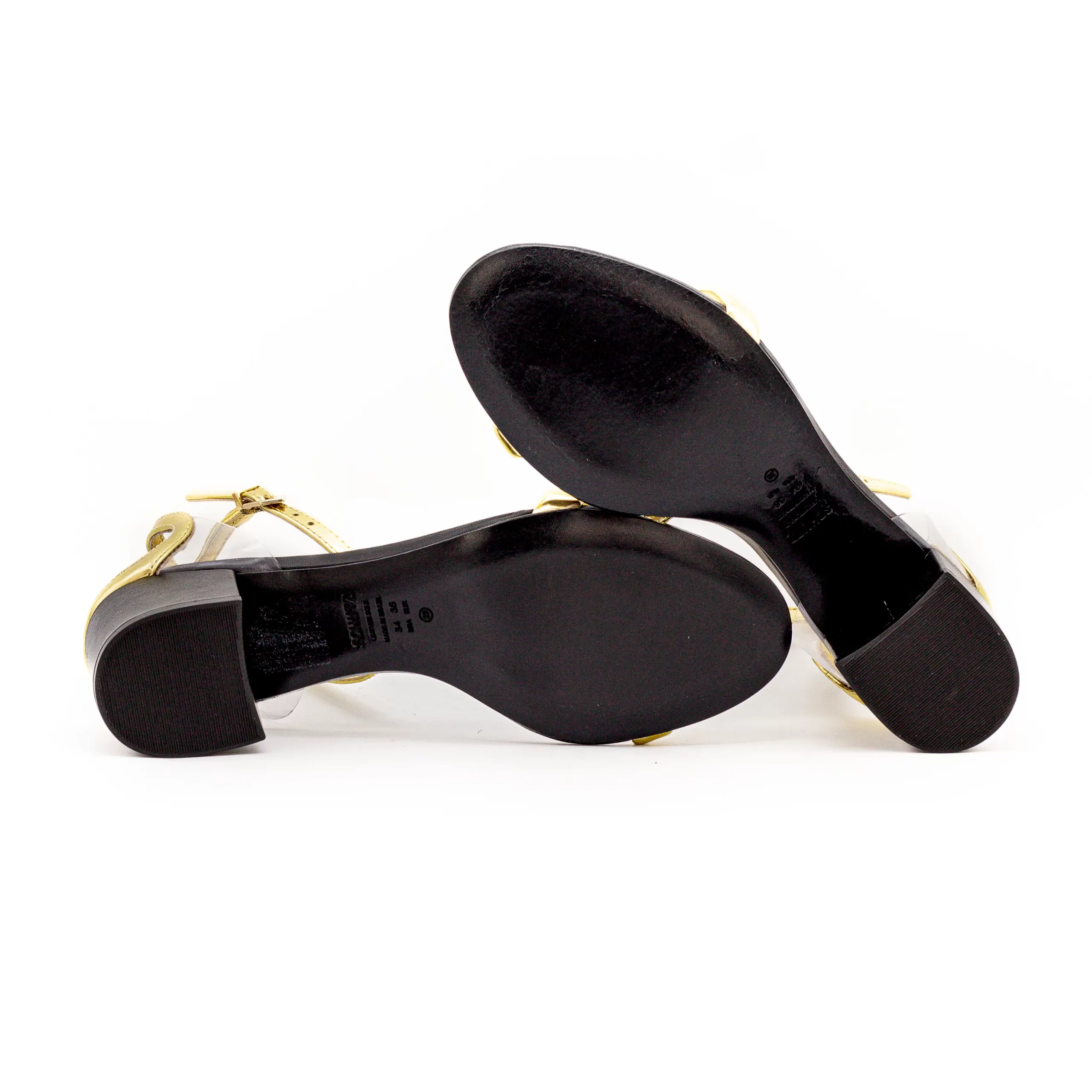 Um salto em bloco e detalhes em dourado destacam esta sandália.