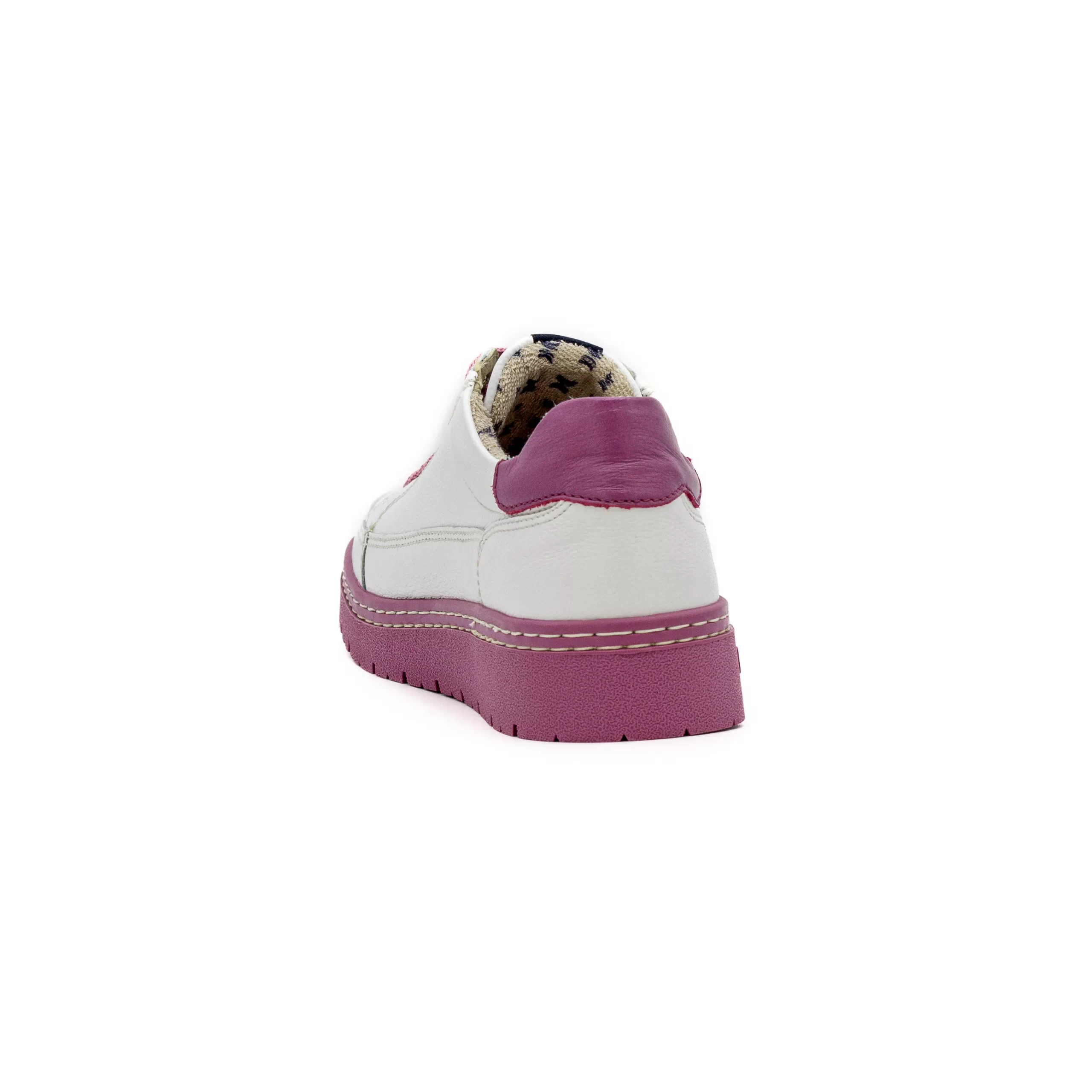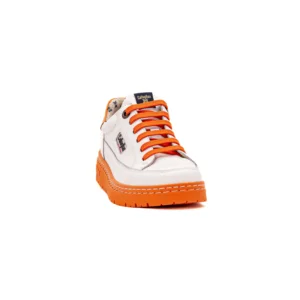 Um modelo feito em pele, com base neutra e cores contrastantes na sola, nos atacadores e no calcanhar.