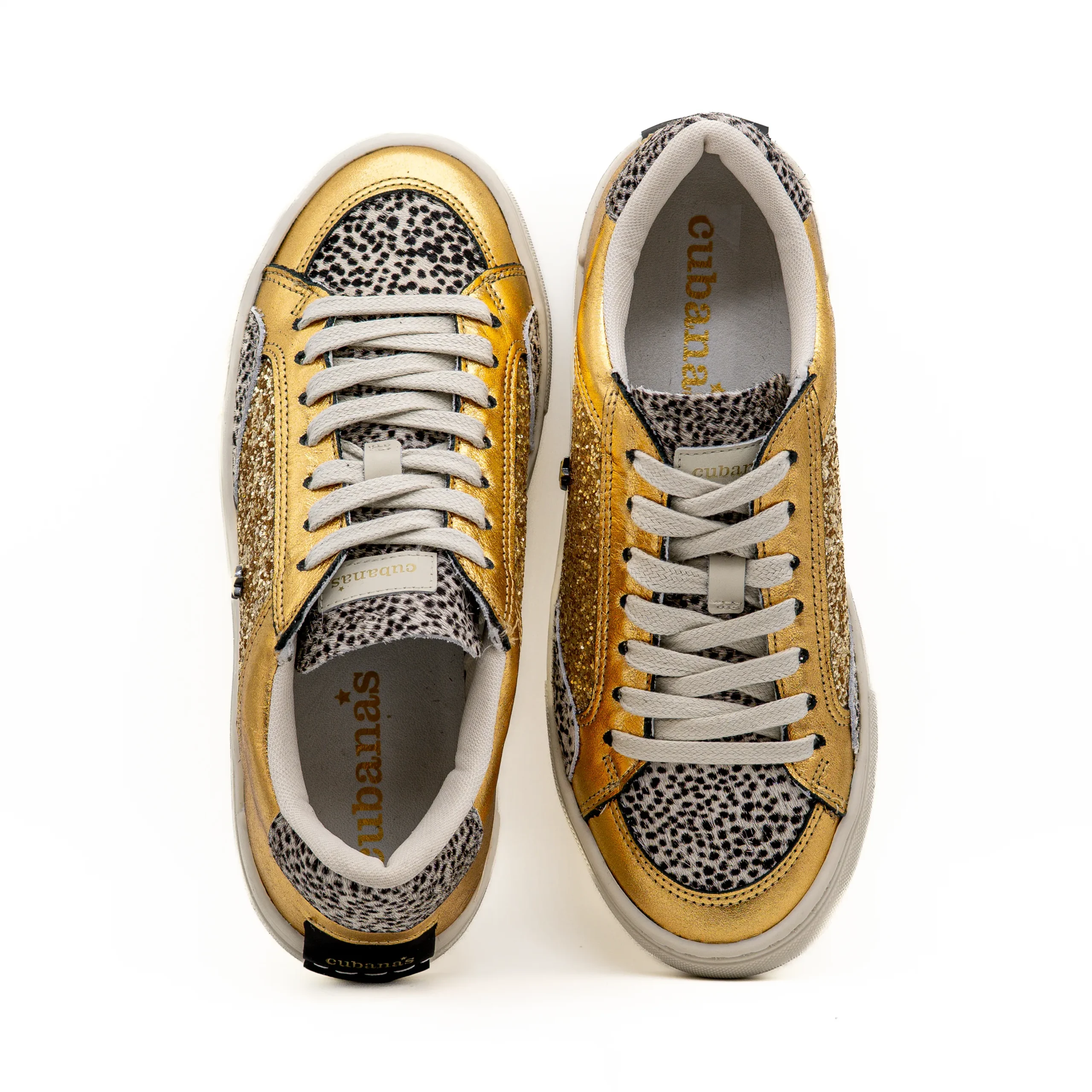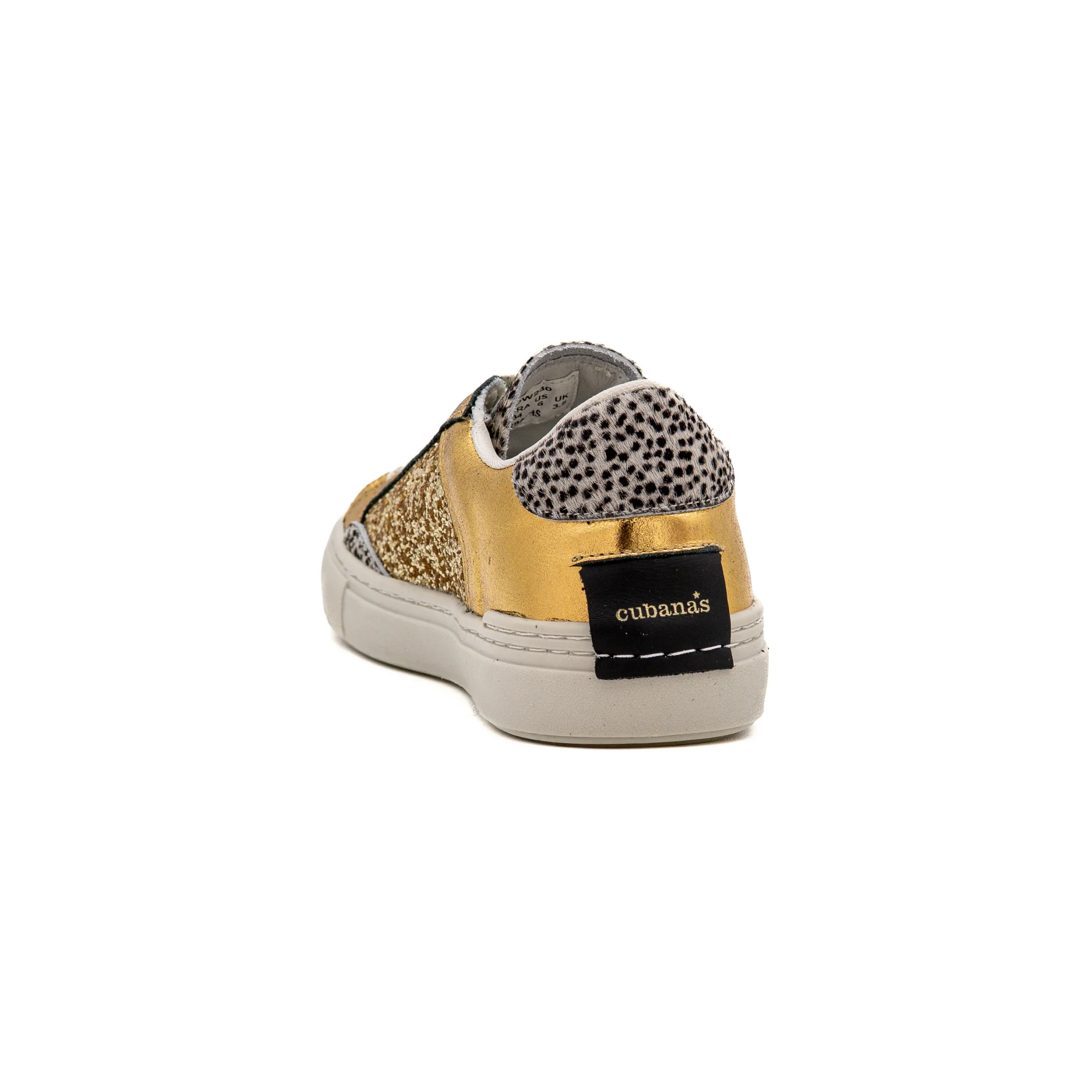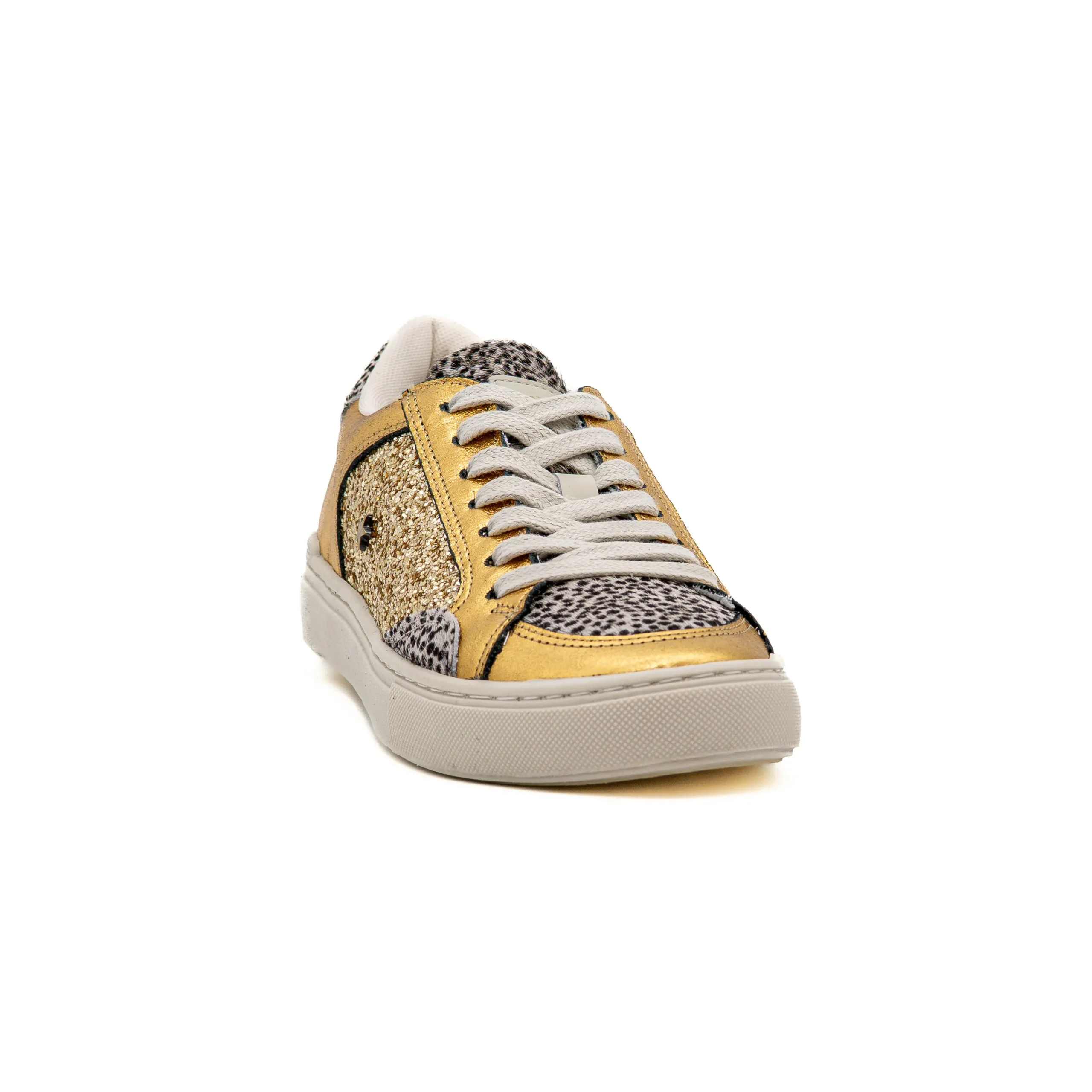 Estes sapatilhas em pele, de cor dourada com detalhes com glitters são o par perfeito para quem procura ousadia sem comprometer conforto.