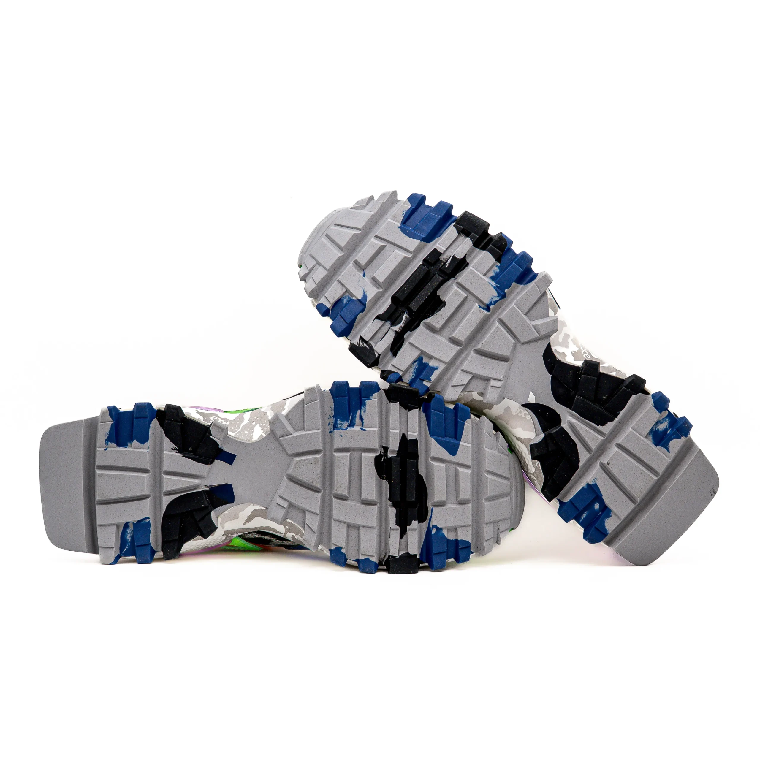 A base da sola, em borracha e cor de contraste, é texturada e dentada e cria, dessa forma, um contacto mais seguro com o solo, prolonga-se até à biqueira e remata de forma saliente no calcanhar da sapatilha, criando uma pequena pala.