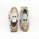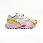 Sapatilha para mulher, da Exé, de tons maioritariamente claros, de base rosa, com detalhes em dourado, que combinam com o material texturado da frente do modelo. É ainda completo por um reforço, na lateral, com pormenores prateados. É revestido a brilhantes, em grande parte do exterior e tem, na lateral, a inscrição da marca, num detalhe em plástico.