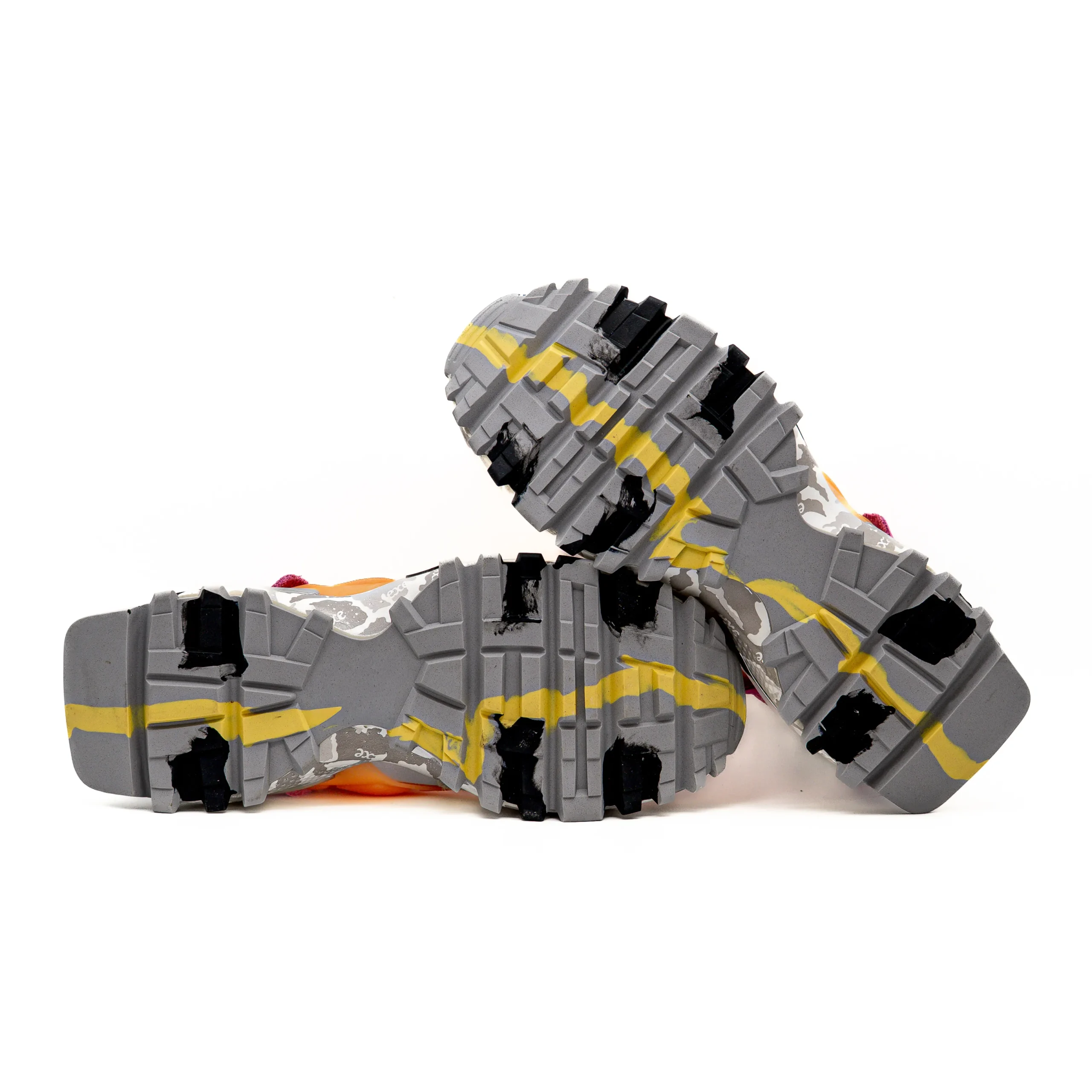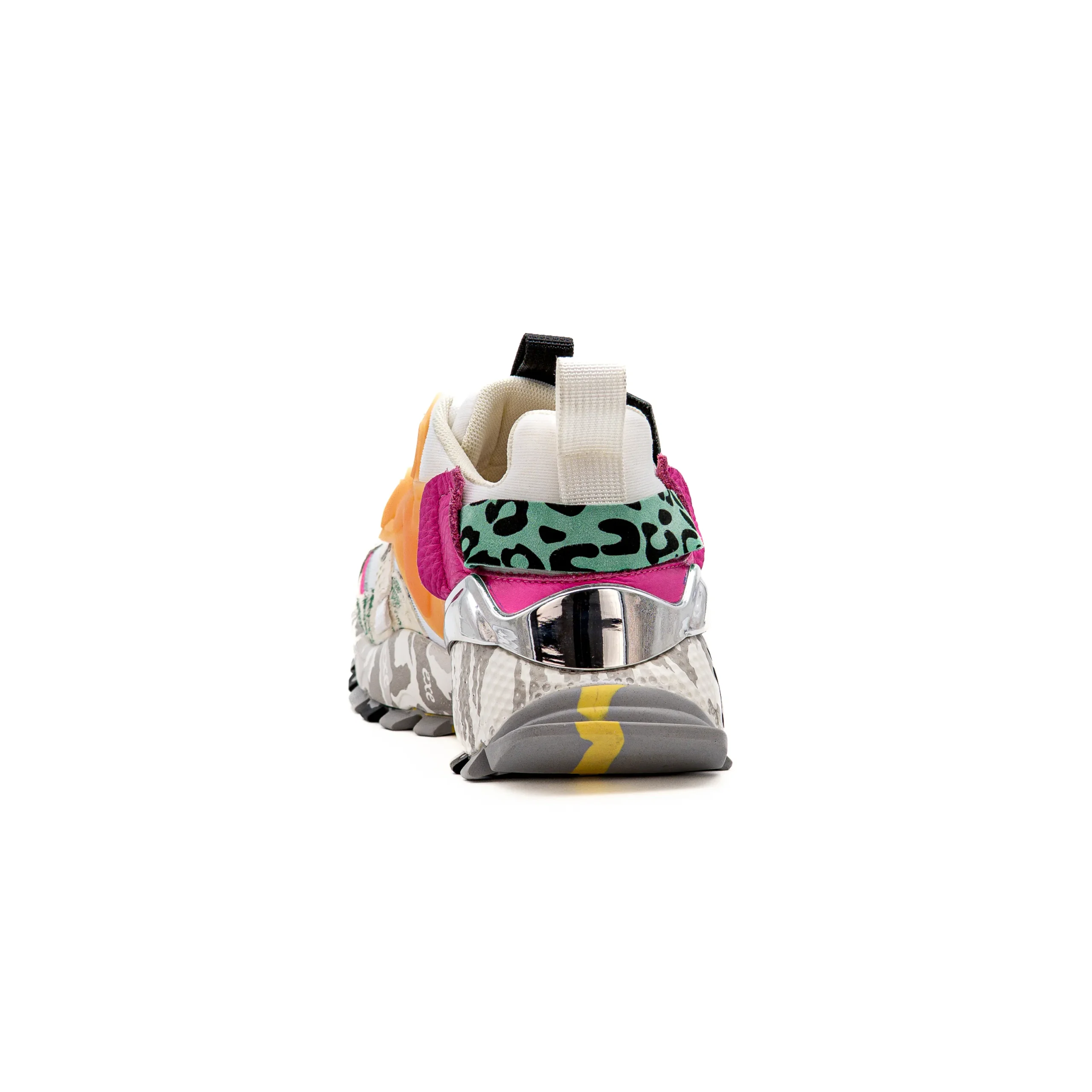 Estas sapatilhas apresentam um visual vibrante com um mix colorido que combina cor de laranja, tons pastel e detalhes de cor contraste, criando um estilo único e cheio de personalidade.