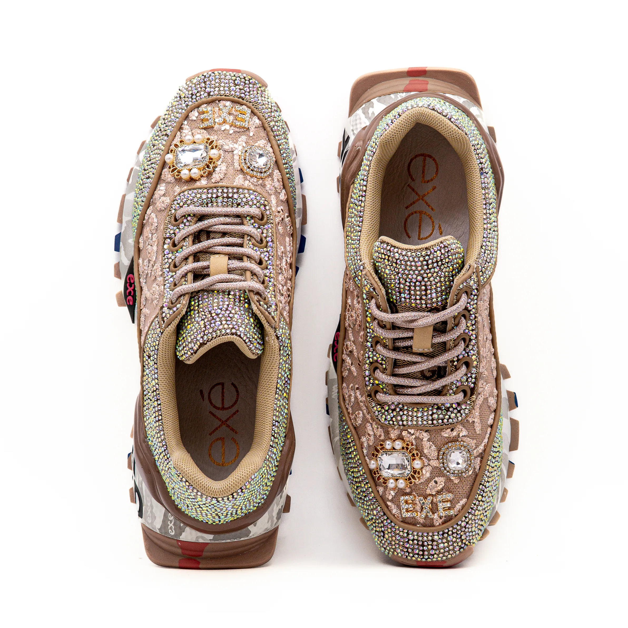 Estas sapatilhas em cor taupe destacam-se pelo design sofisticado e pelos detalhes texturados e brilhantes que elevam qualquer look do dia a dia.