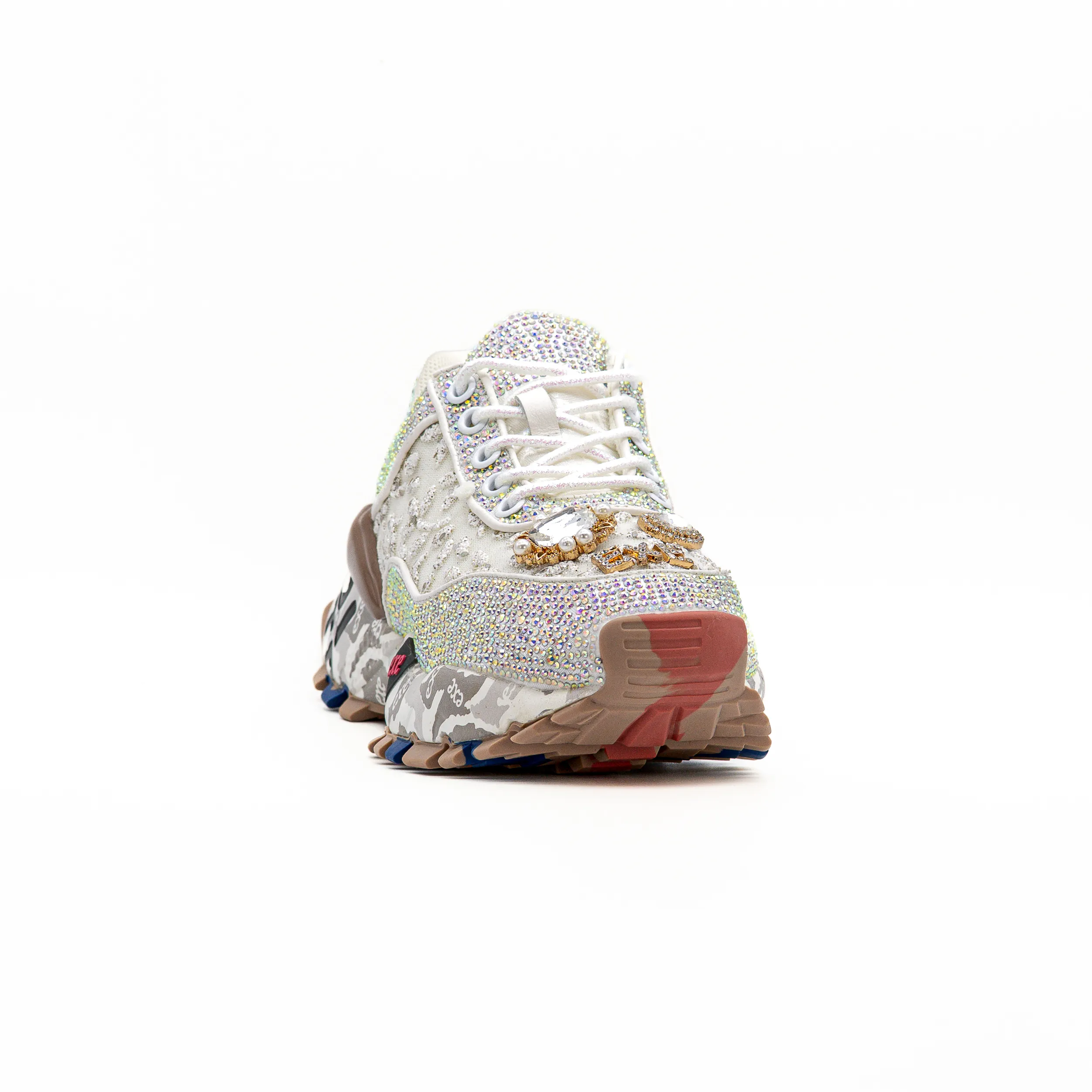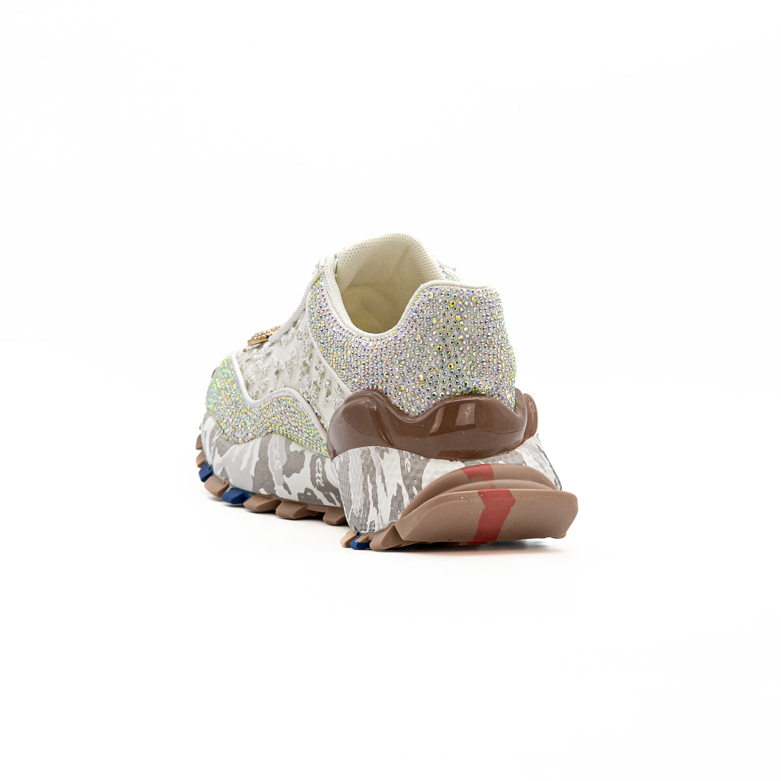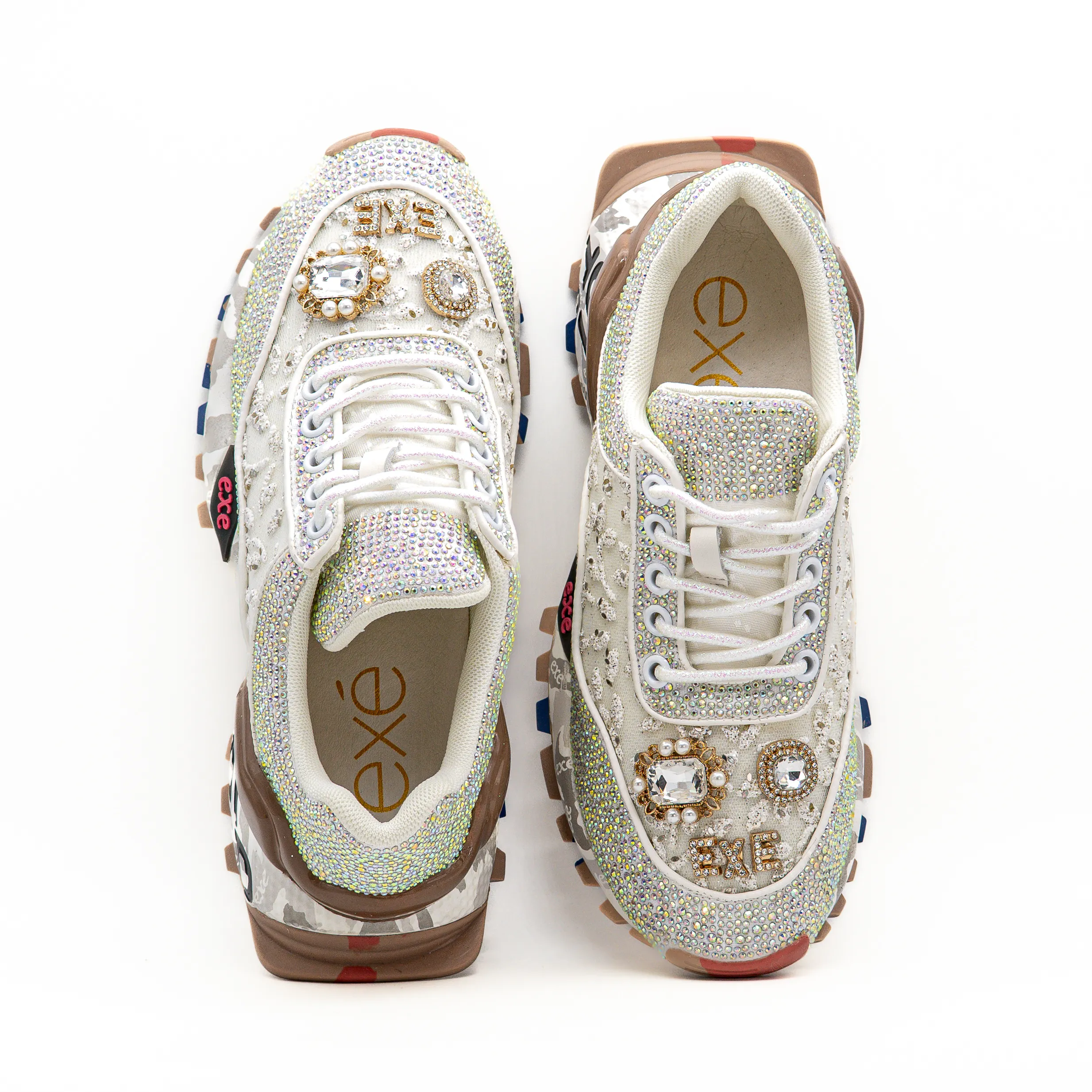 Estas sapatilhas em branco destacam-se pelo design sofisticado e pelos detalhes texturados e brilhantes que elevam qualquer look do dia a dia.