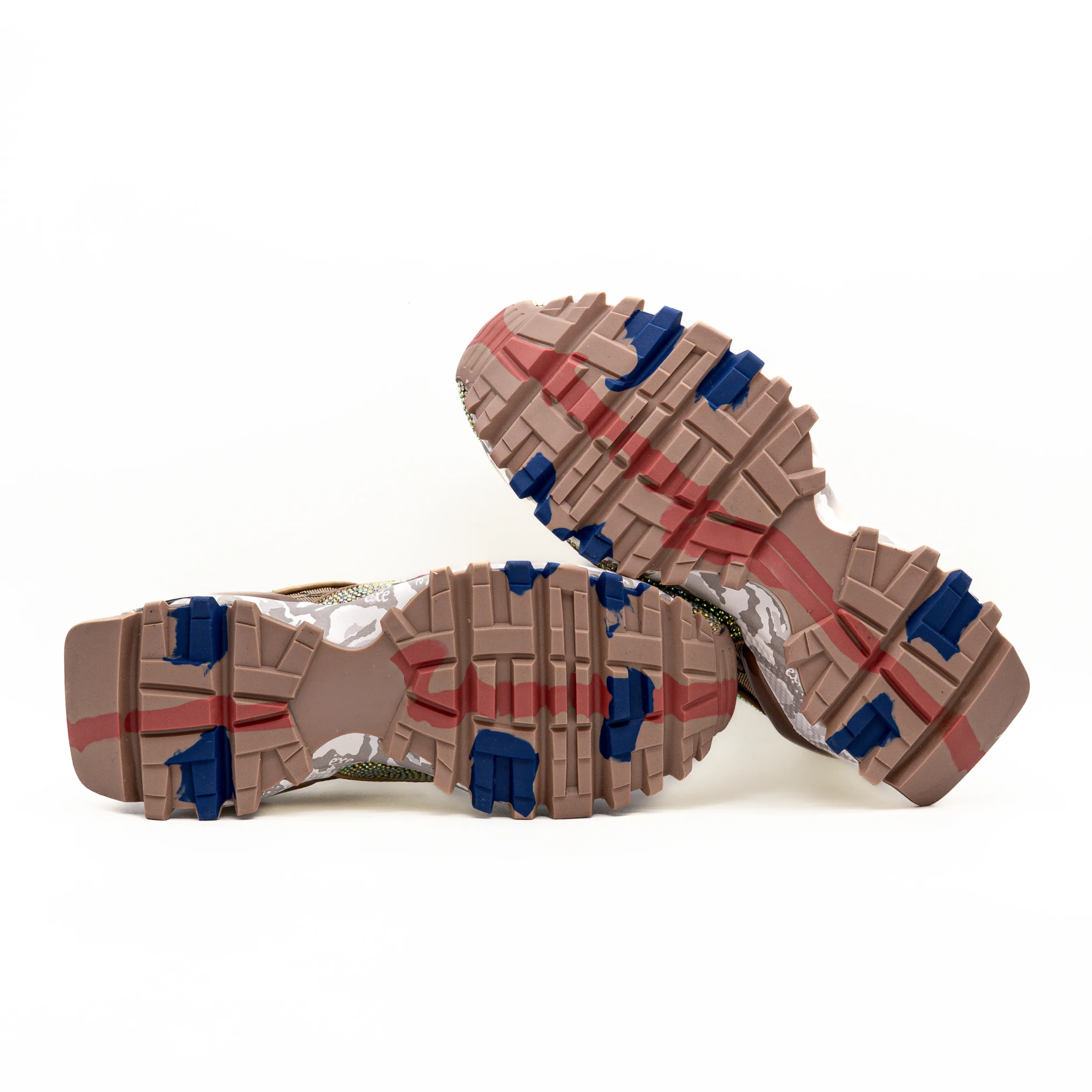 A base da sola, em borracha e cor de contraste, é texturada e dentada e cria, dessa forma, um contacto mais seguro com o solo, prolonga-se até à biqueira e remata de forma saliente no calcanhar da sapatilha, criando uma pequena pala.