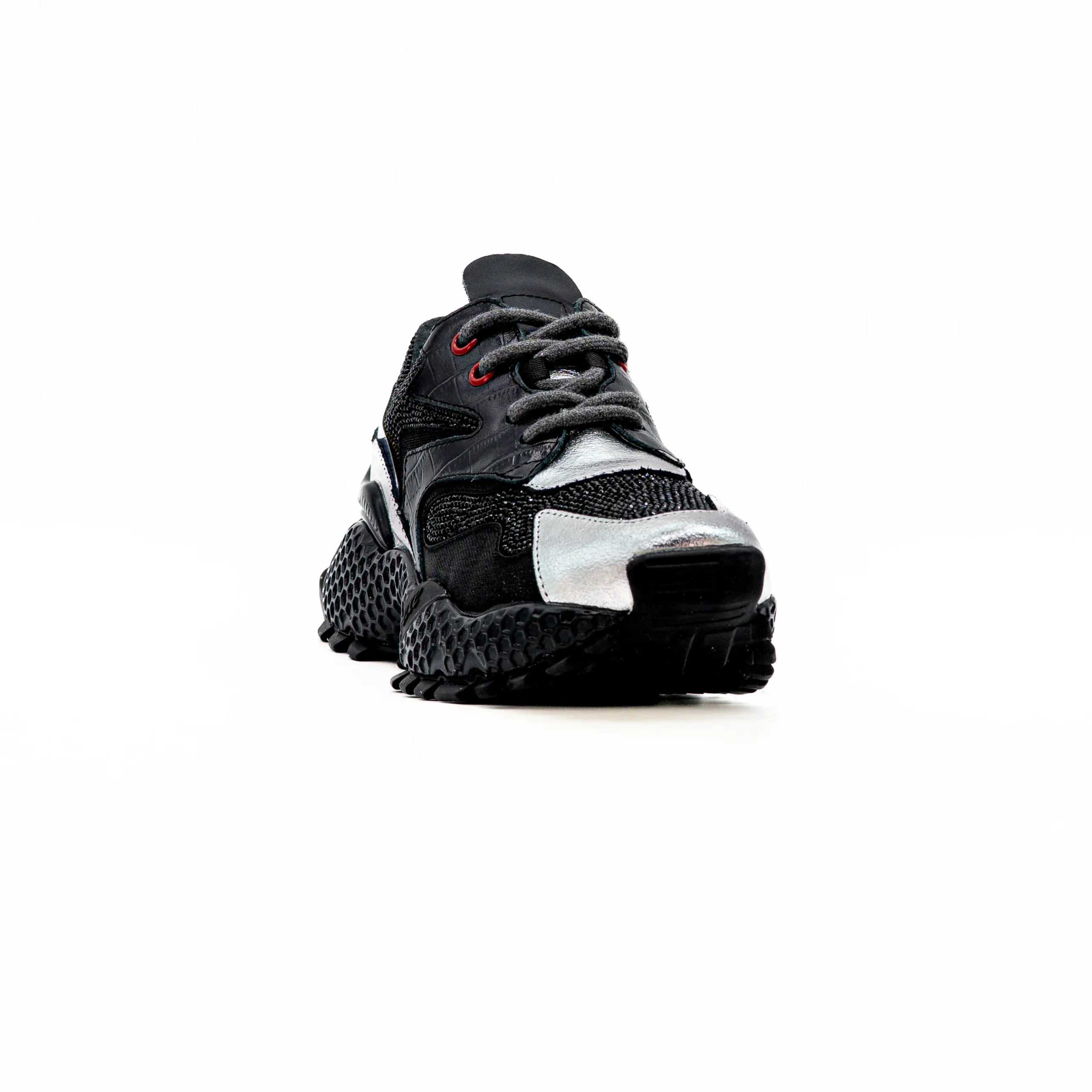 Sapatilha para mulher de tons escuros, revestida a brilhantes, em grande parte do exterior.