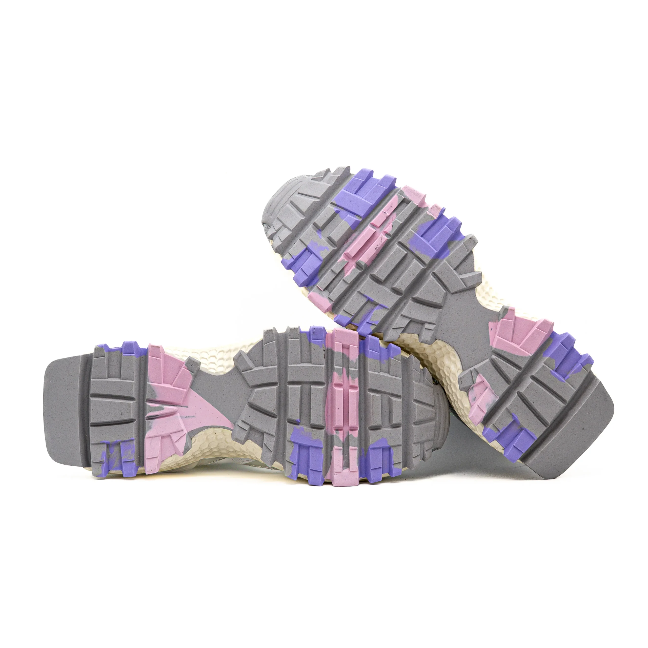 - A base da sola, em borracha em cor de contraste, é texturada e dentada;