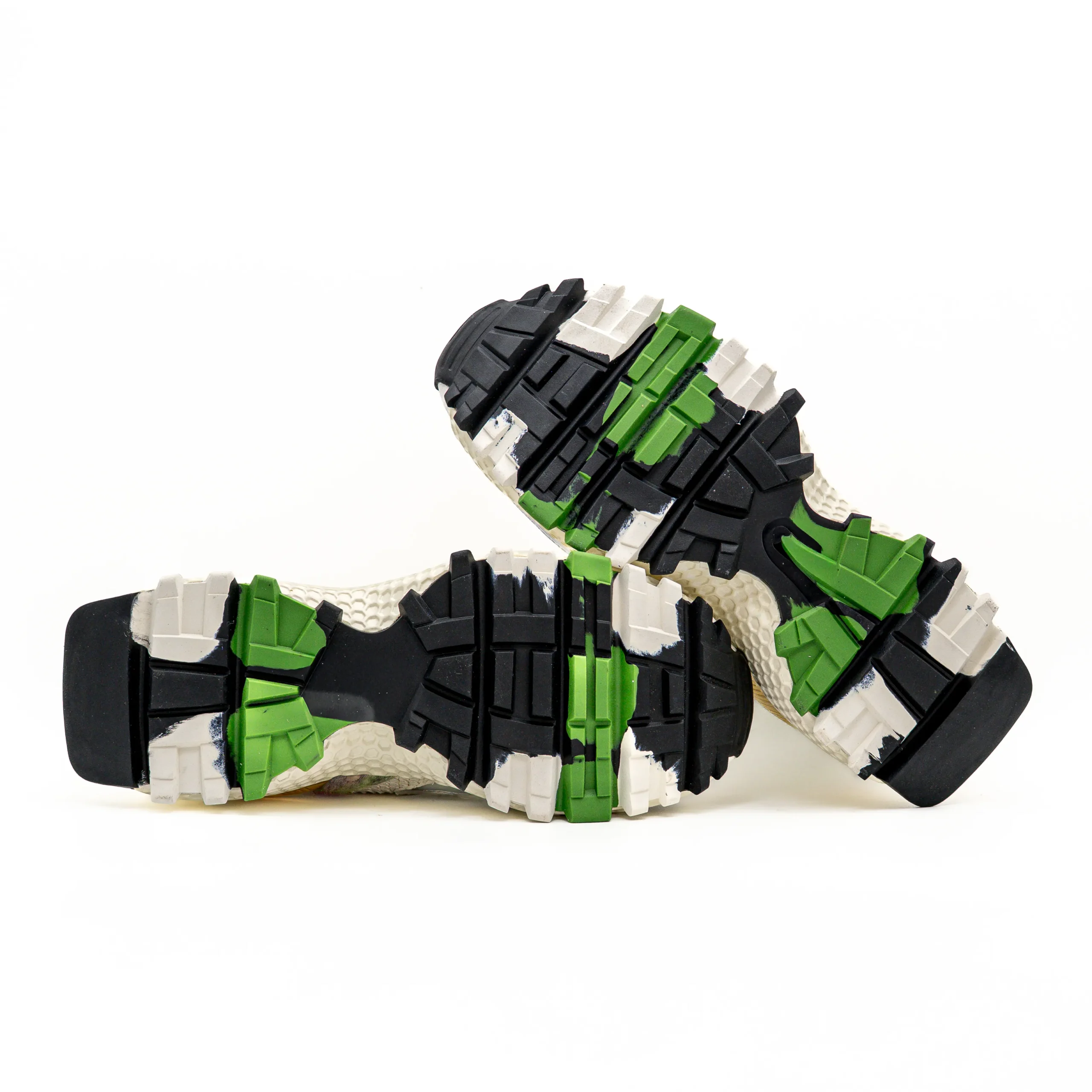 - A base da sola, em borracha em cor de contraste, é texturada e dentada;