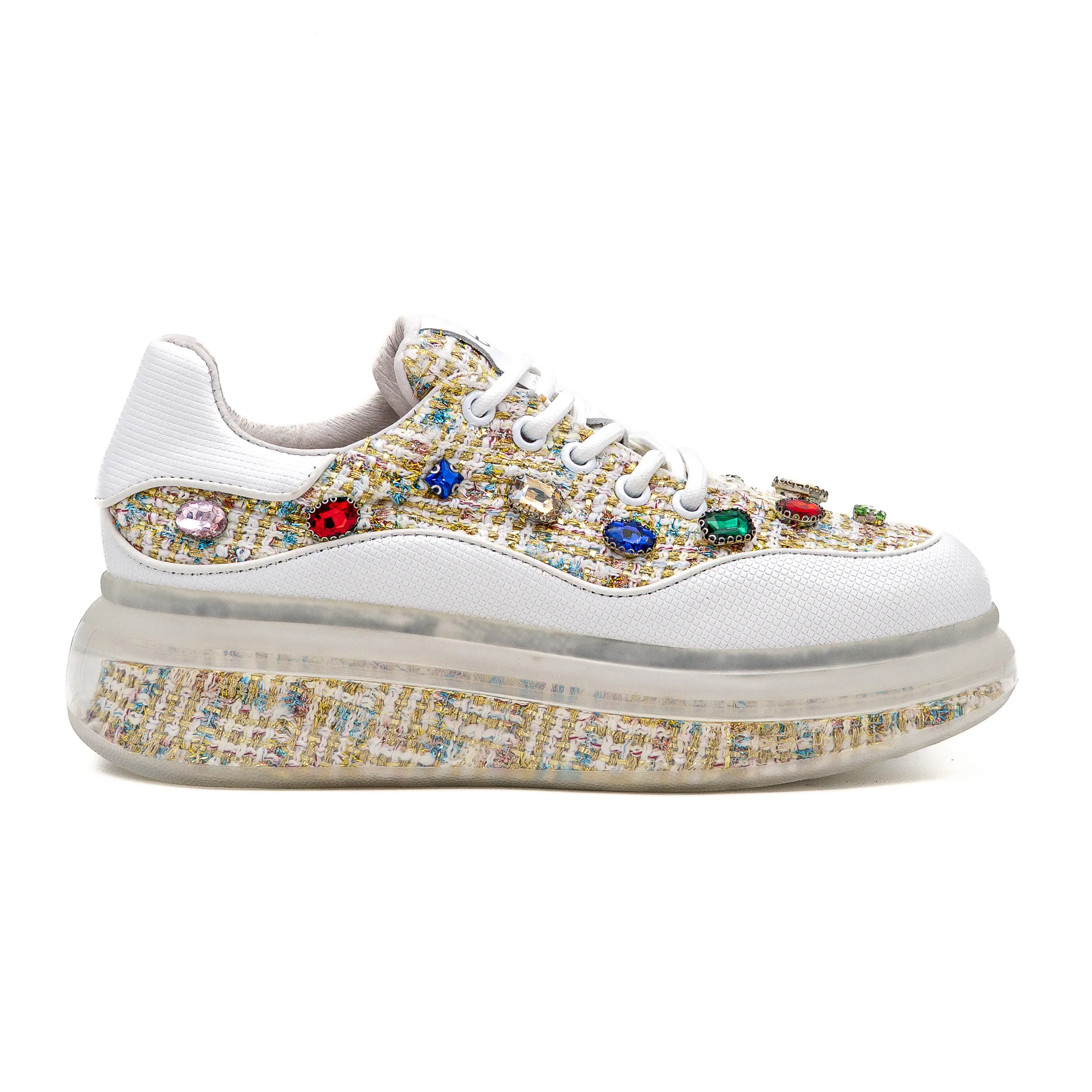 Estas sapatilhas destacam-se pelo design sofisticado e pelo mix de cores neutras com detalhes coloridos que tornam qualquer look mais marcante.