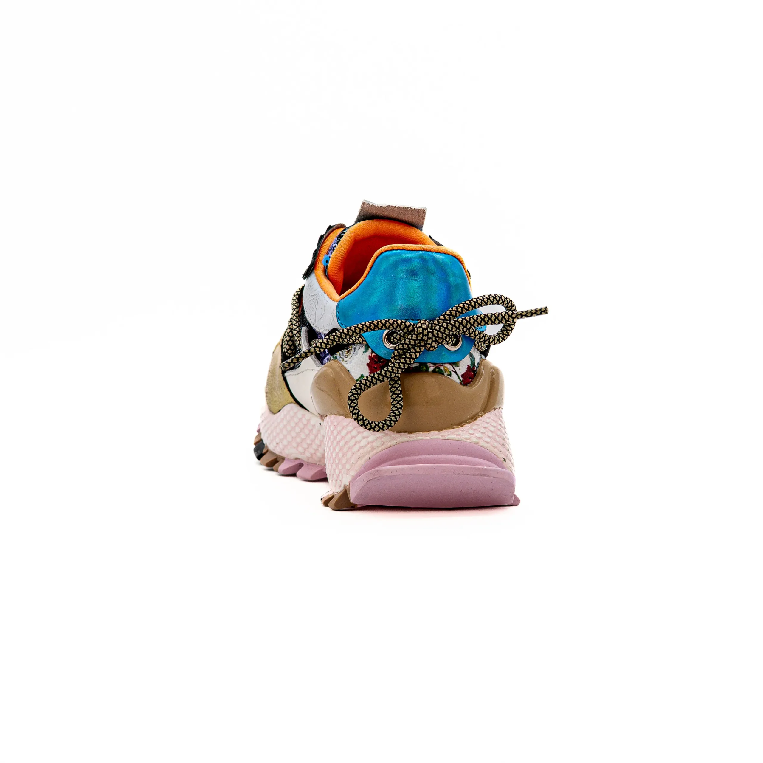 Este modelo oferece uma ousada mistura de materiais e cores, com destaque para o cor de laranja.